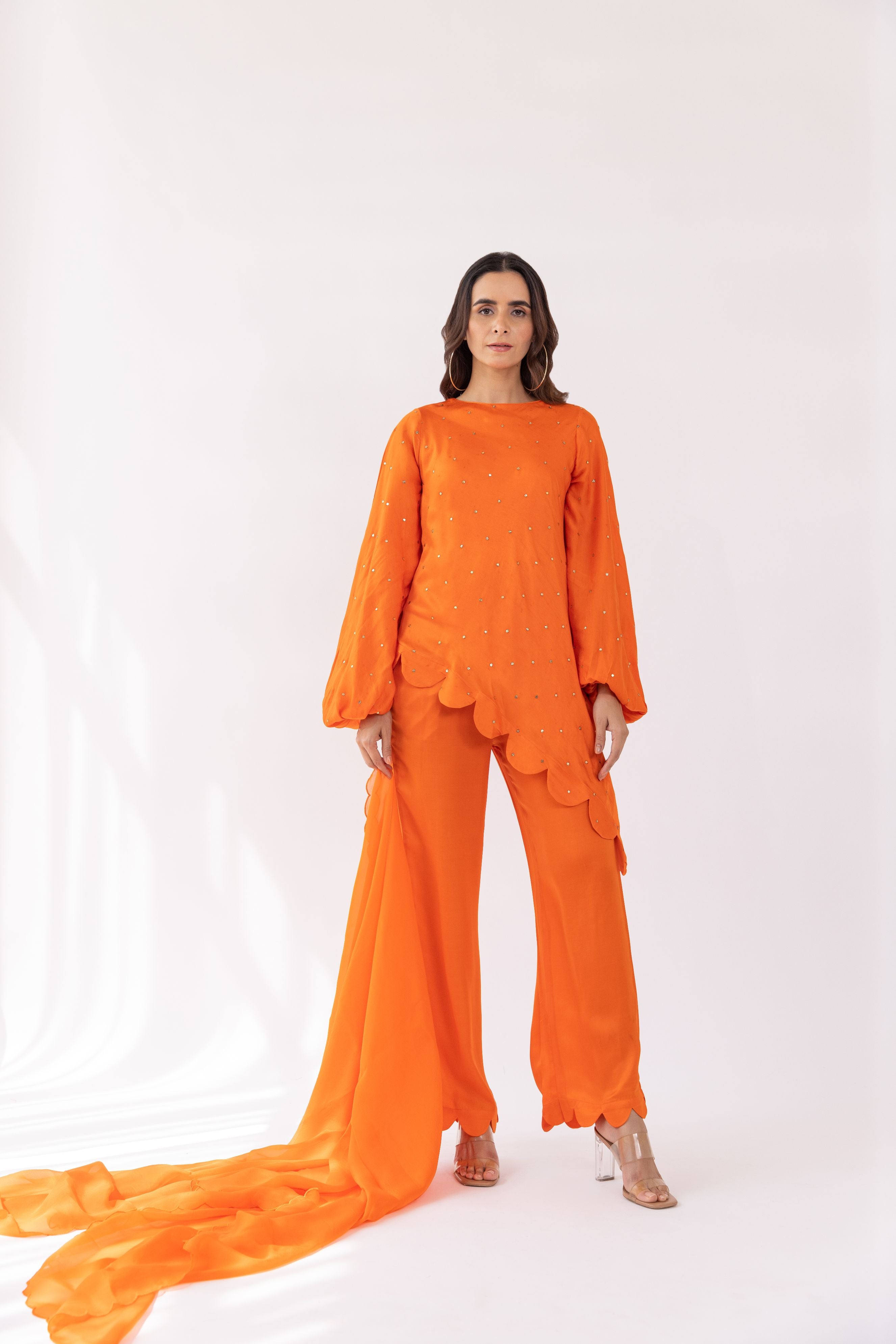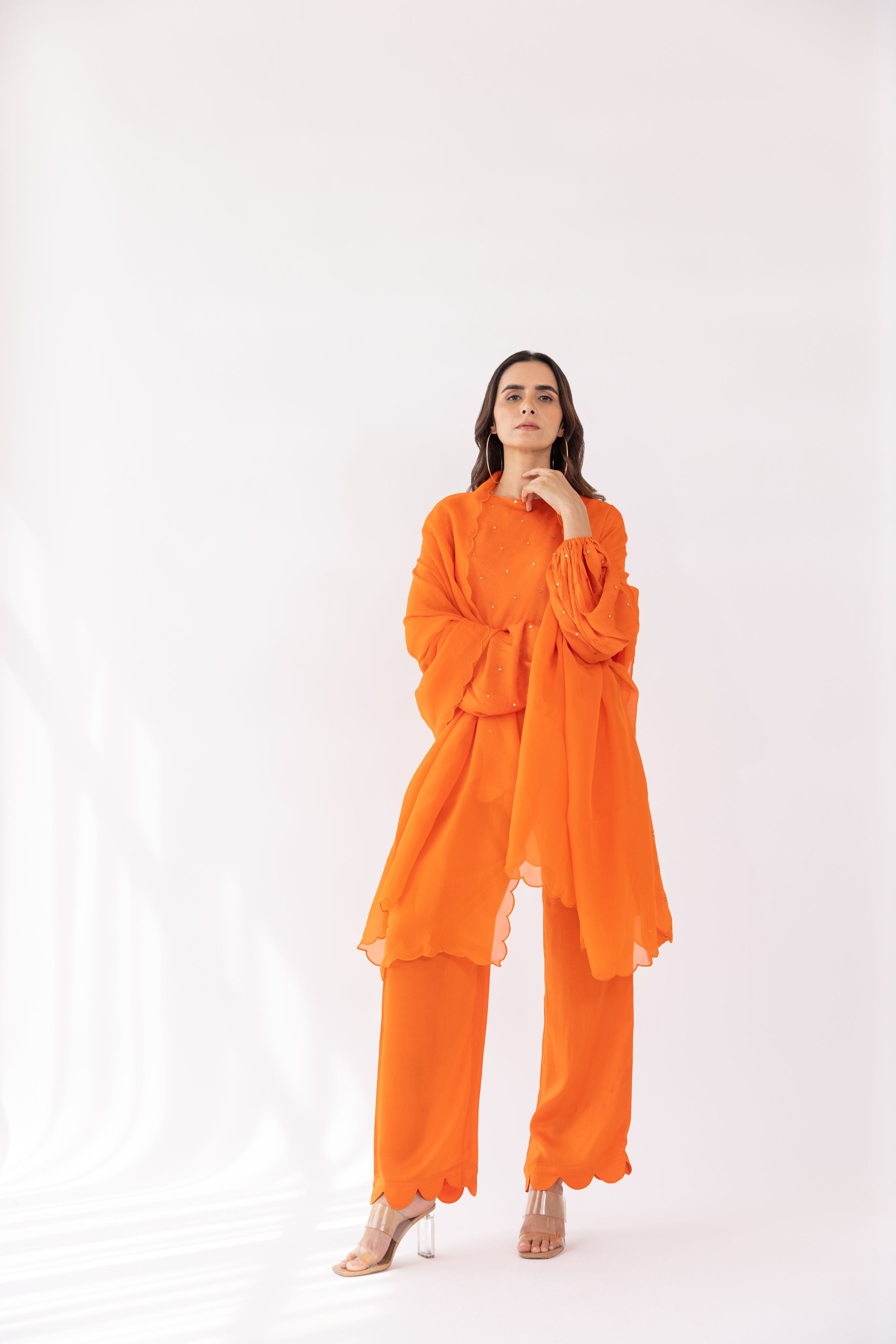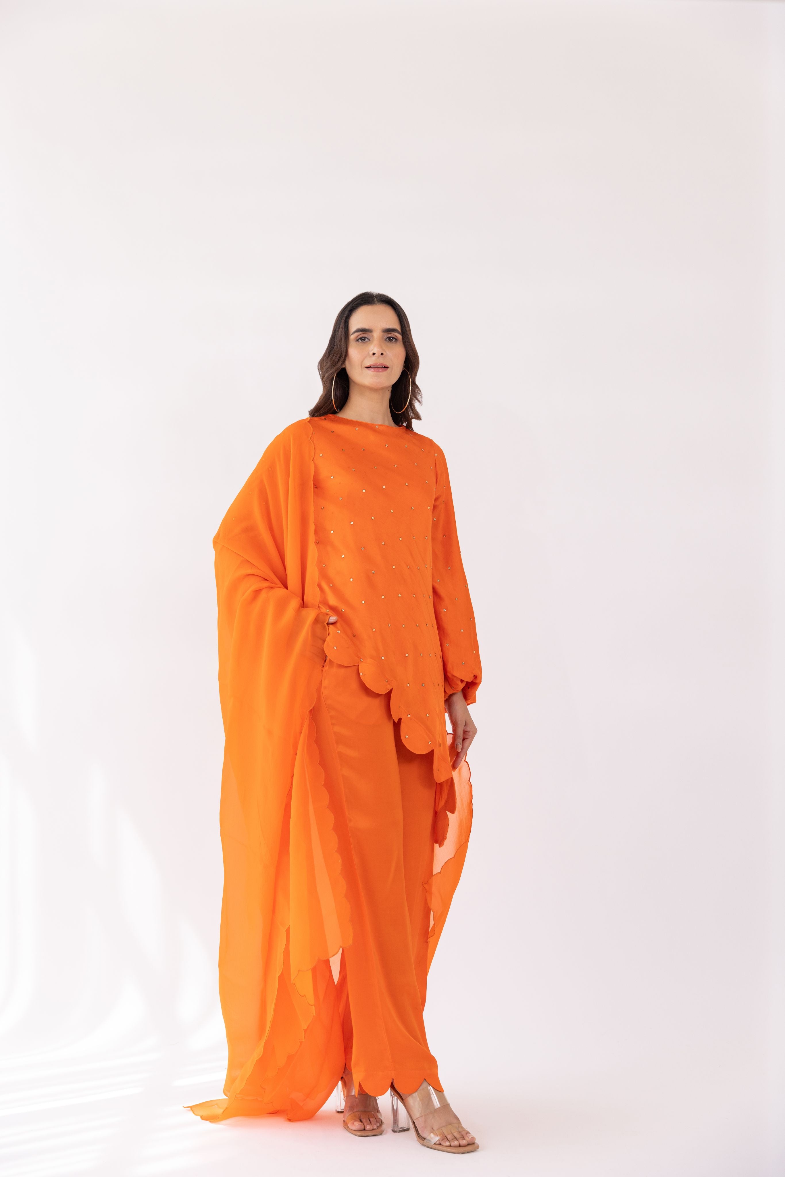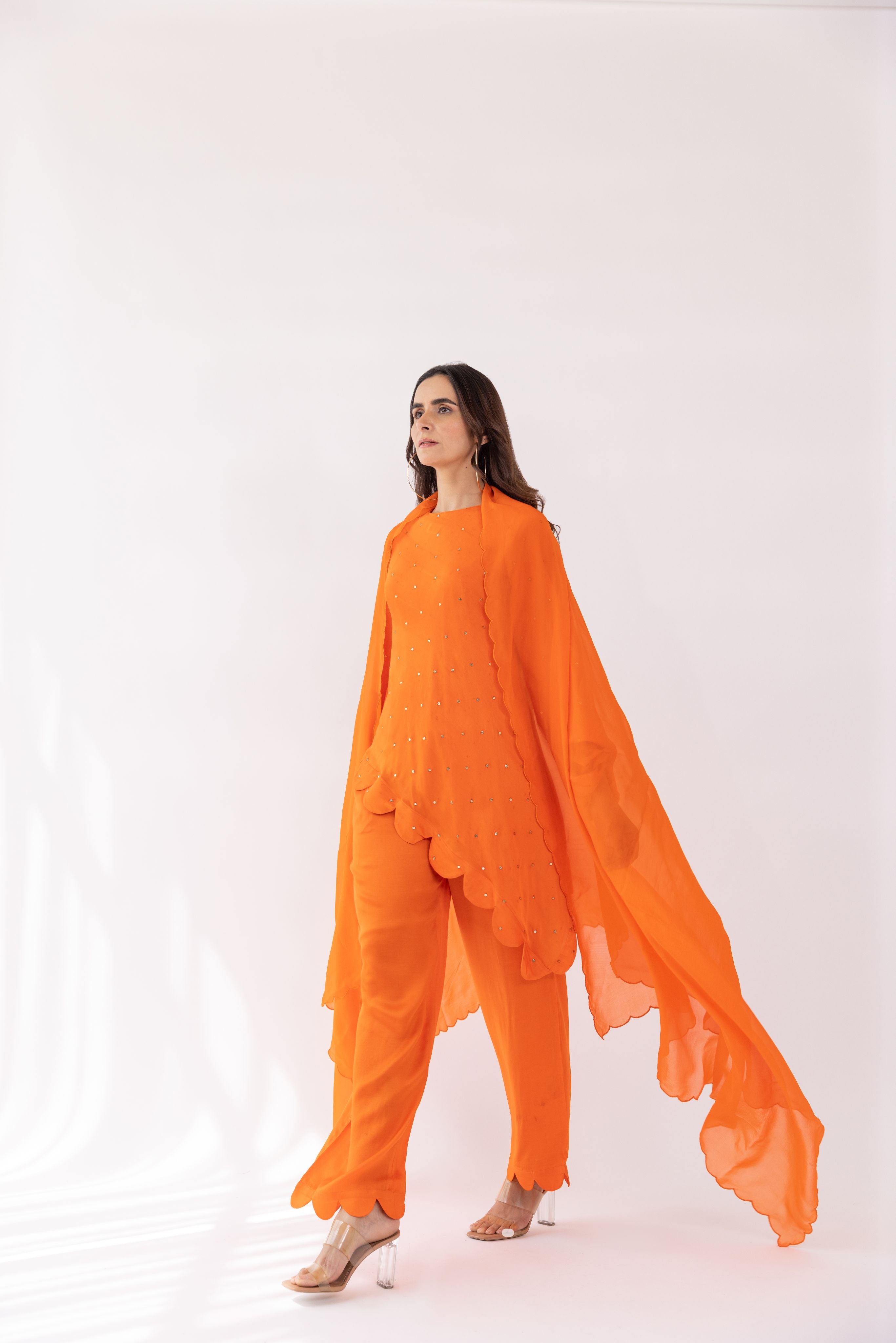 Featuring a boat neck kurta set in lurex satin blend base detailed with a scalloped edge. It is paired with matching pants and scalloped oragnza dupatta