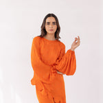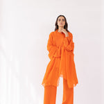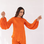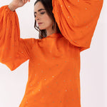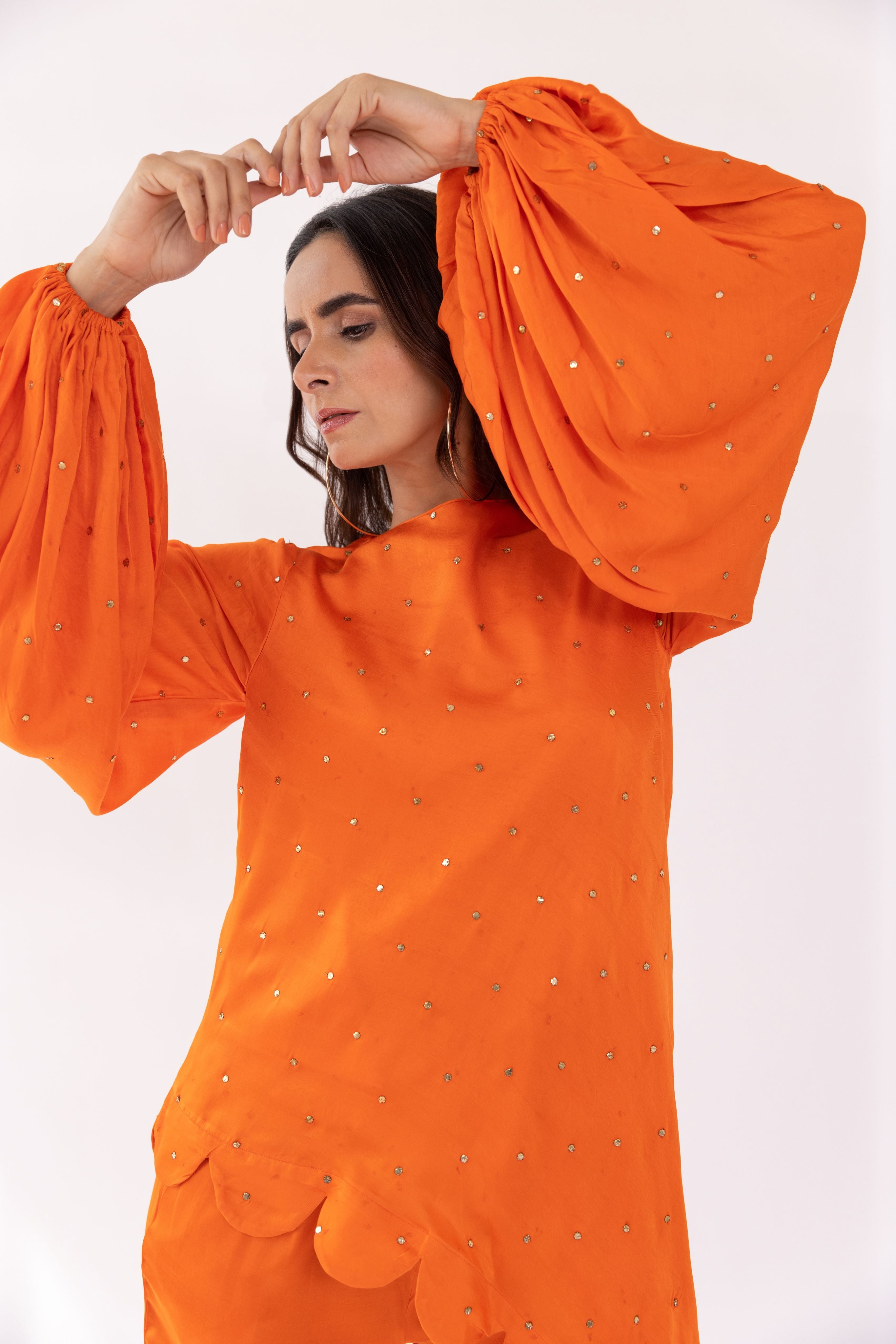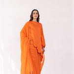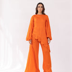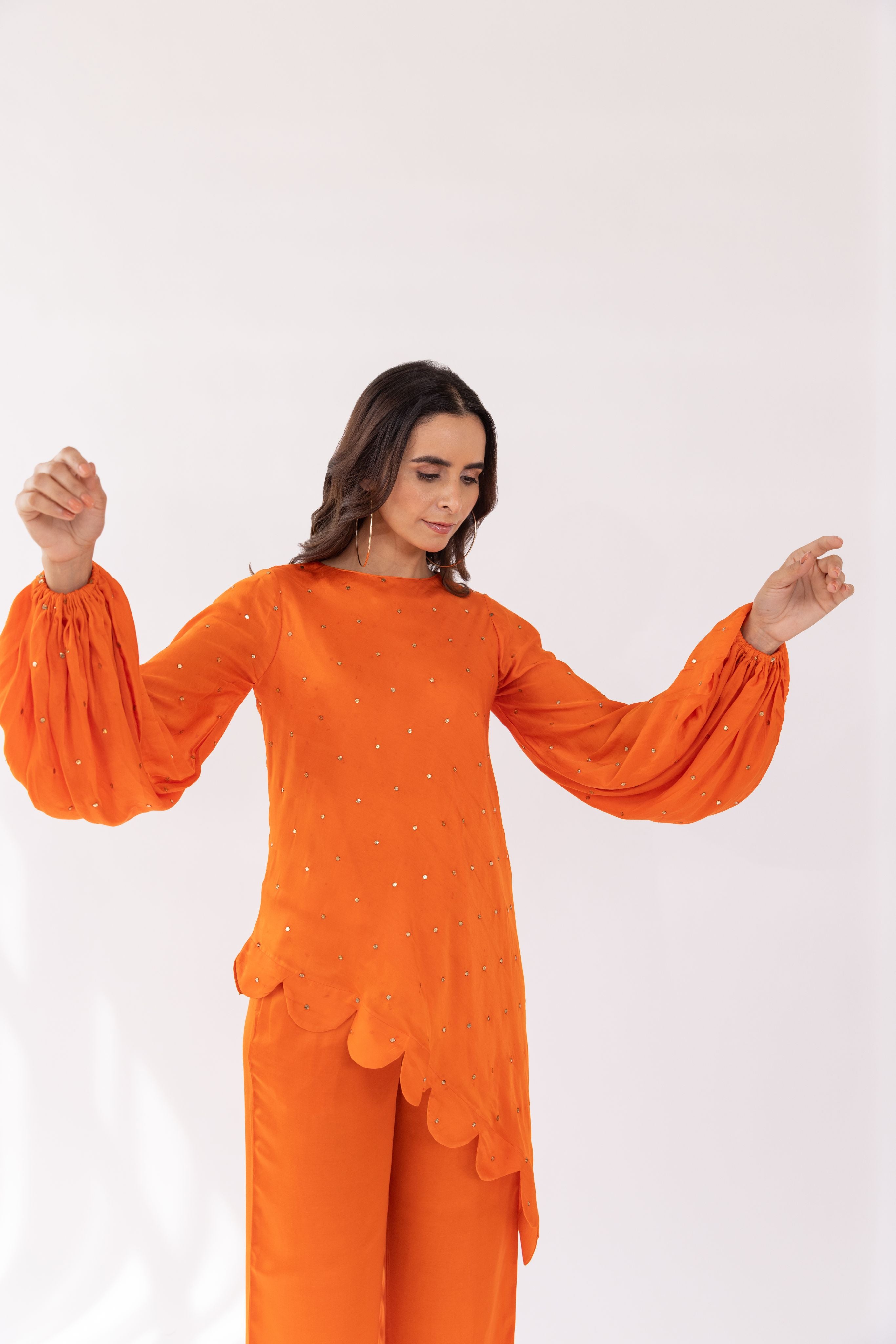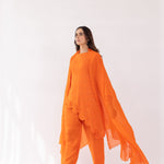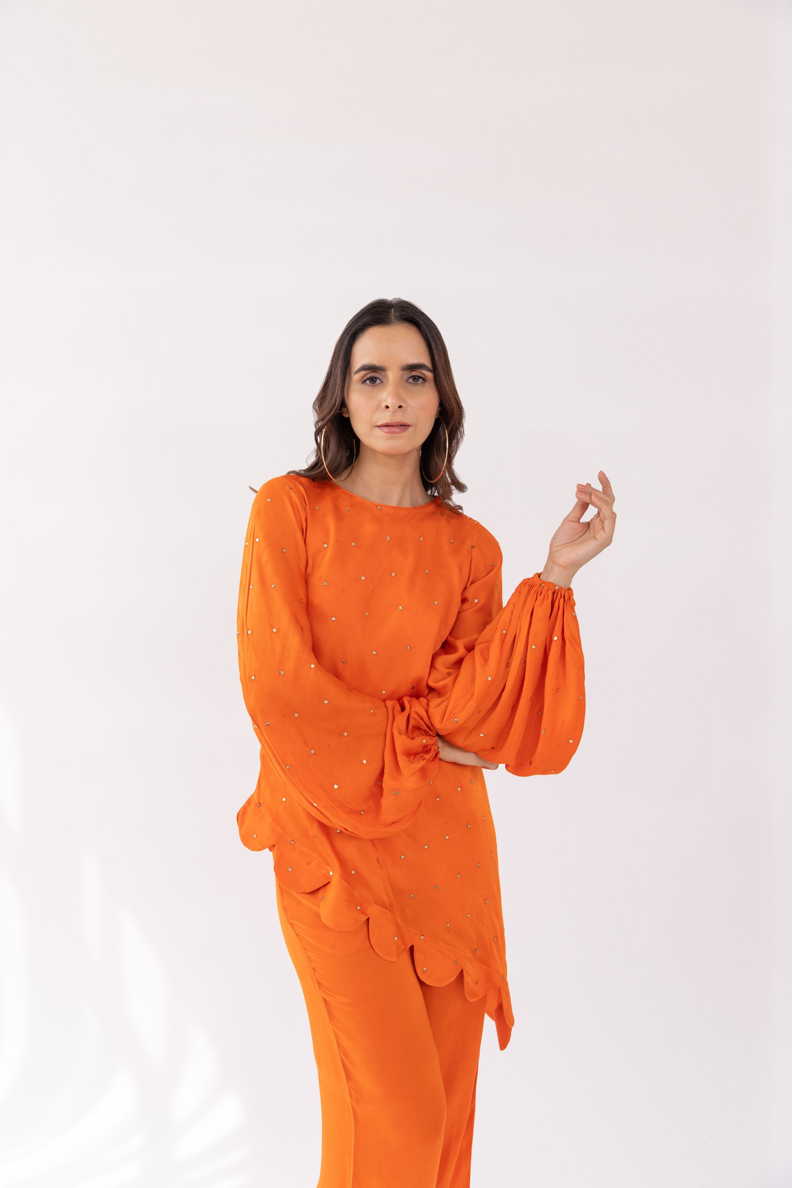 Featuring a boat neck kurta set in lurex satin blend base detailed with a scalloped edge. It is paired with matching pants and scalloped oragnza dupatta