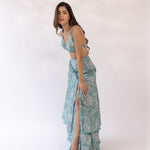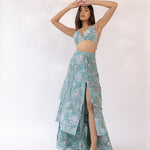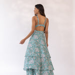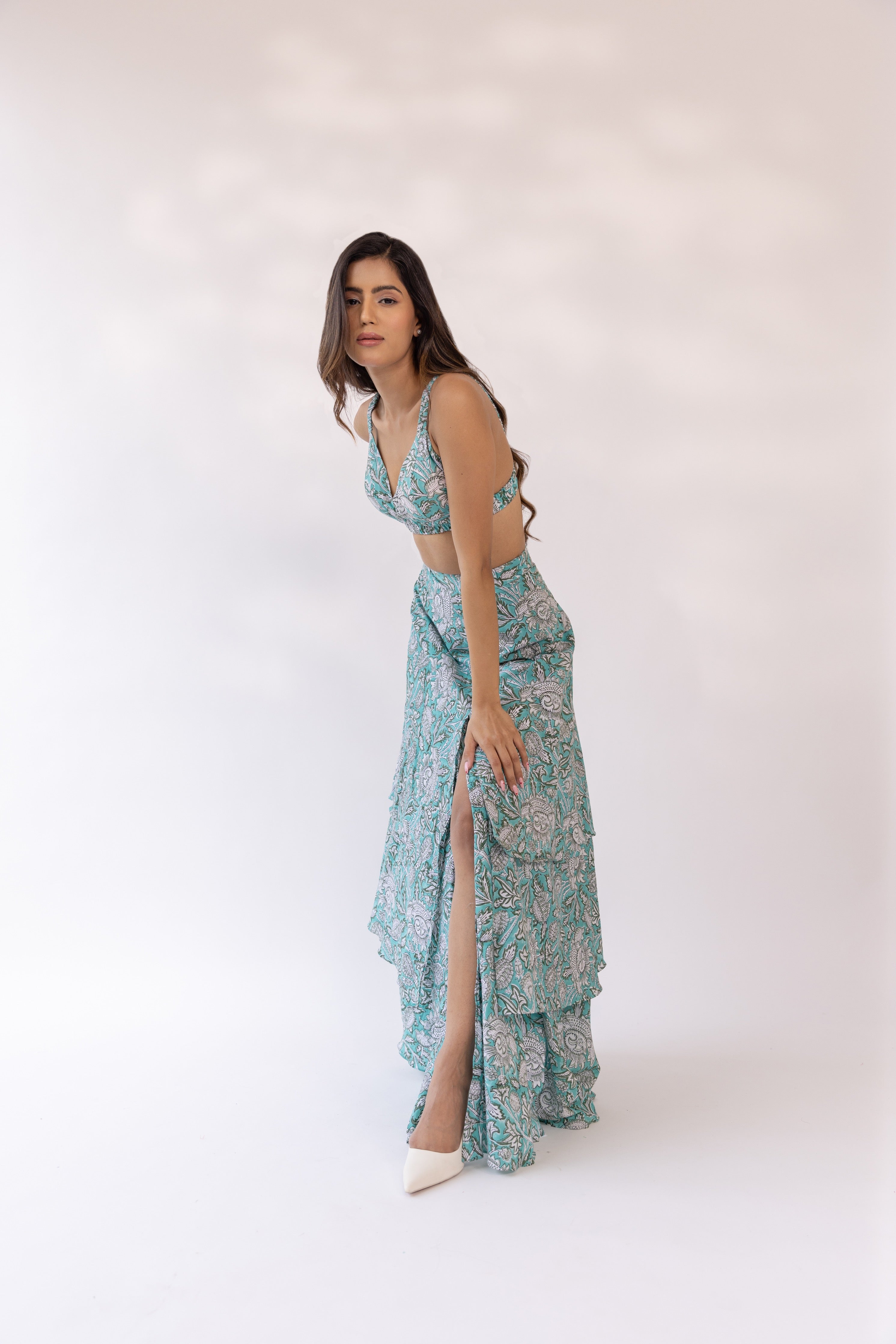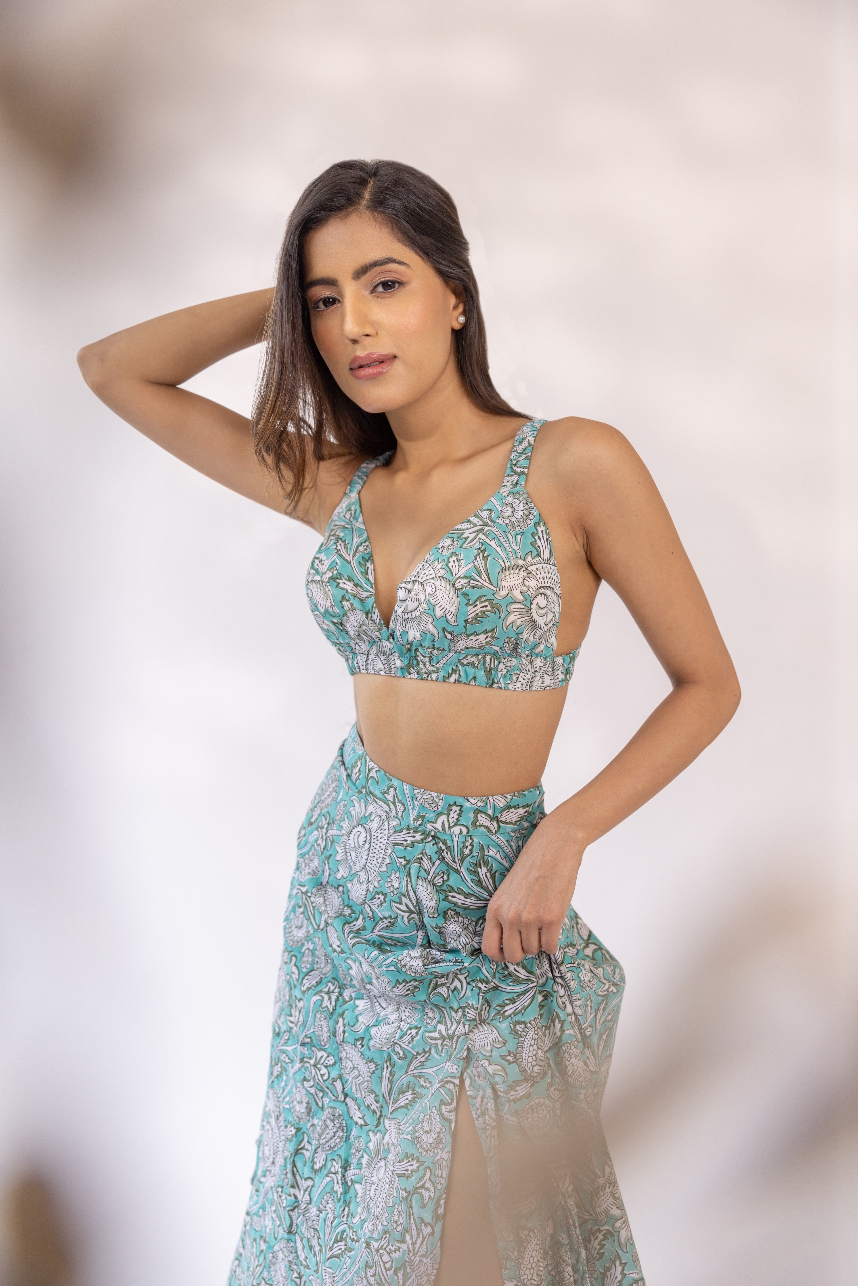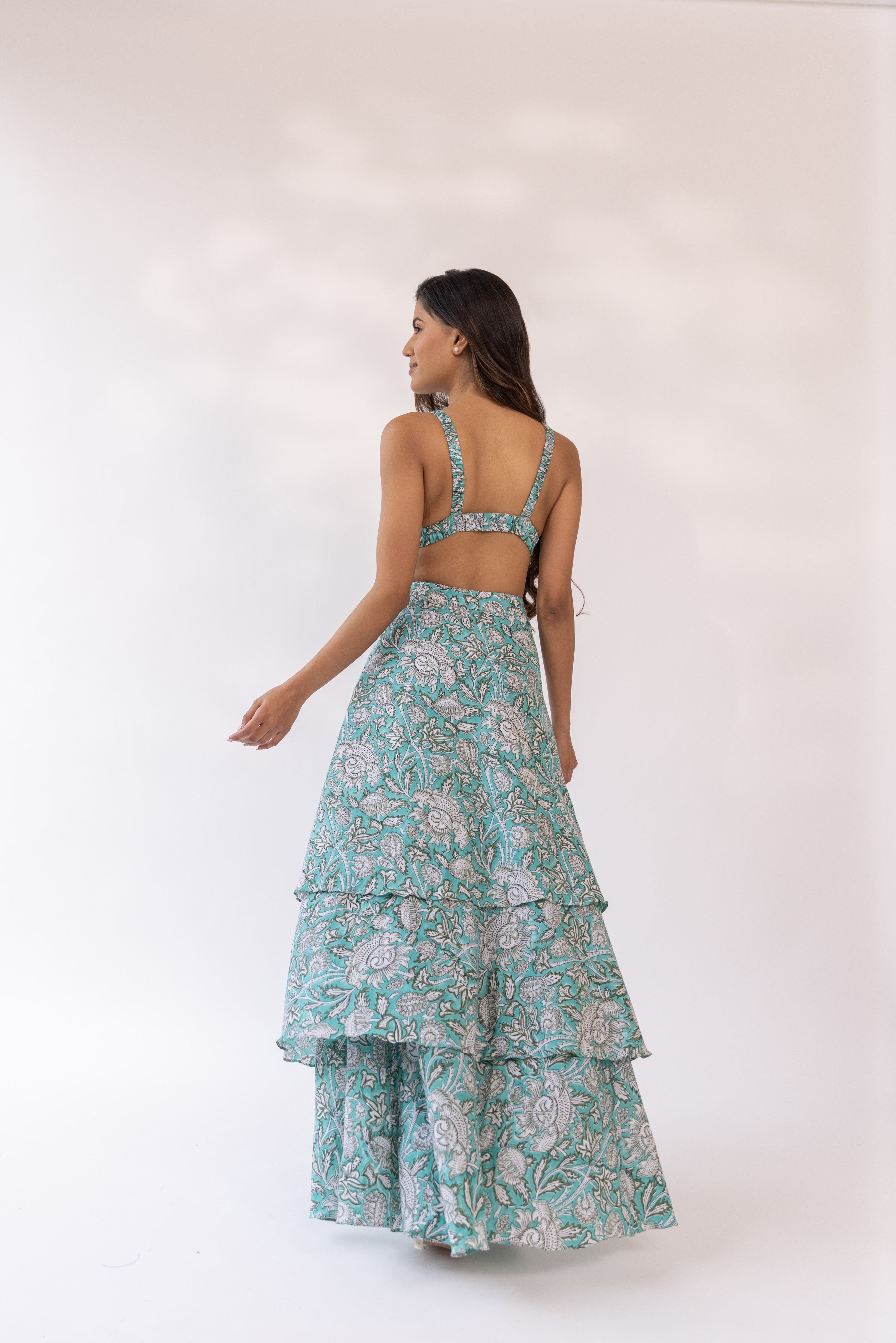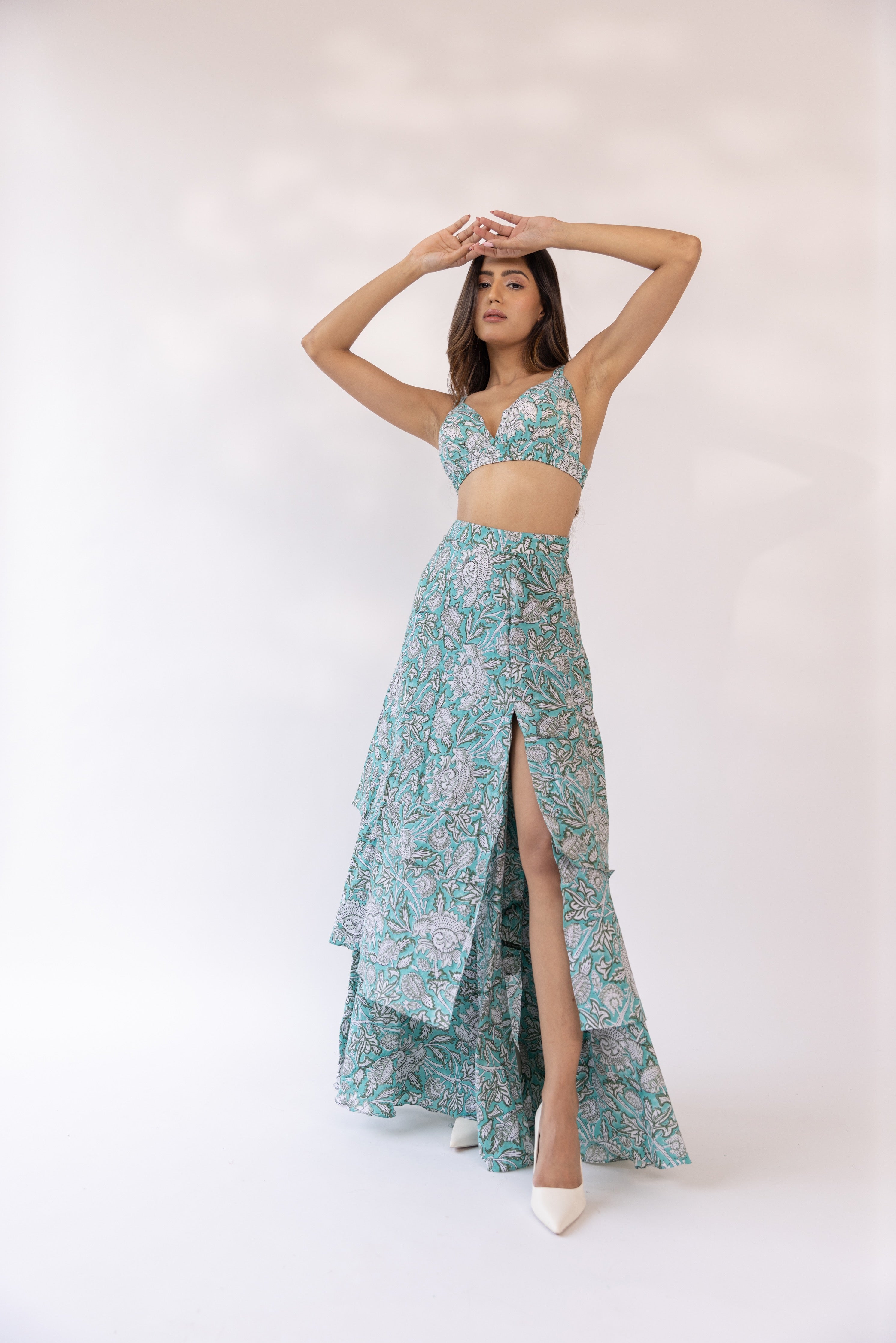 Featuring a turquoise block printed bustier in cotton base, paired with a high slit layered midi skirt.