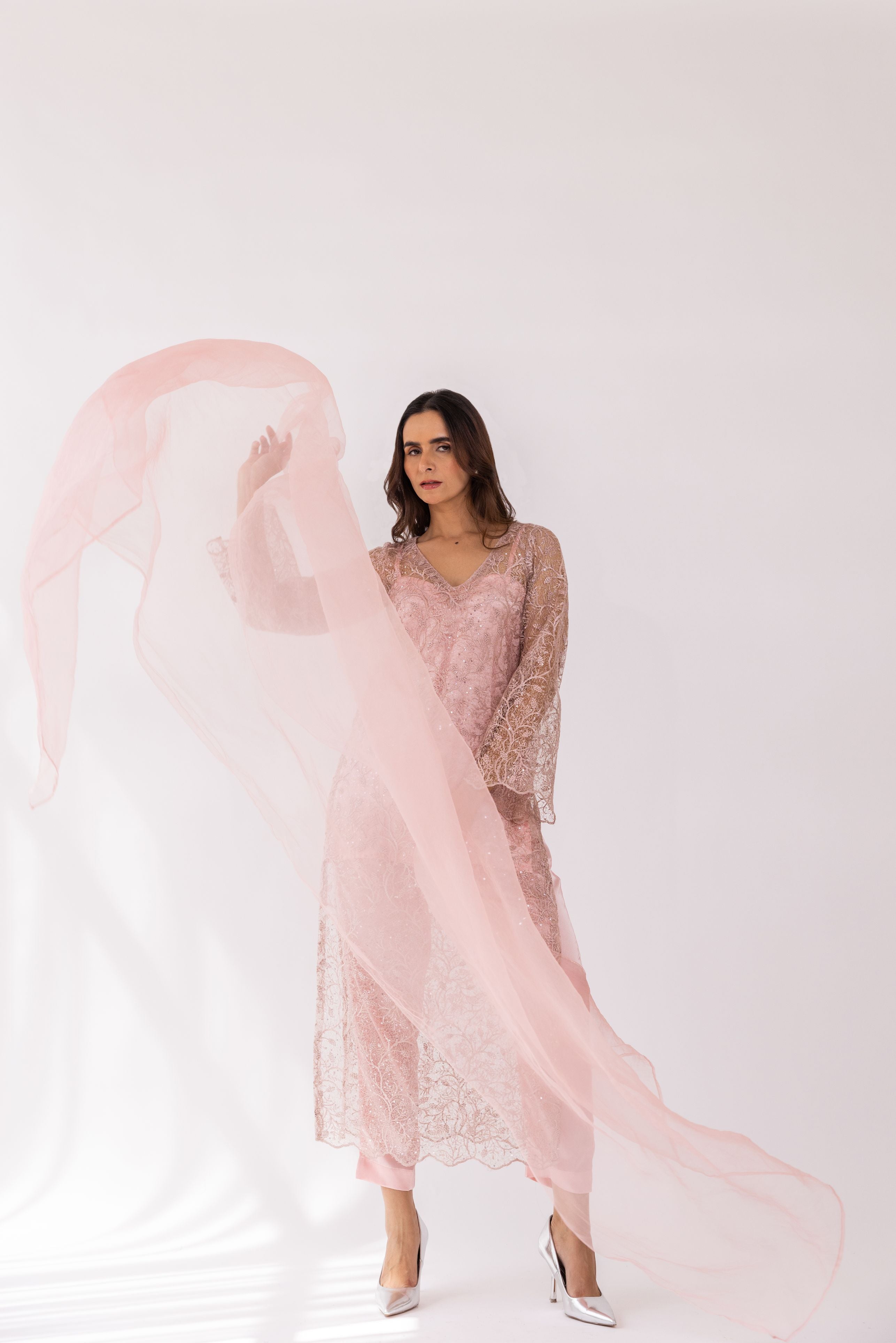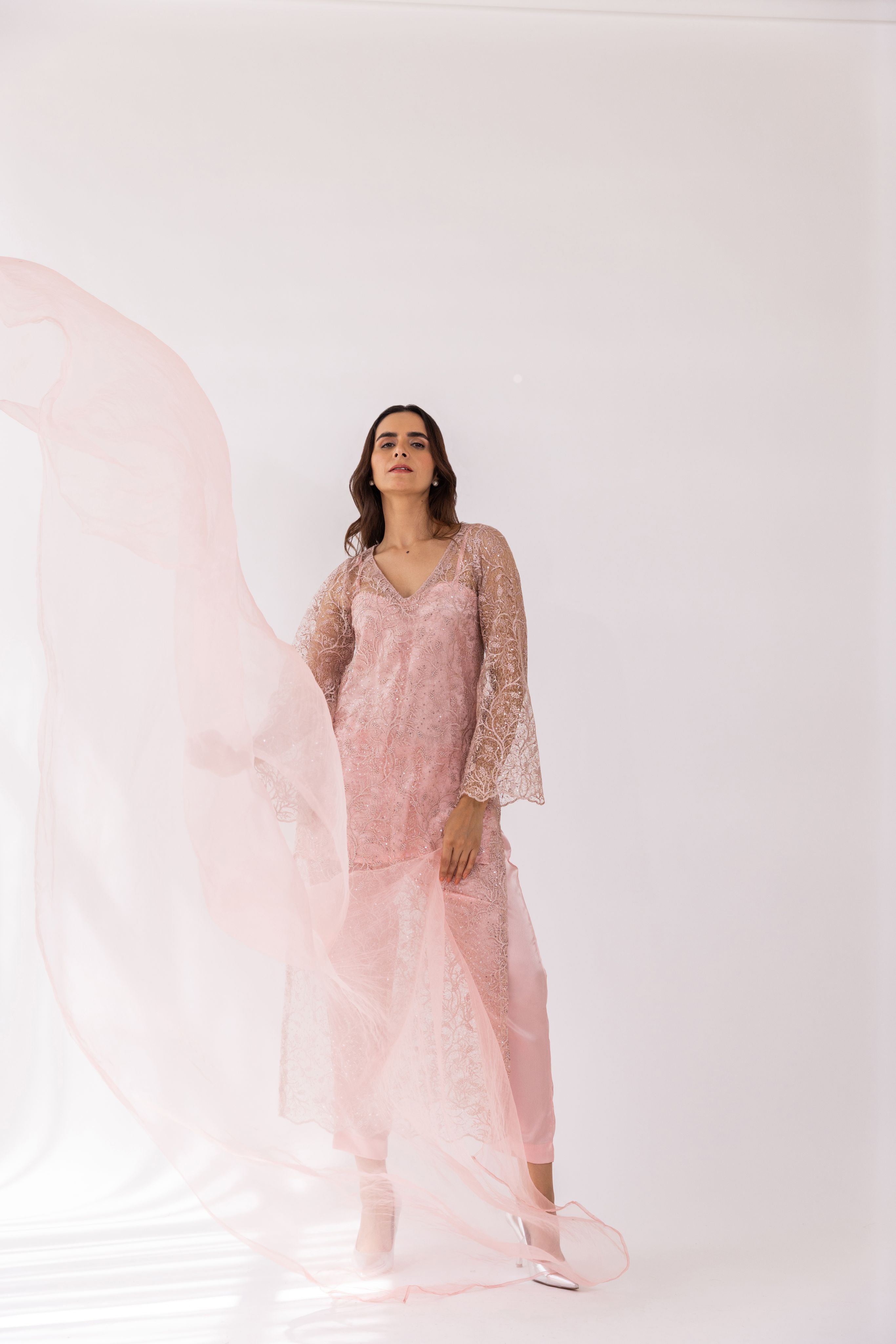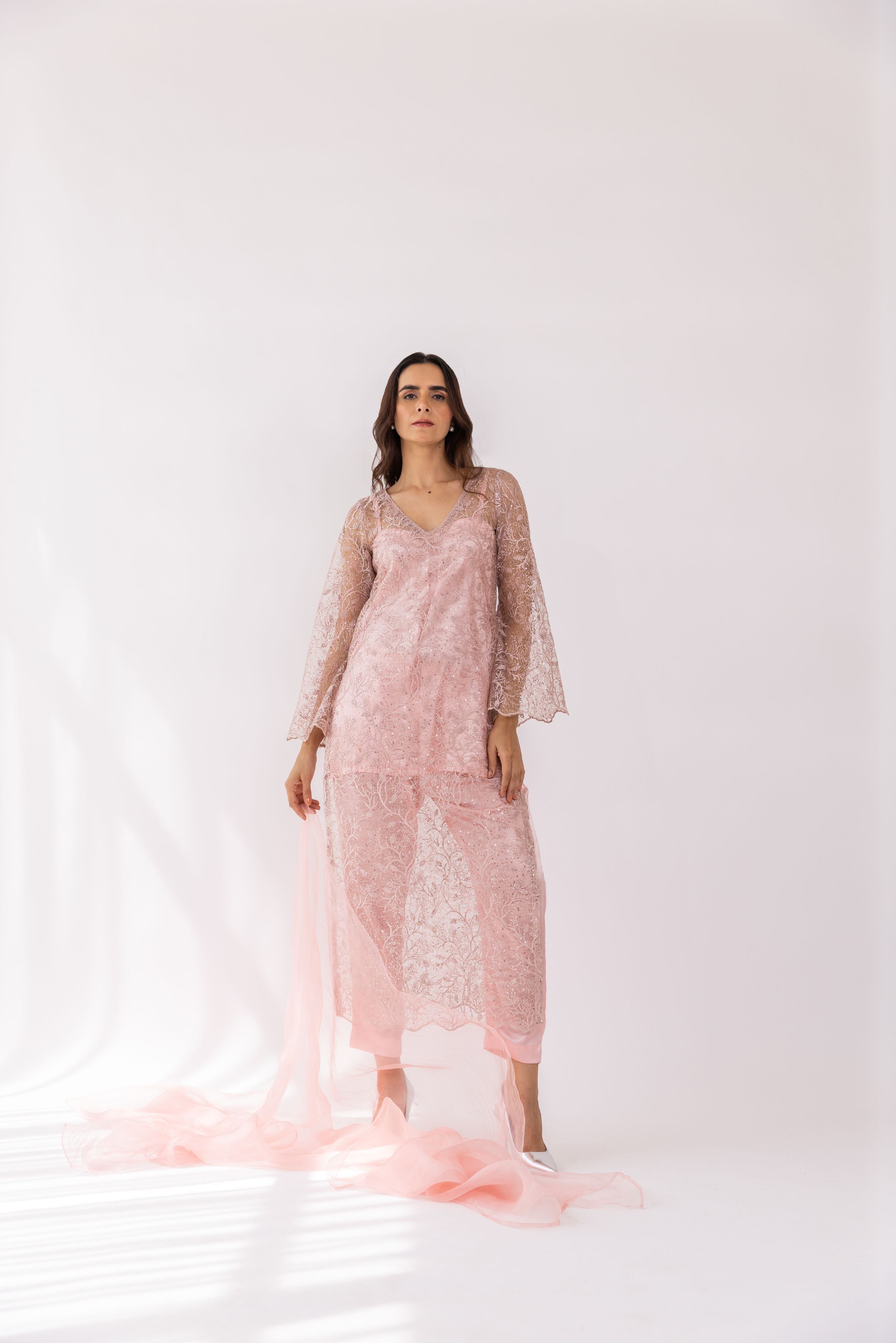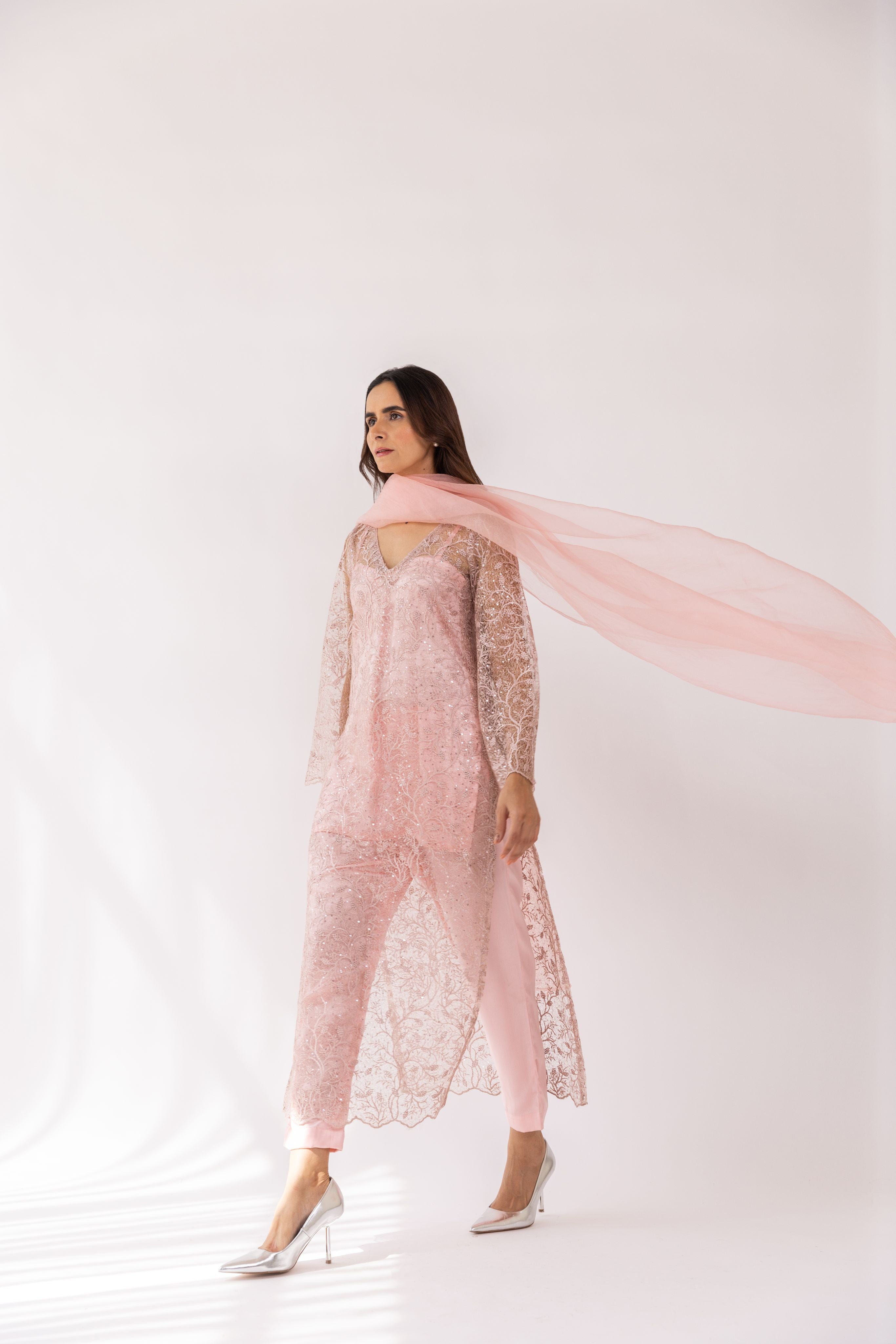 Featuring a peach sheer embroidered v-neck kurta set in net base. It is paired with solid pants and organza dupatta.