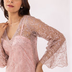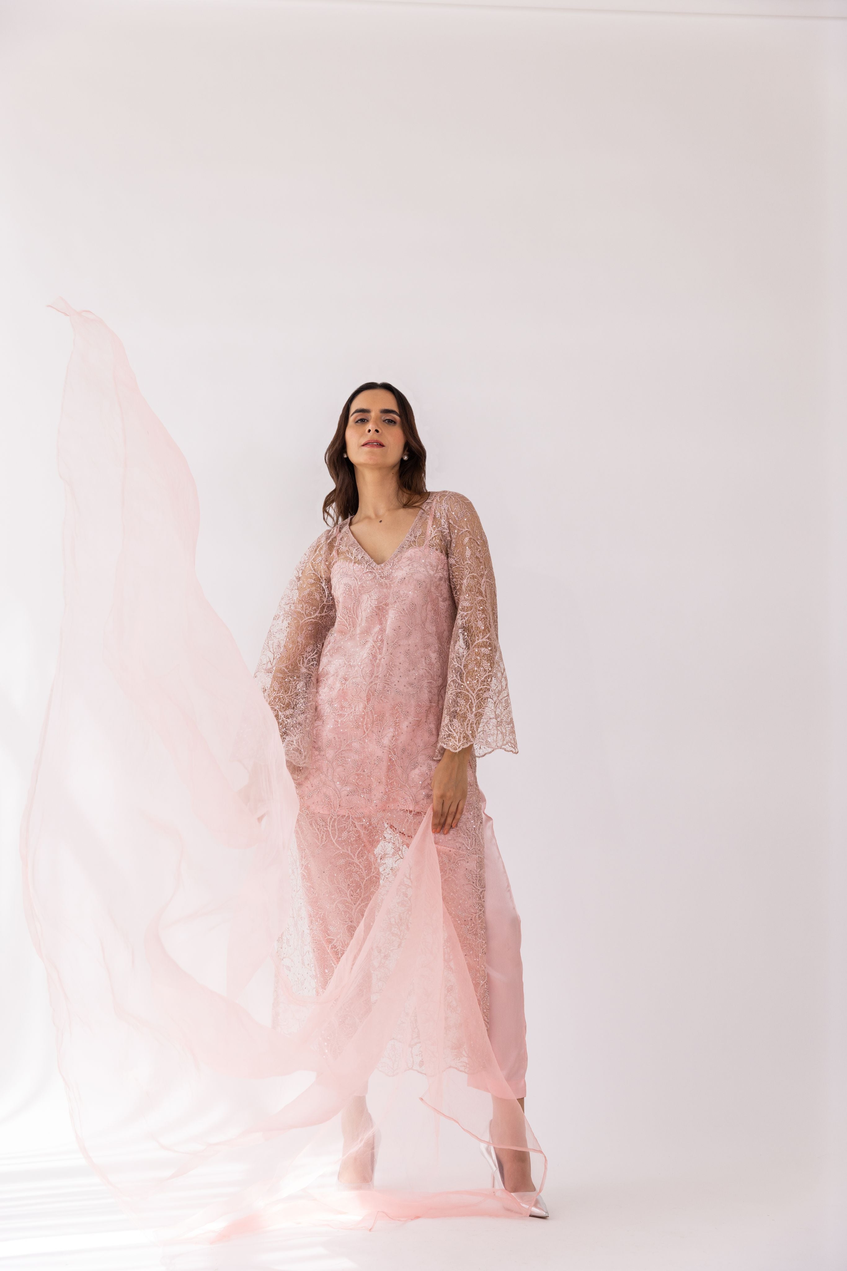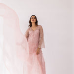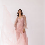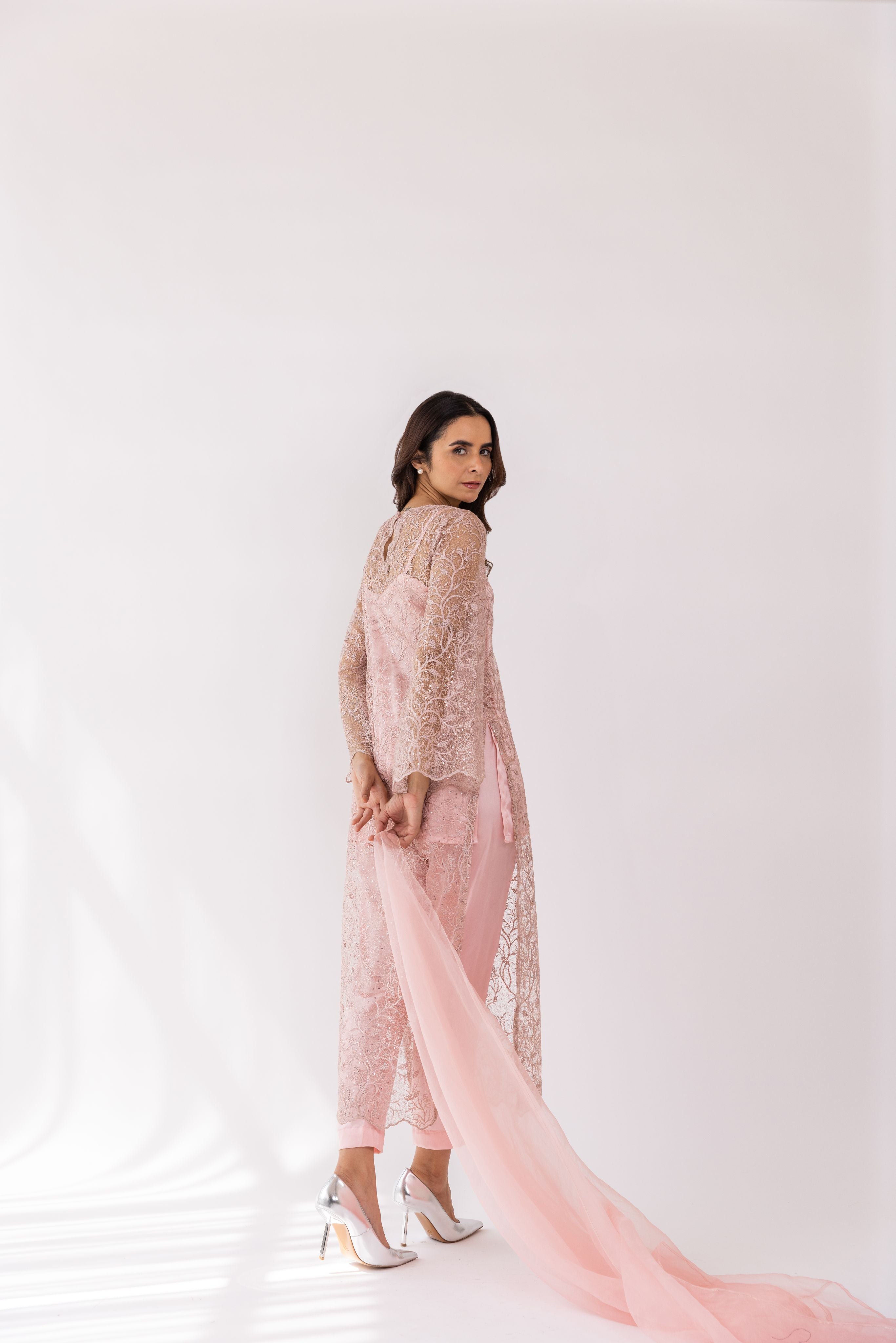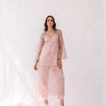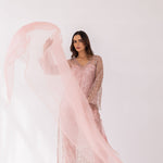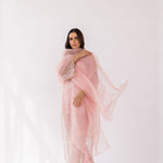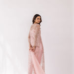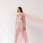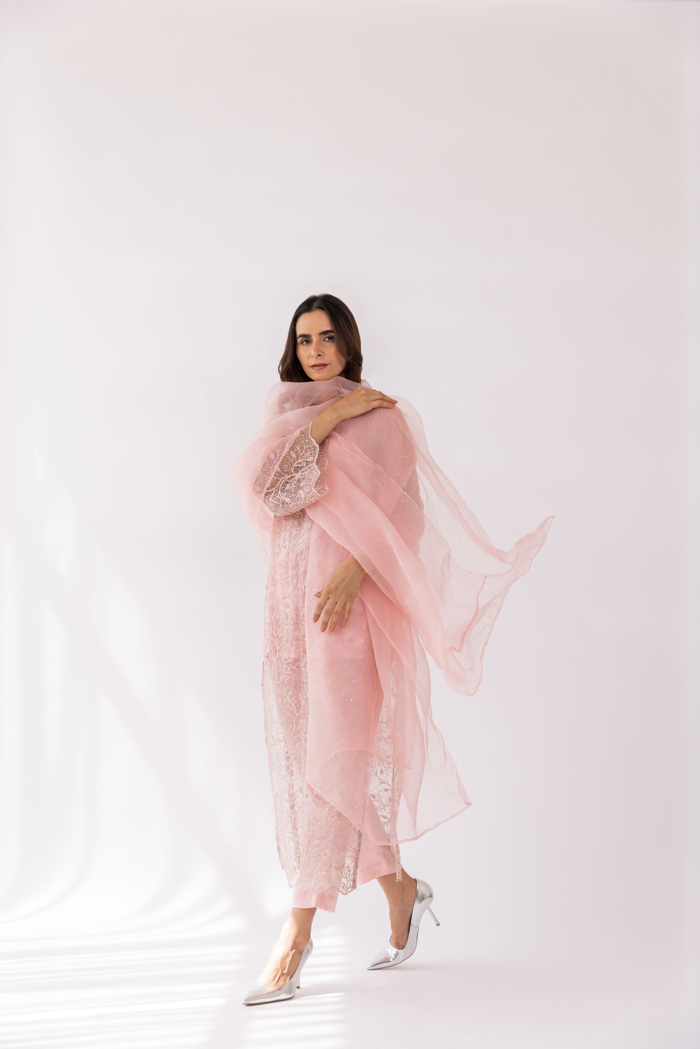 Featuring a peach sheer embroidered v-neck kurta set in net base. It is paired with solid pants and organza dupatta.