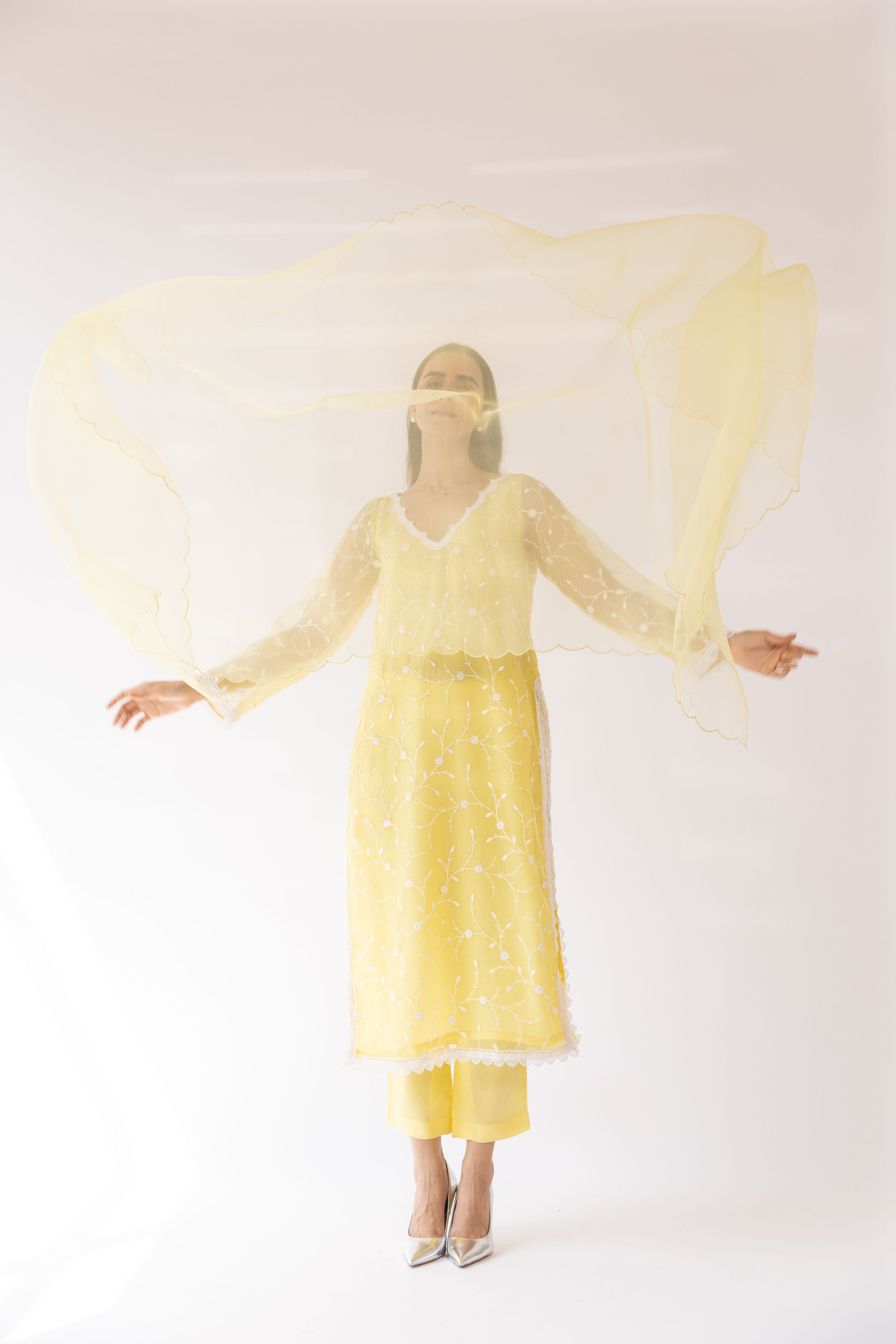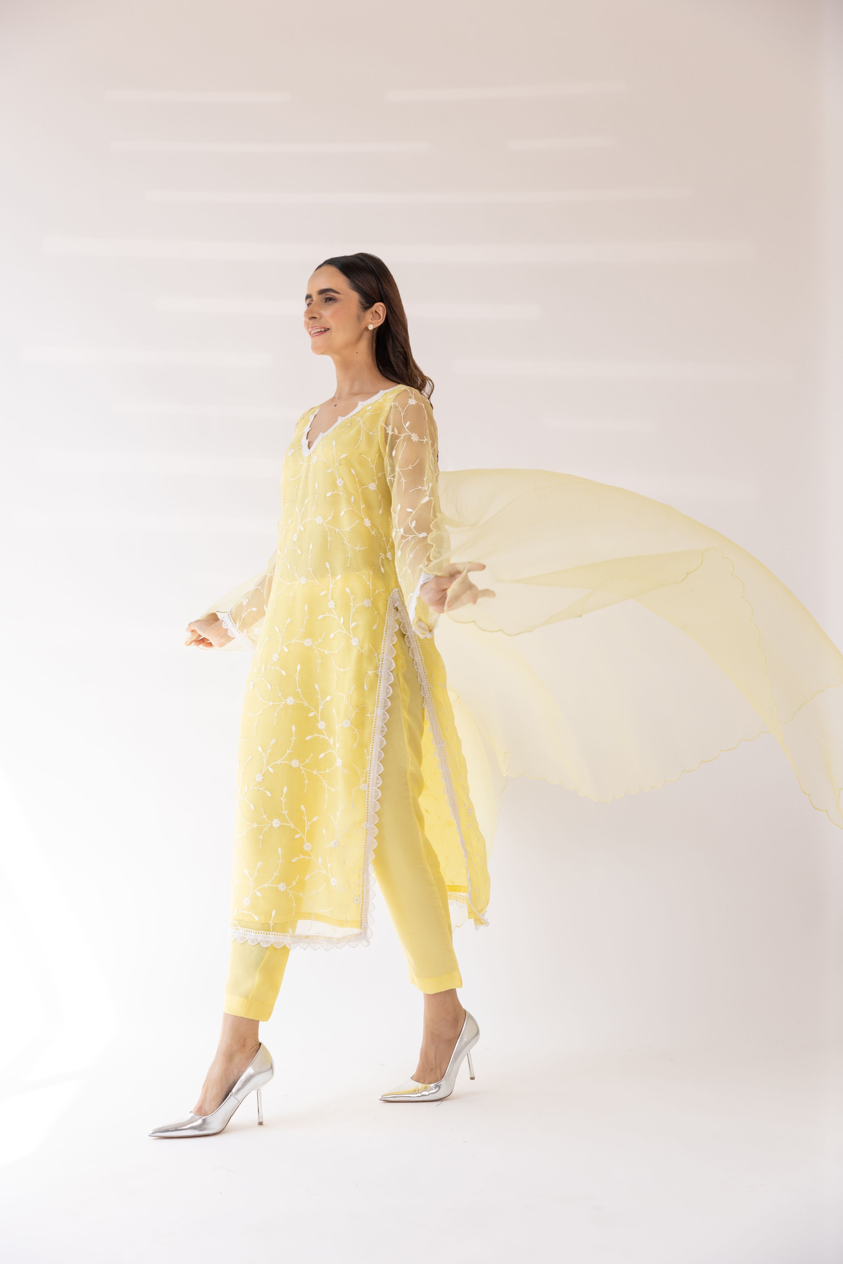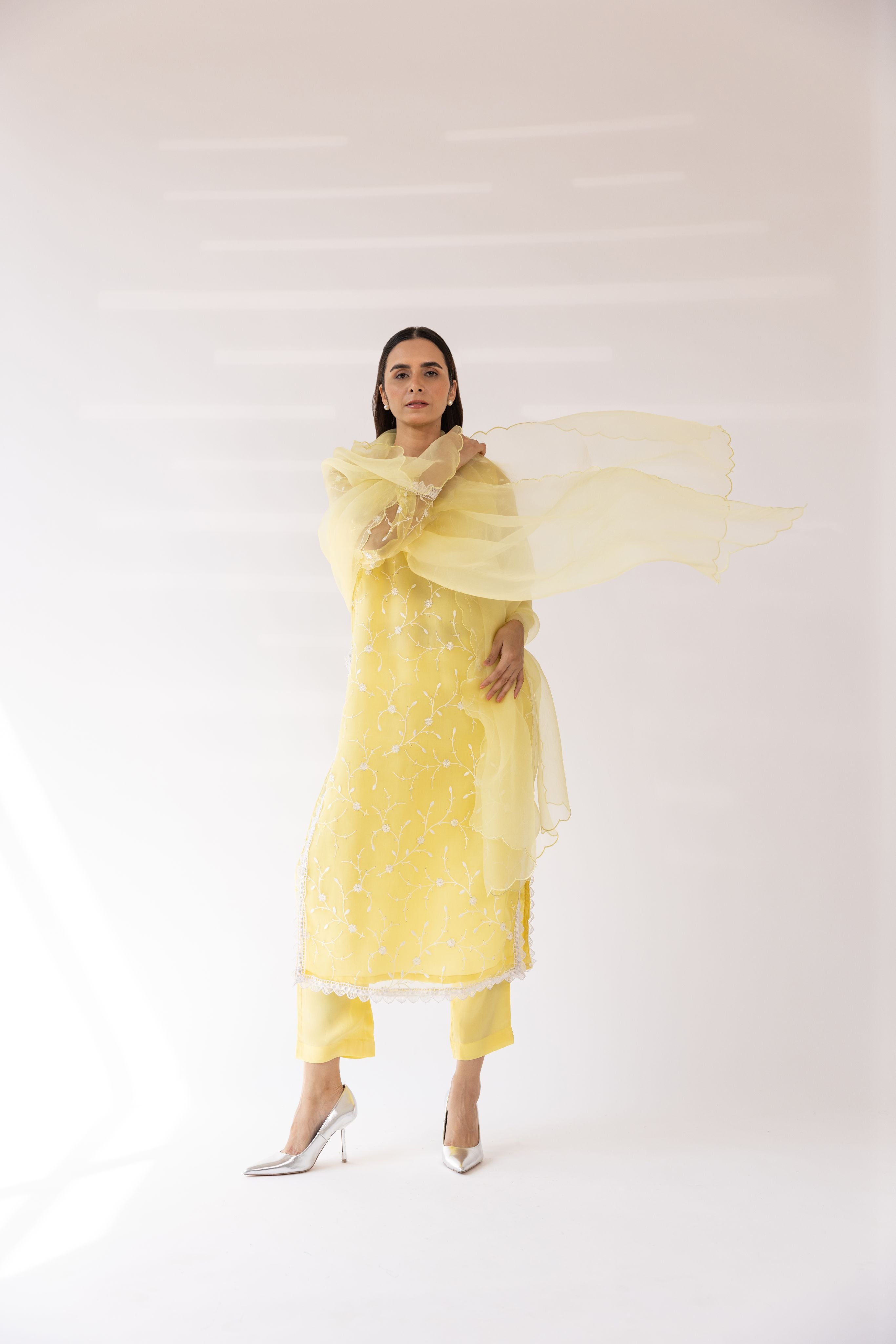 Featuring a yellow embroidered v-neck kurta set in organza base detailed with lace edges. It is paired with solid pants and scalloped organza dupatta.