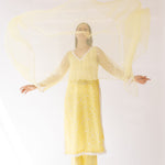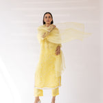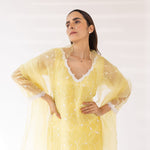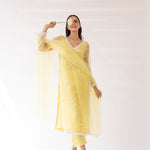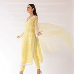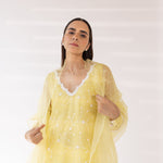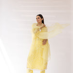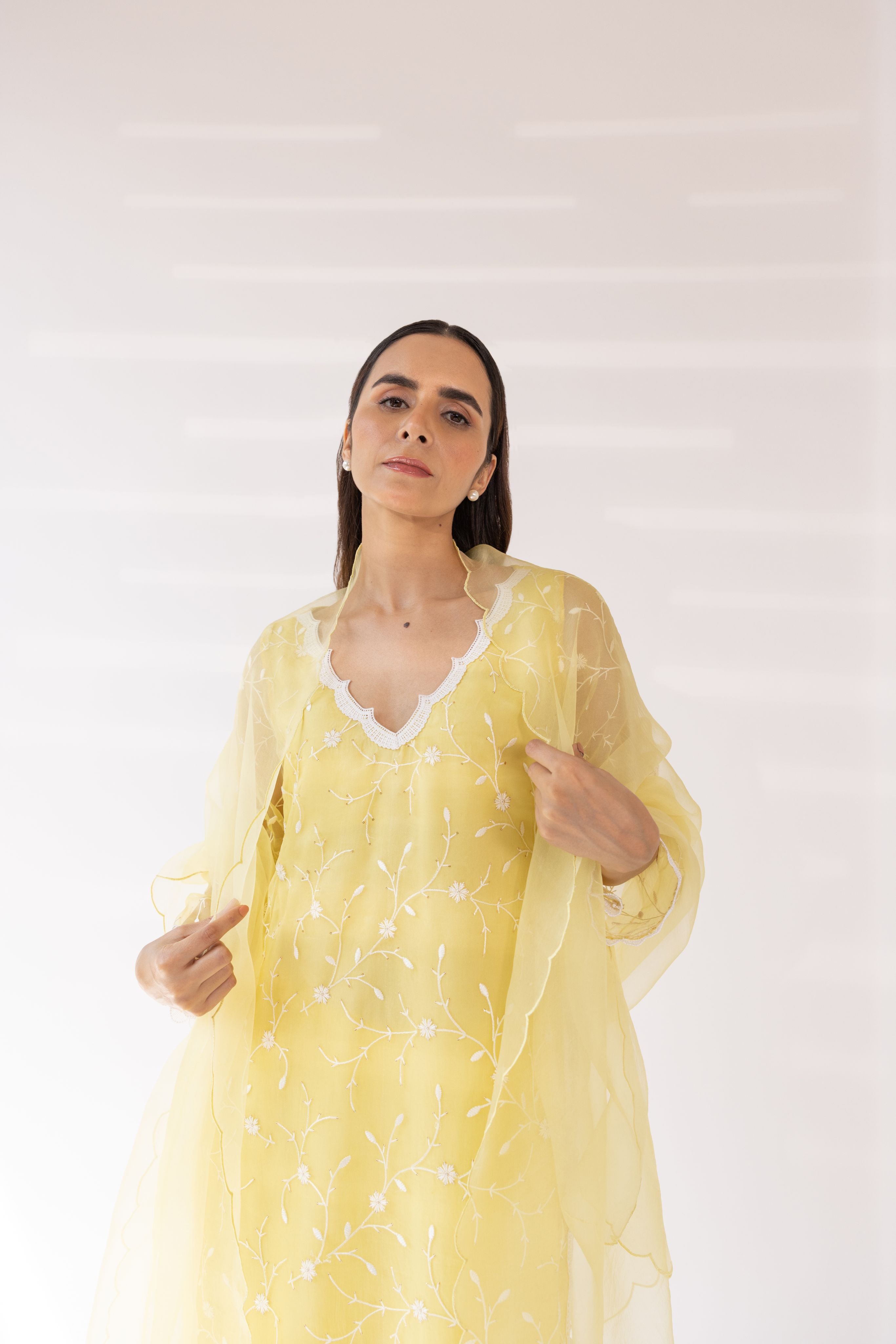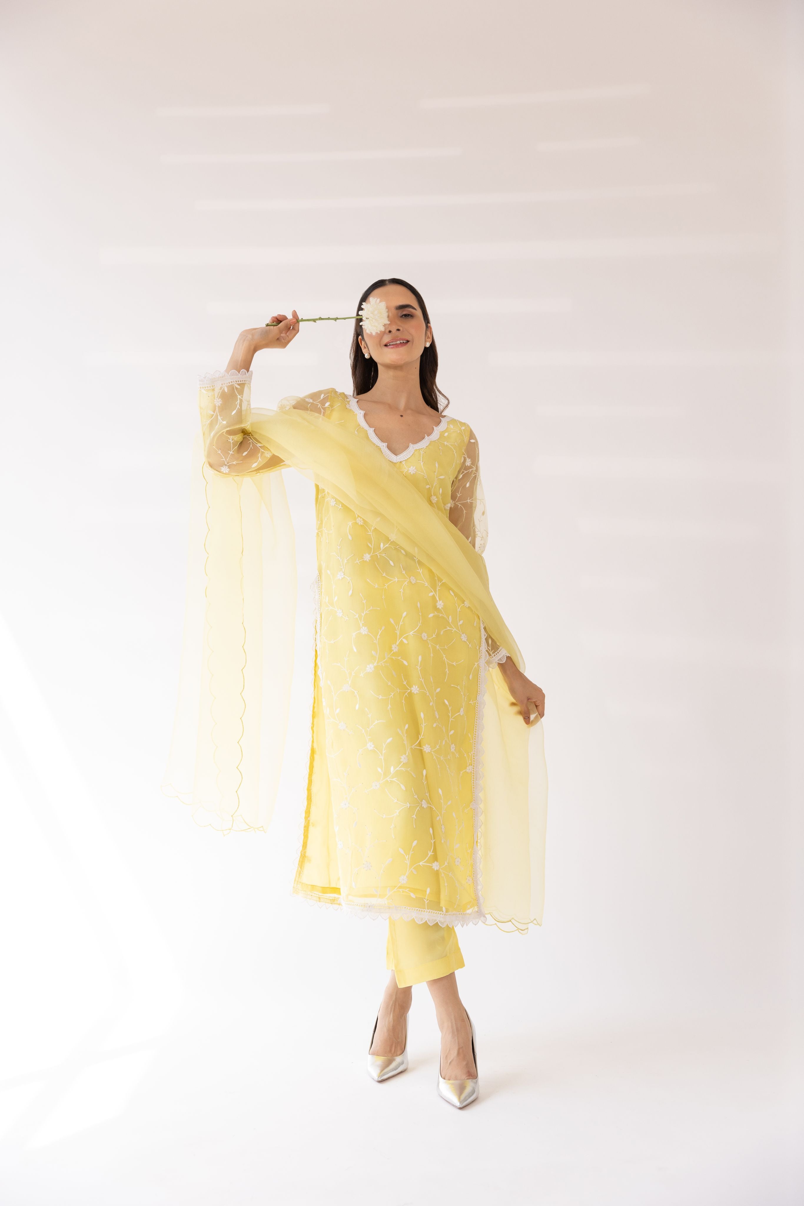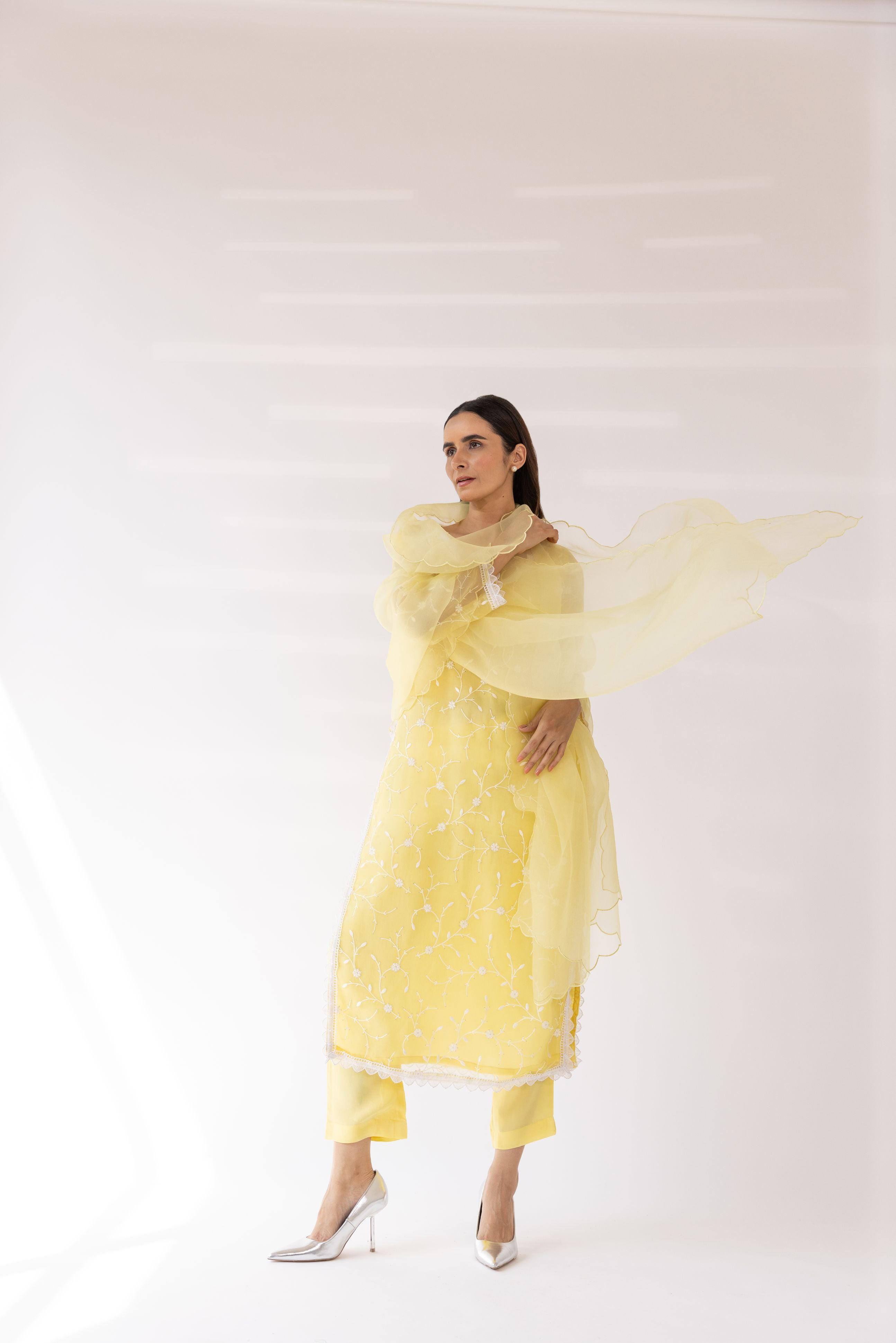 Featuring a yellow embroidered v-neck kurta set in organza base detailed with lace edges. It is paired with solid pants and scalloped organza dupatta.