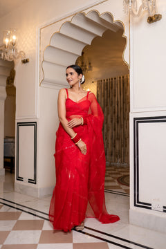 Details: V Neck Volumed Sleeves, Long Kurta With Side Canceled Pants, Chanderi Dupatta