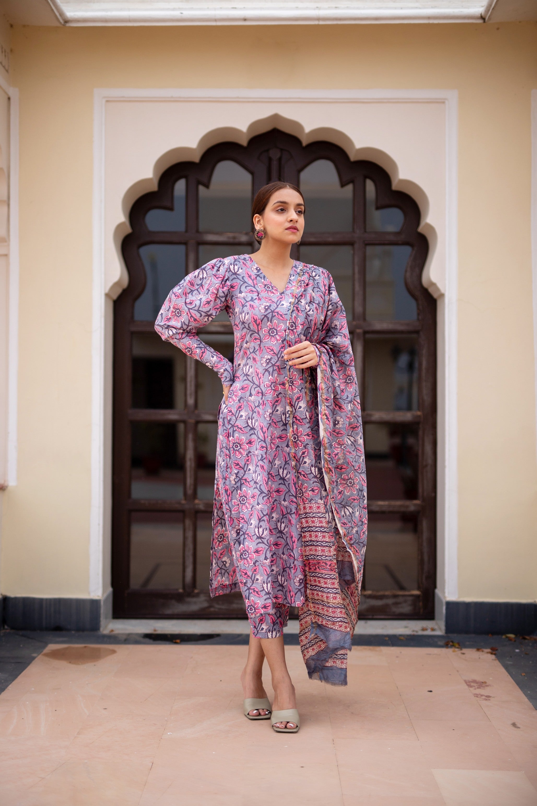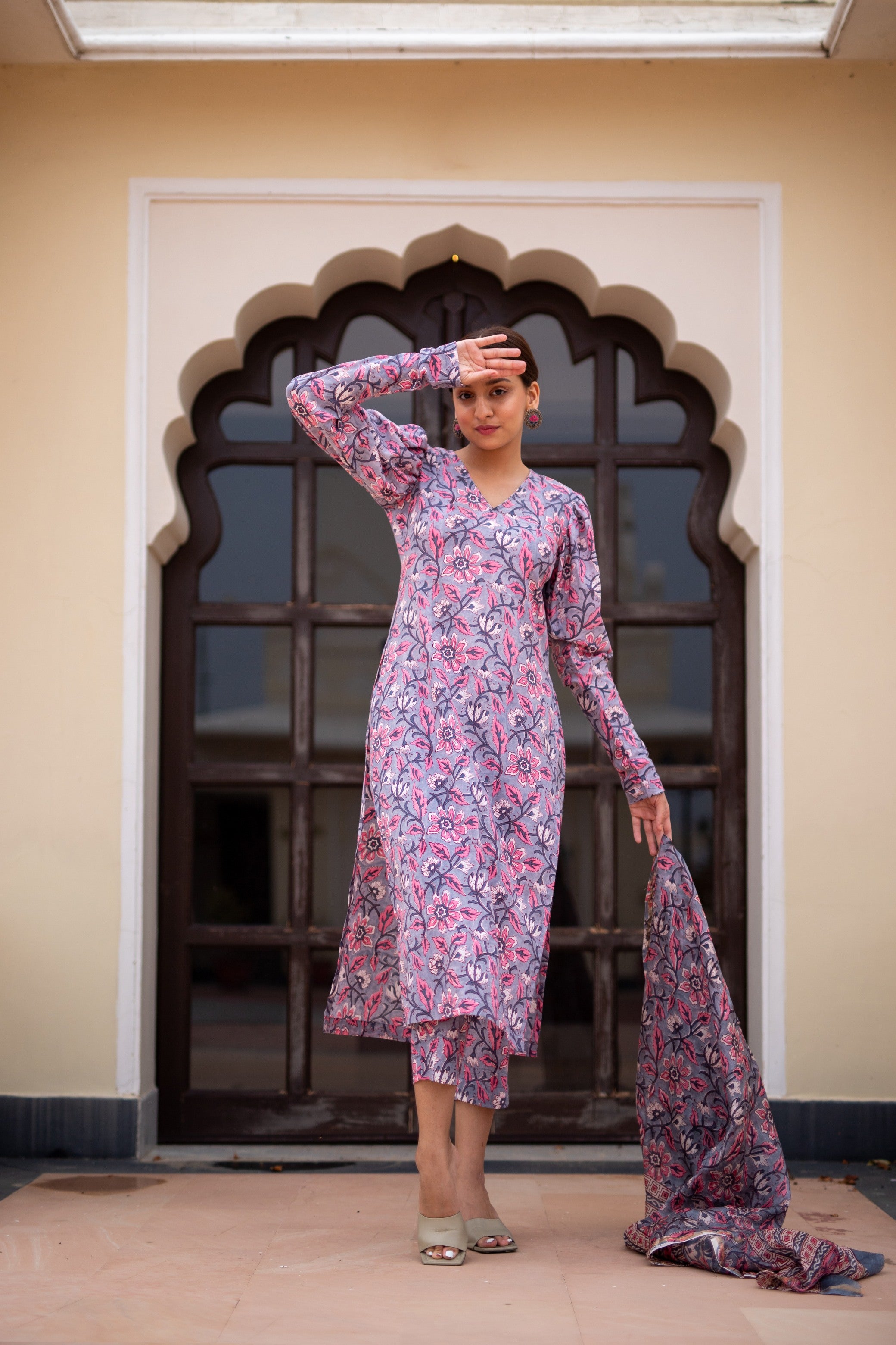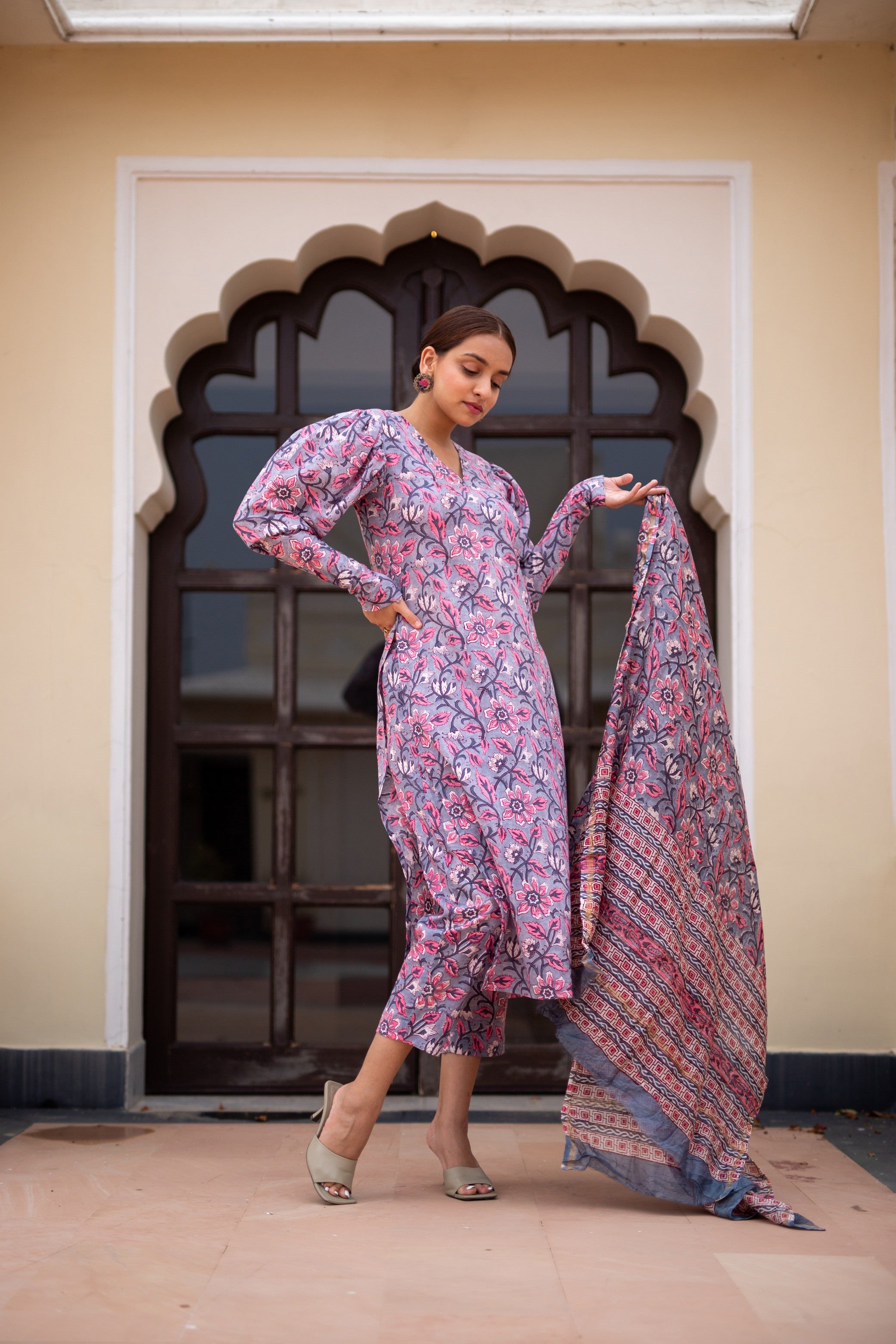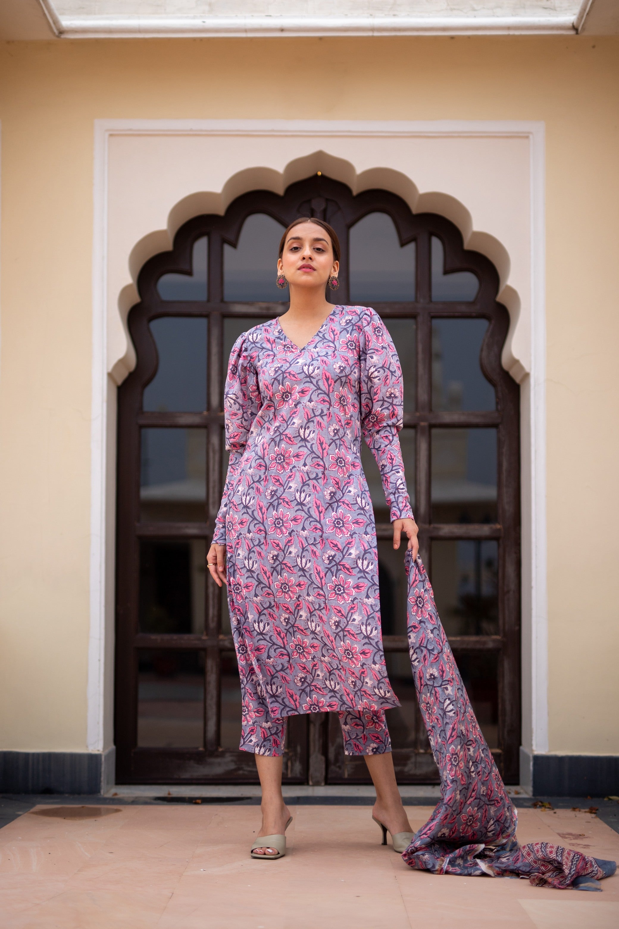Featuring A Straight Fit Kurta In Cotton Base Block Print. It Is Paired With Matching Pants And Dupatta.