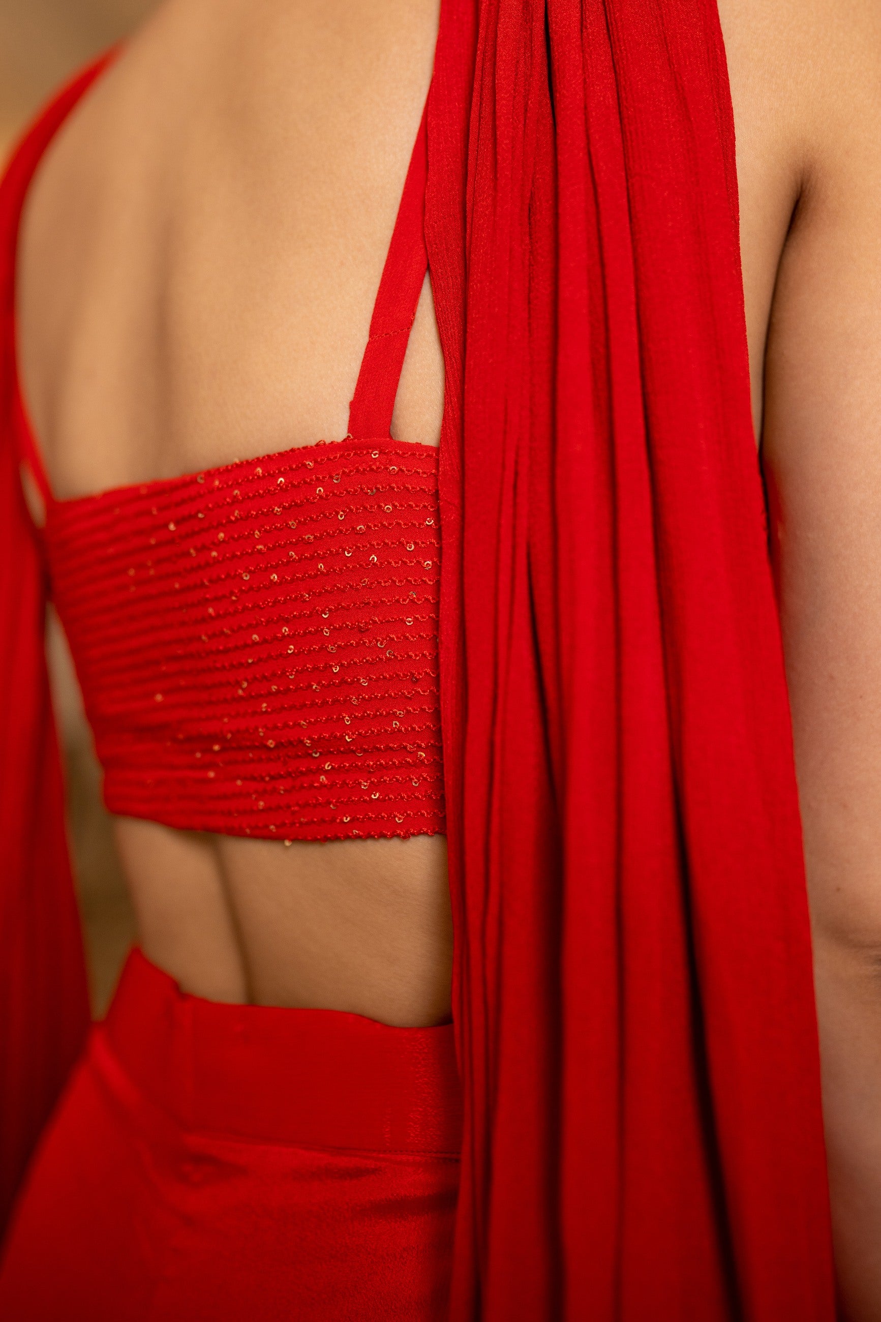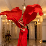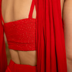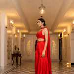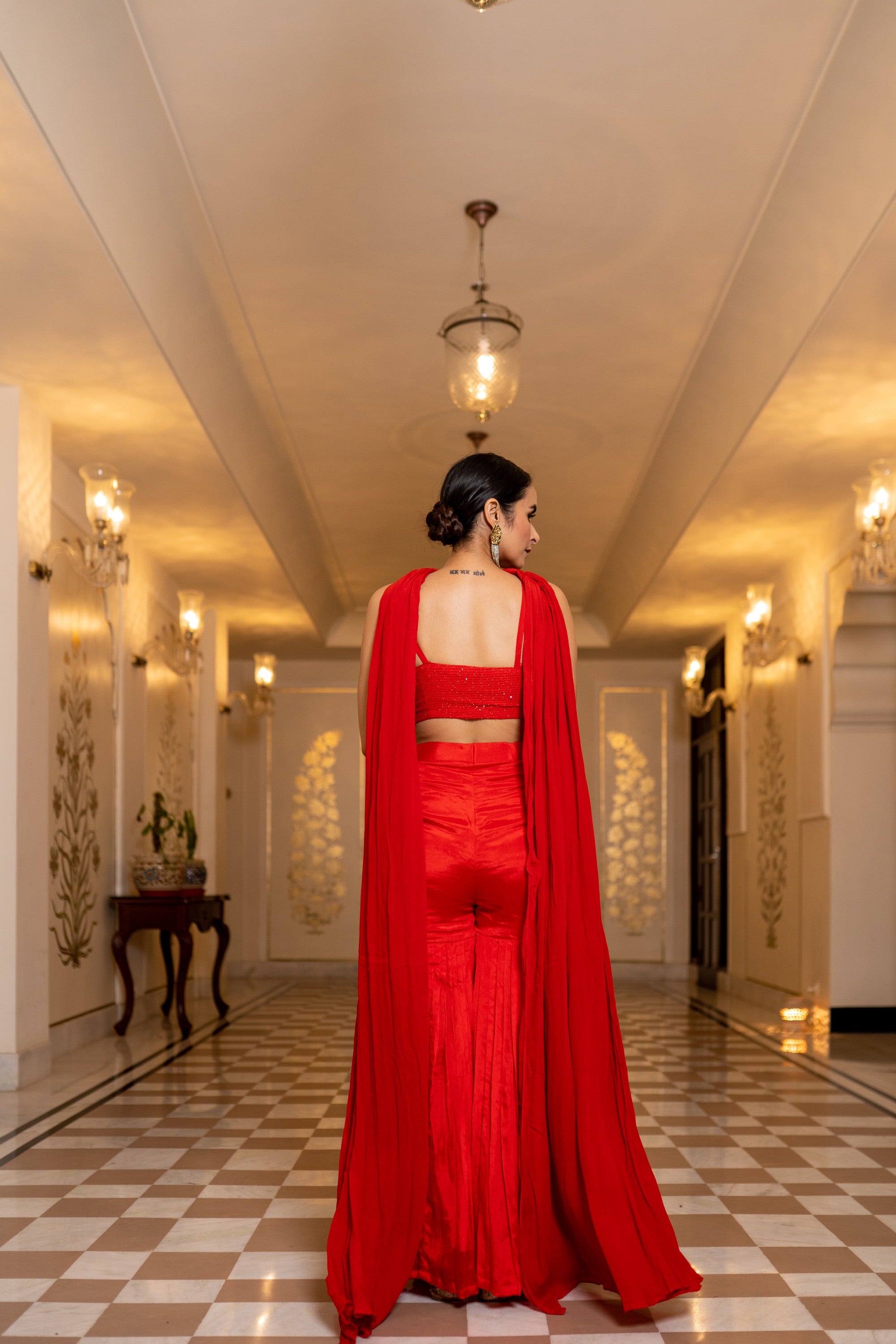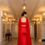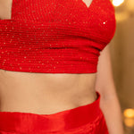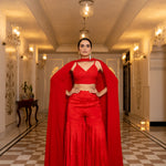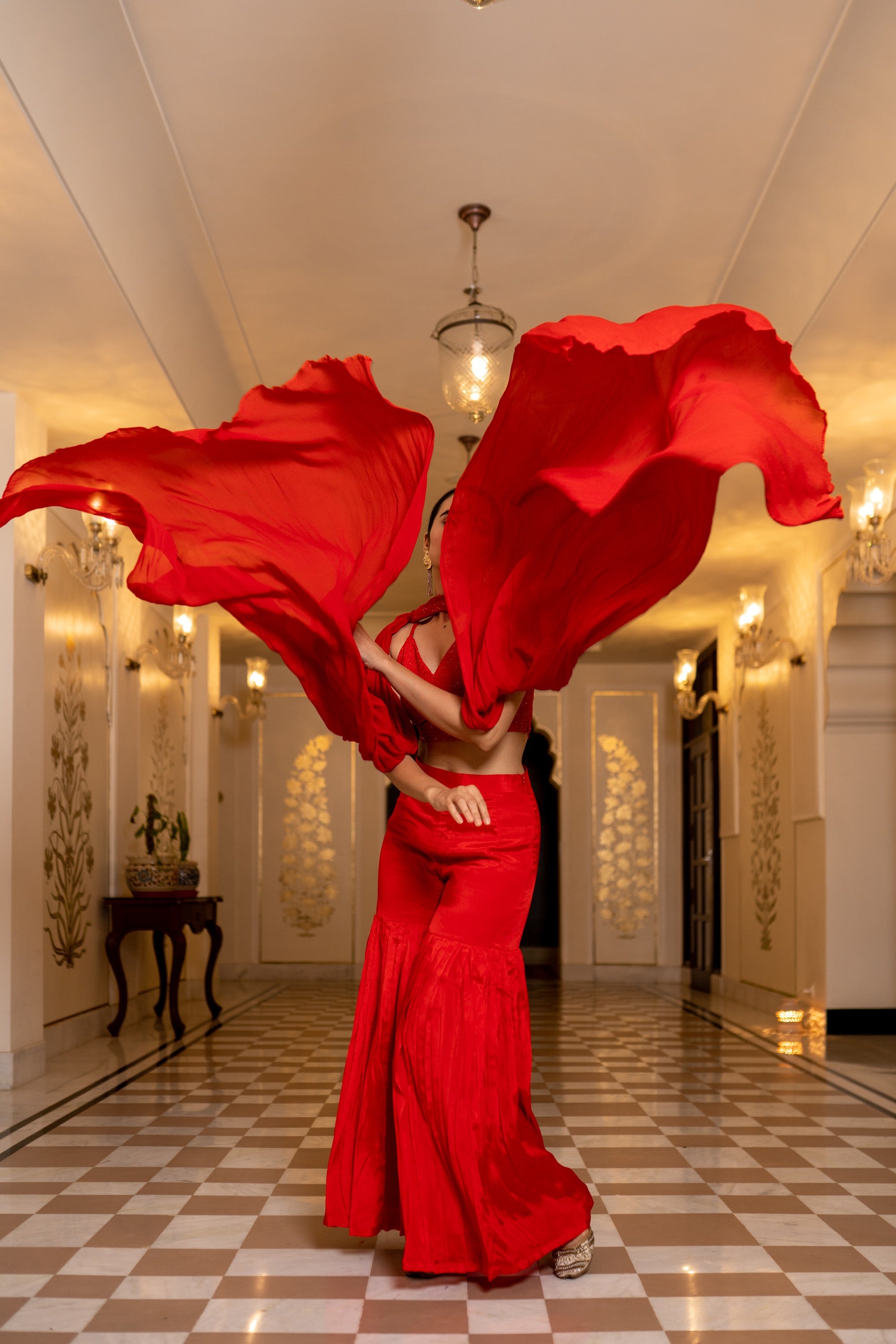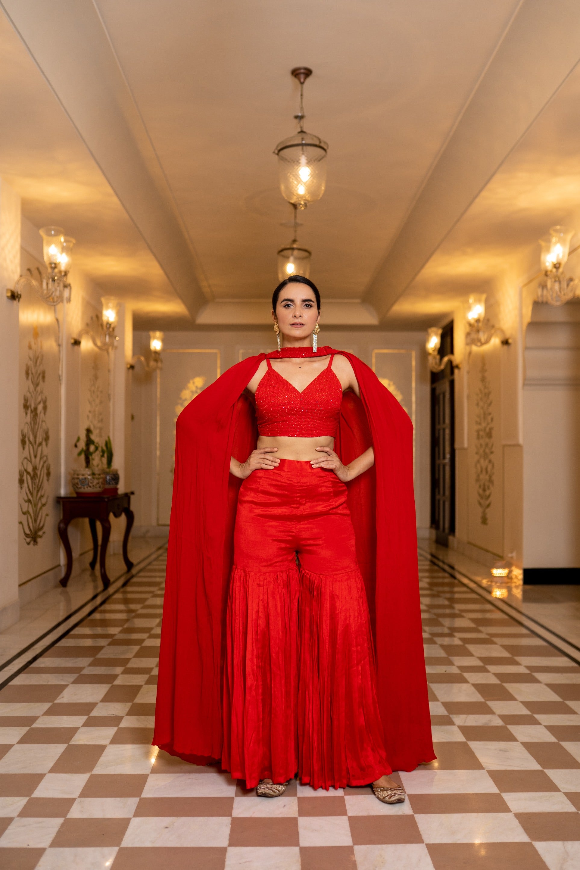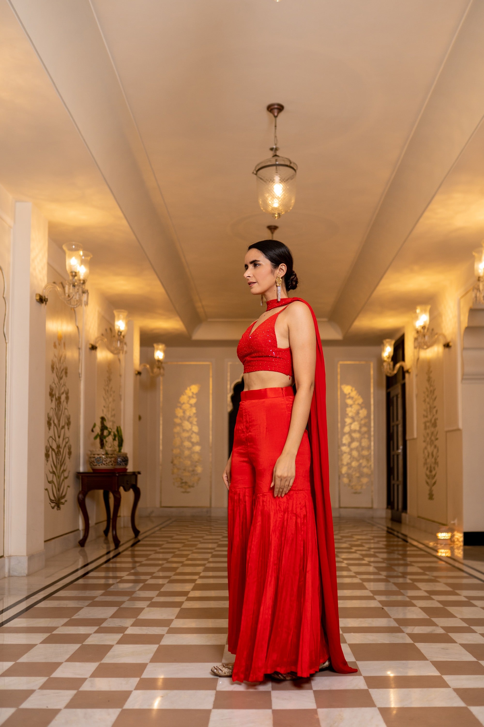 Featuring A Red Sharara Set In Chinon Base. It Is Paired With Matching A Dupatta In Base.