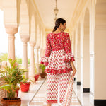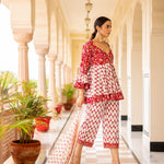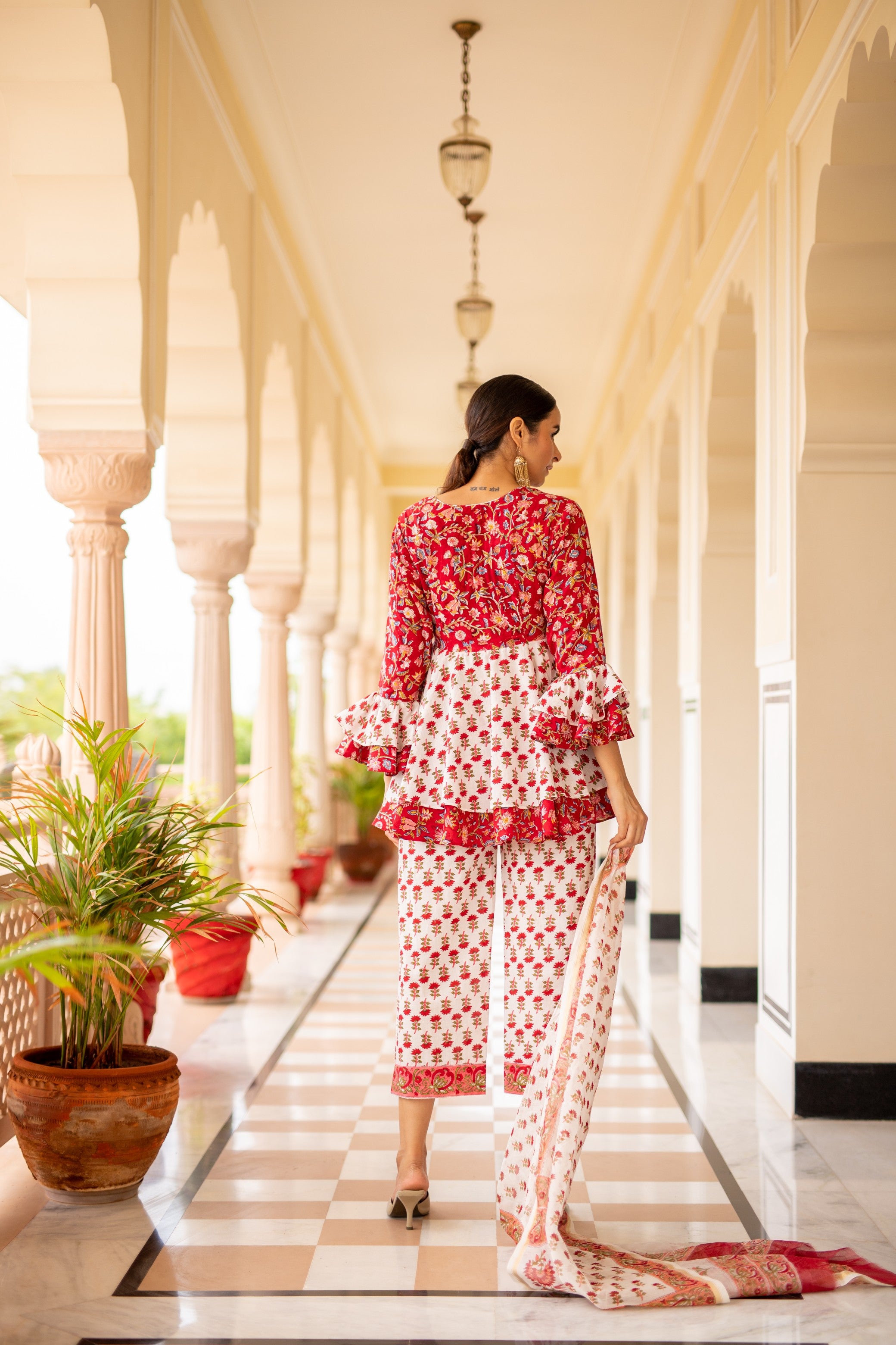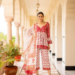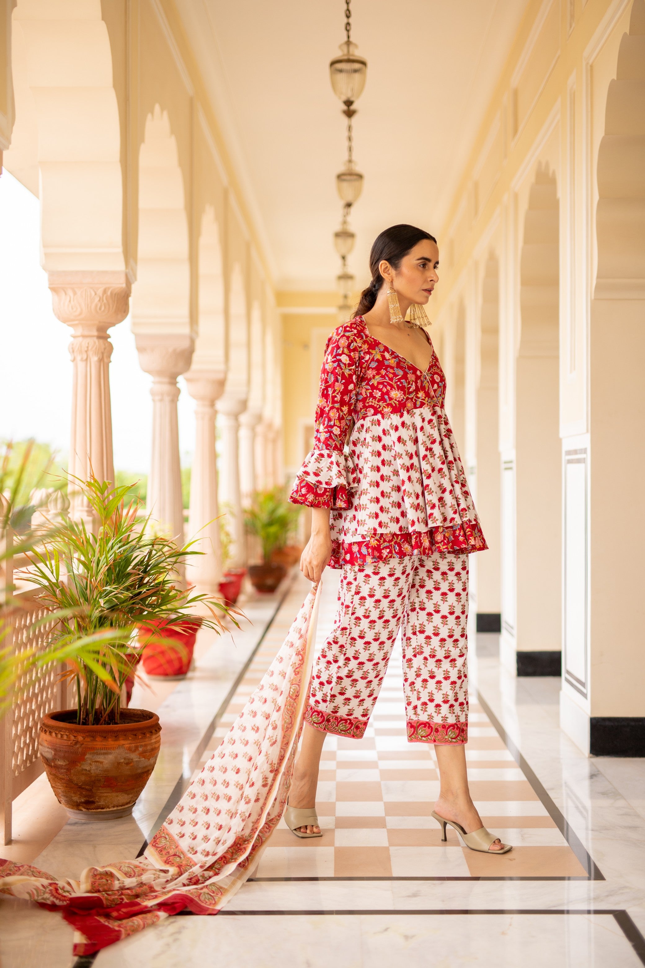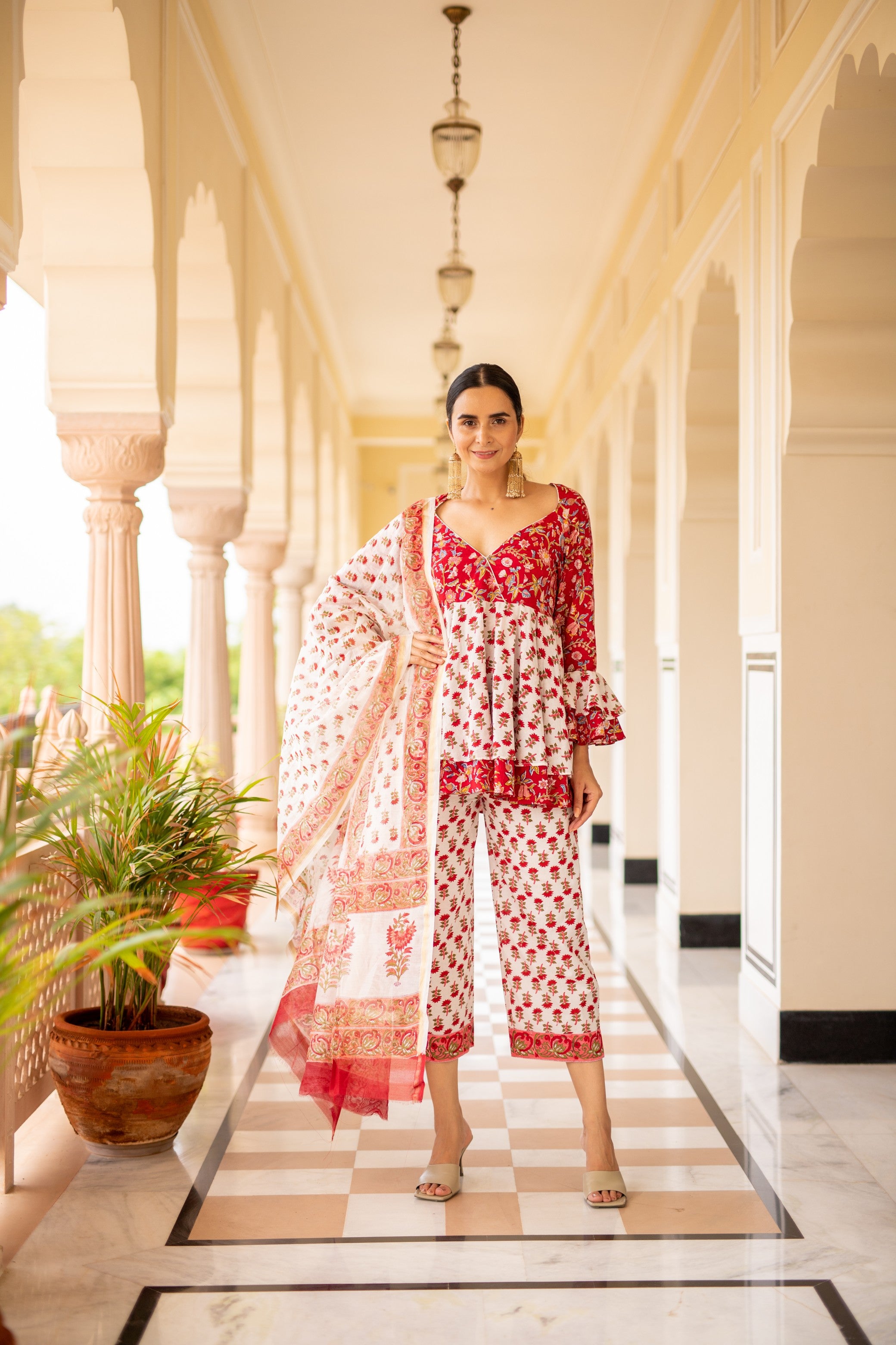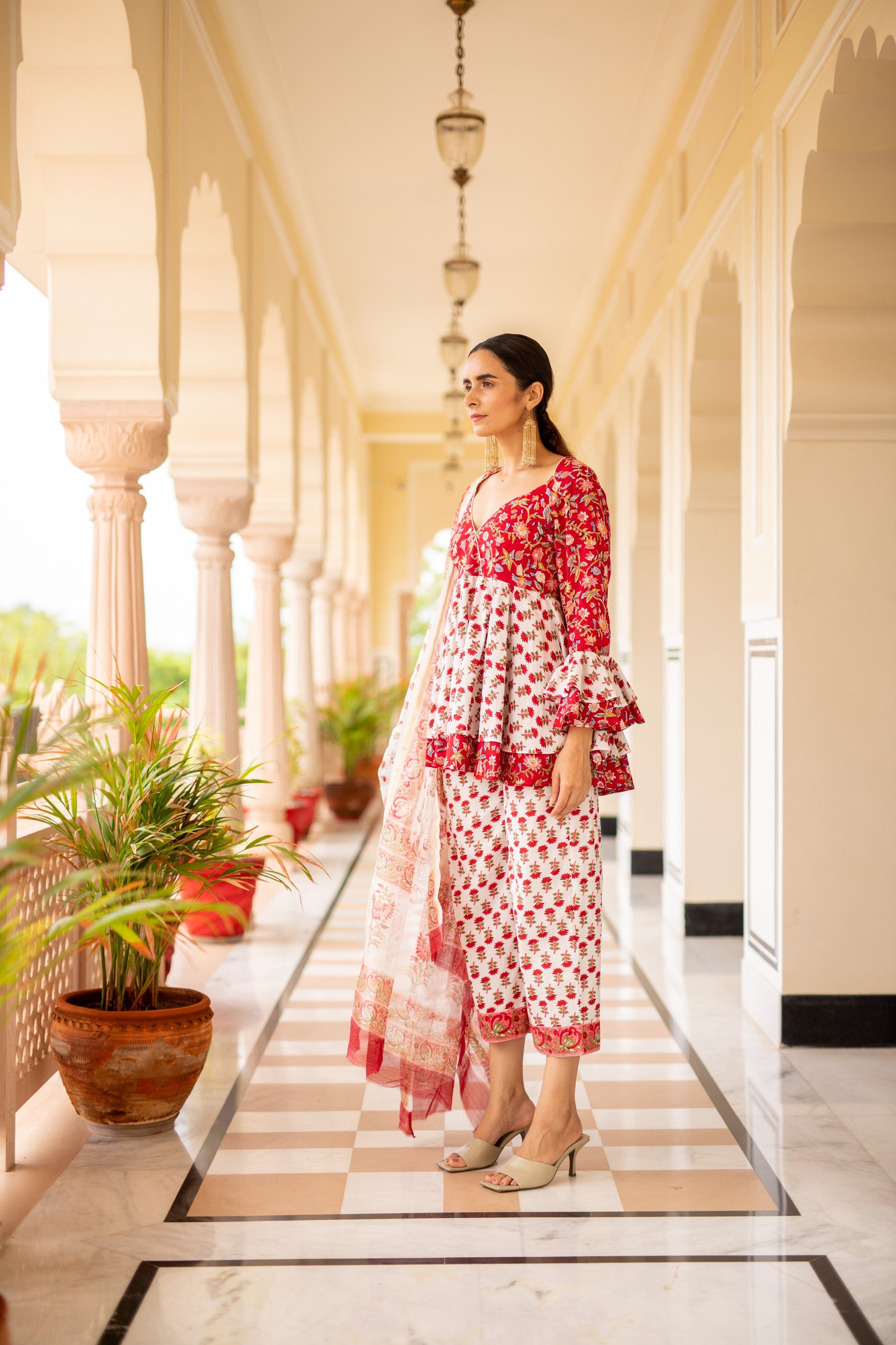 Featuring A Sweetheart Neck Kurta With Double Alined Flare In Cotton Blend Base Block Print. It Is Paired With Matching Pants And Dupatta.