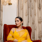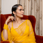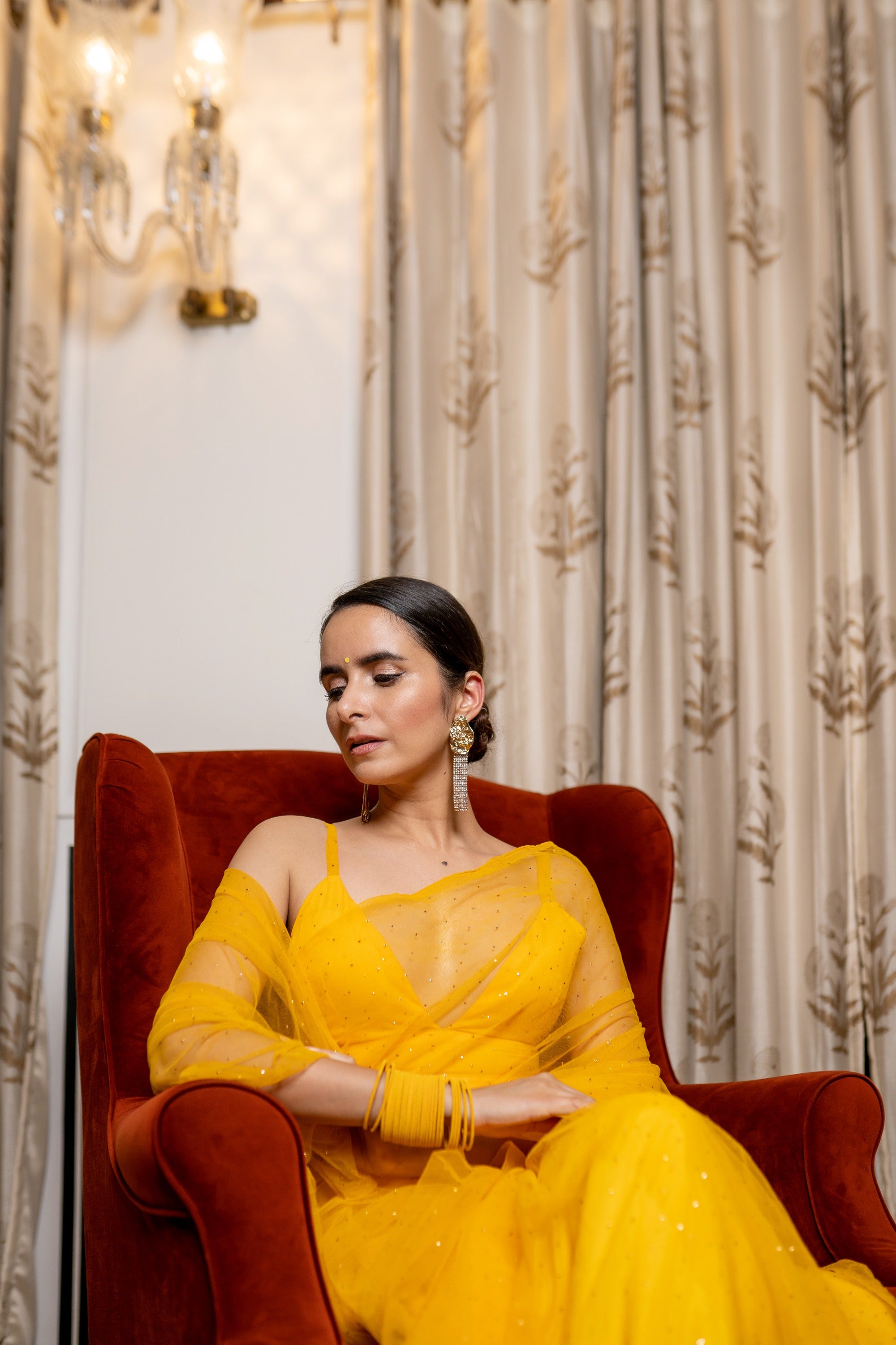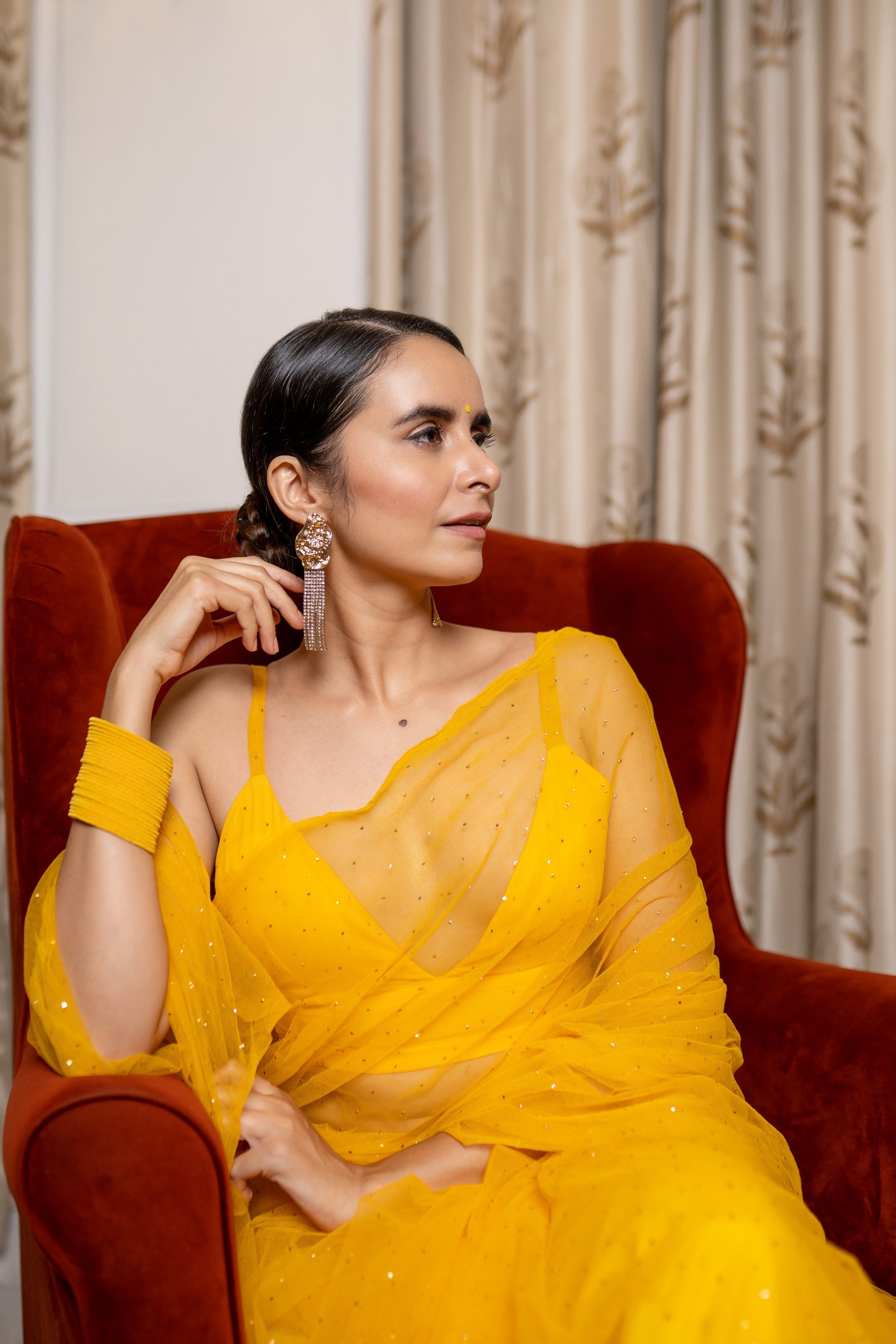 Featuring a yellow saree in net base with Mukesh work. It is paired with a matching strappy v neck blouse.