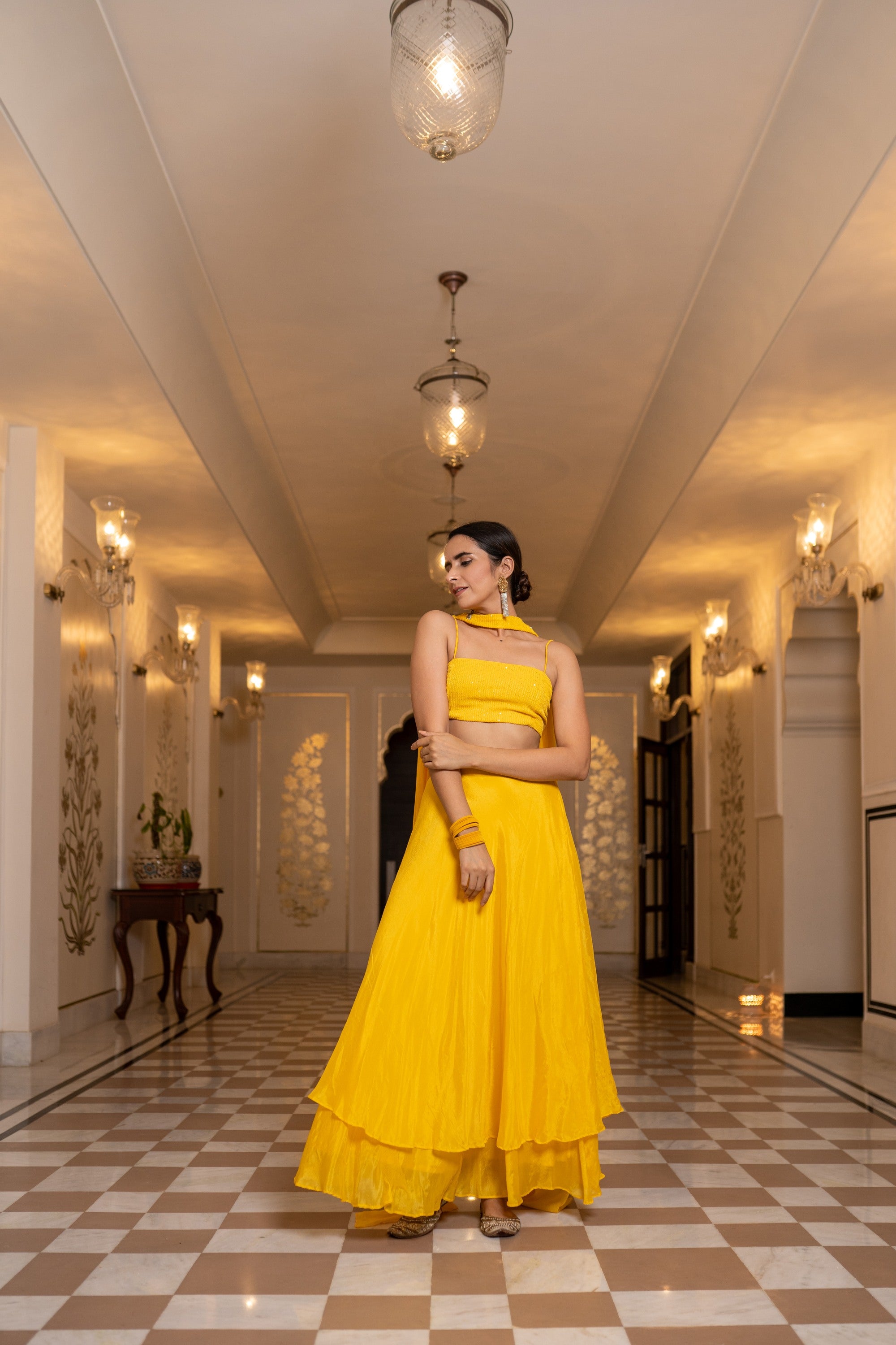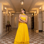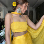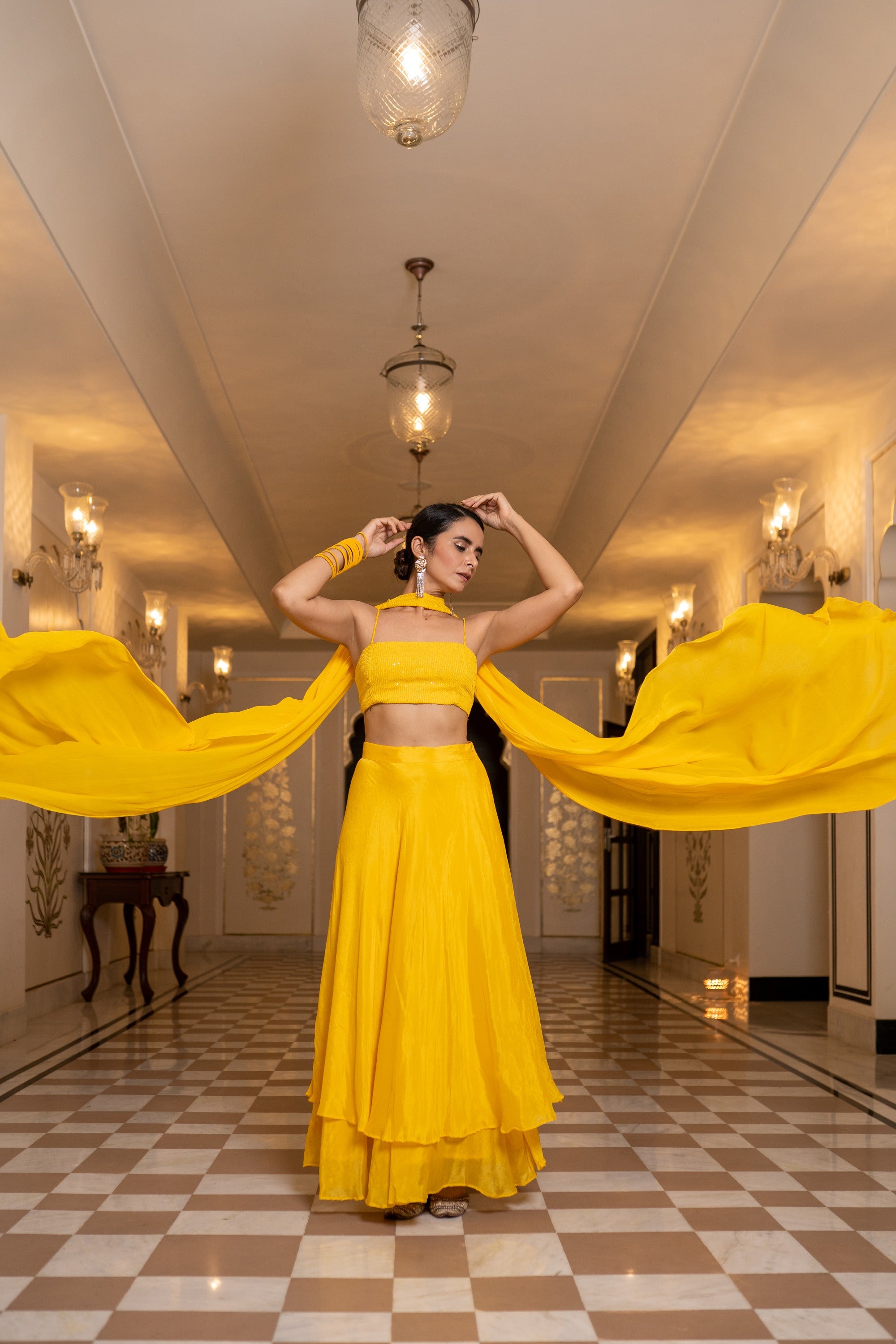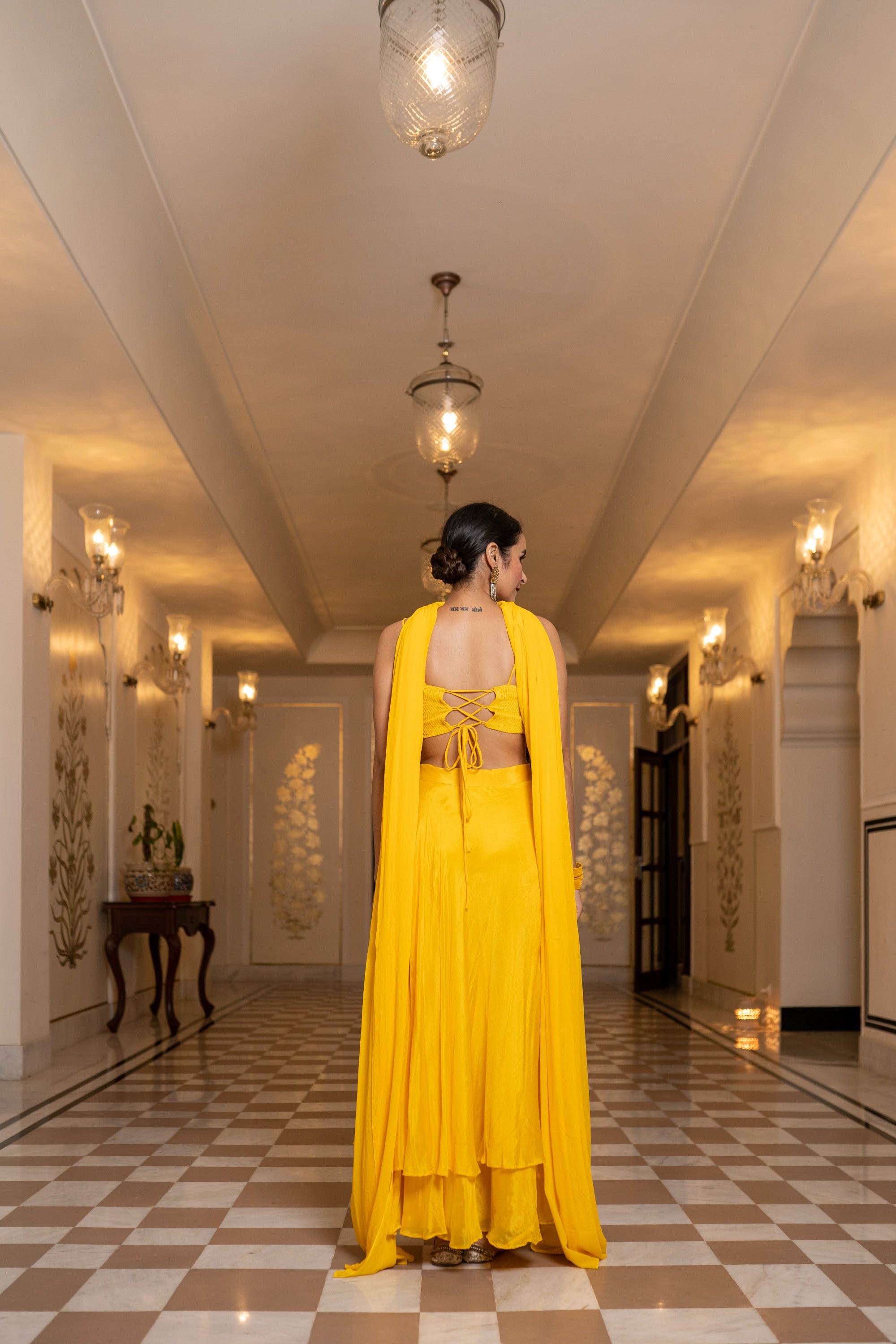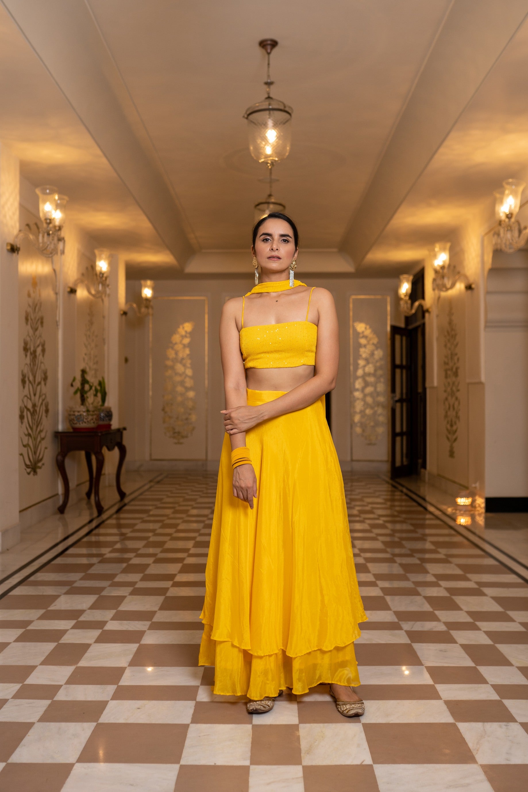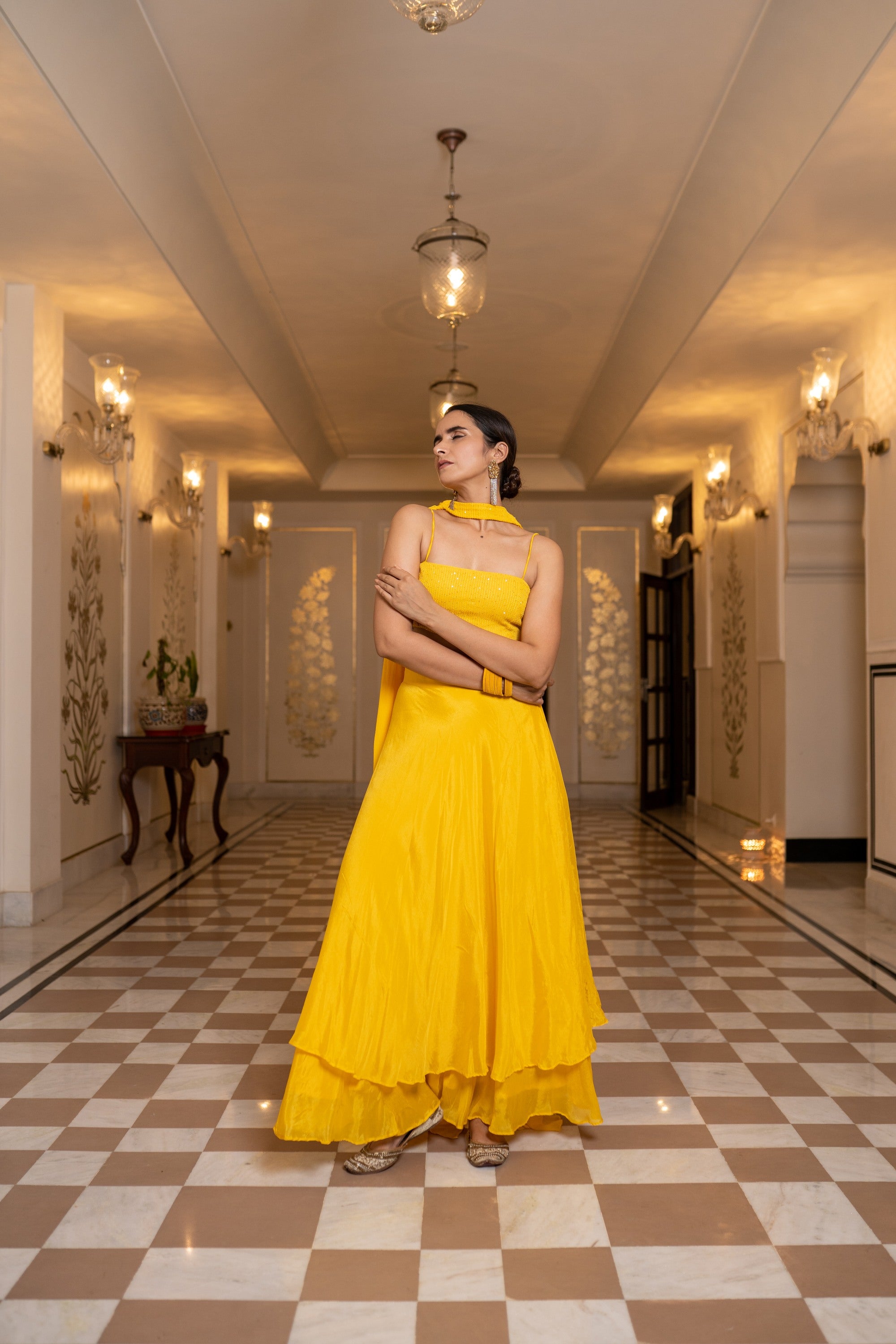 Featuring A Yellow Sharara Set In Chinon Base. It Is Paired With Matching A Dupatta In Base.