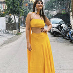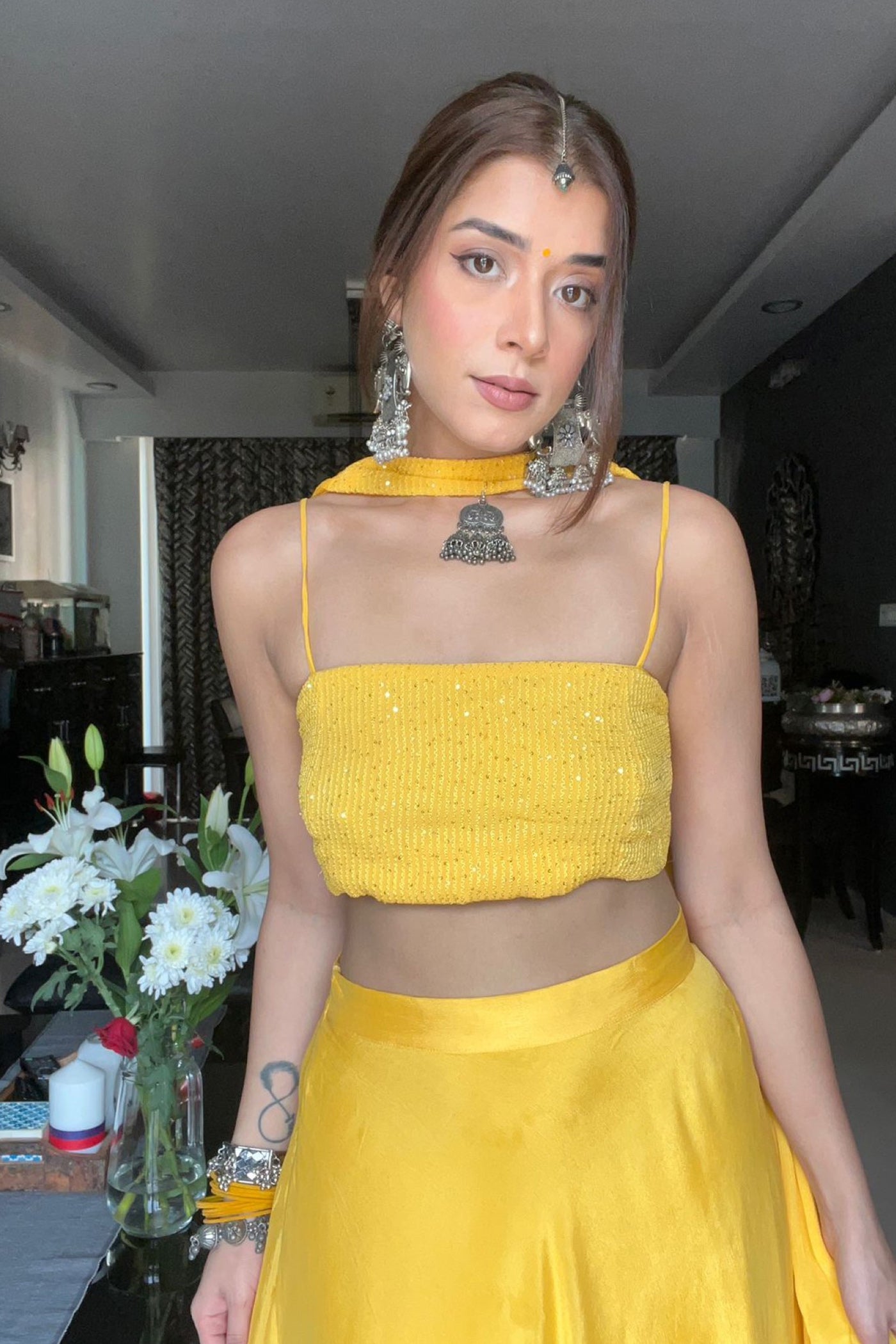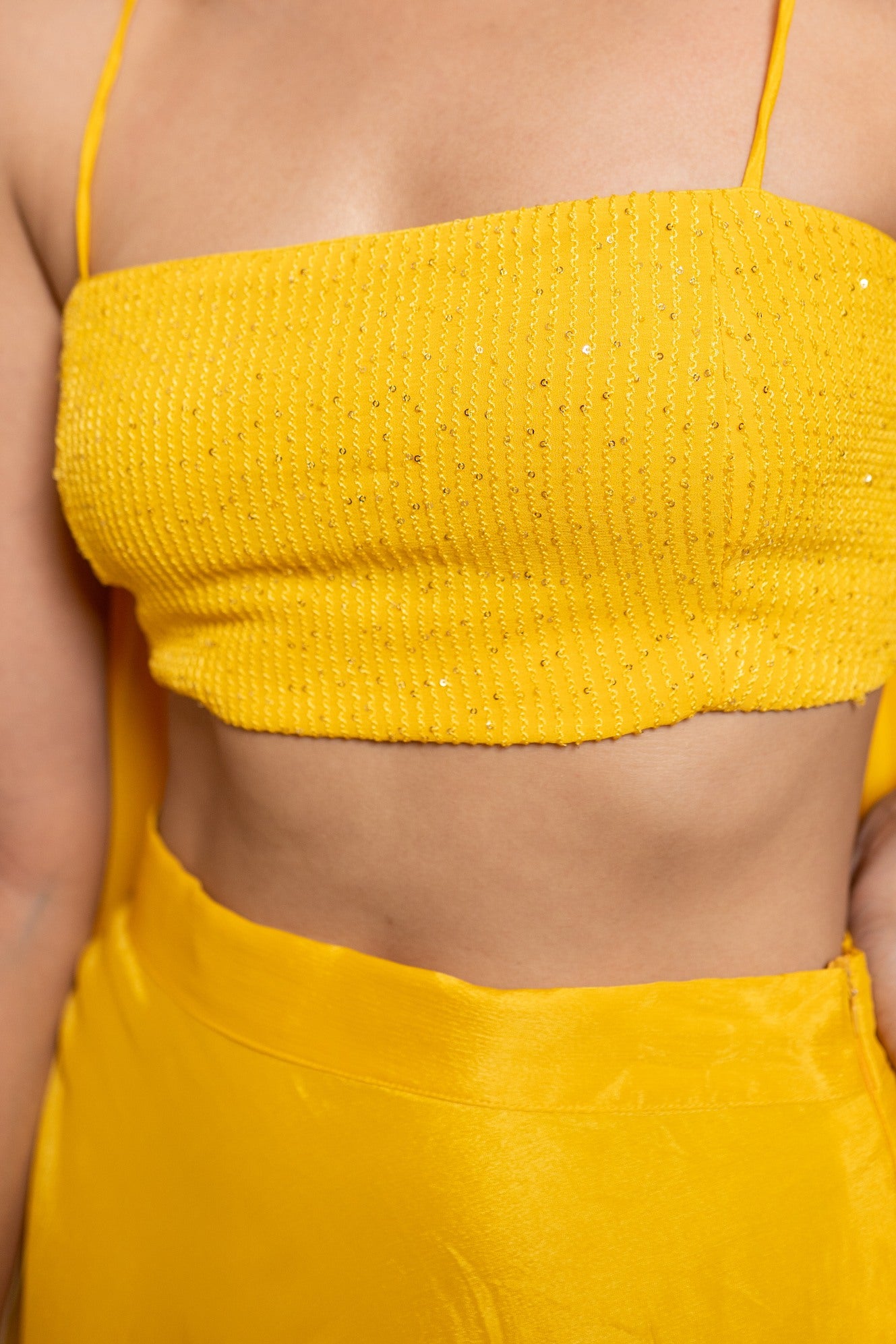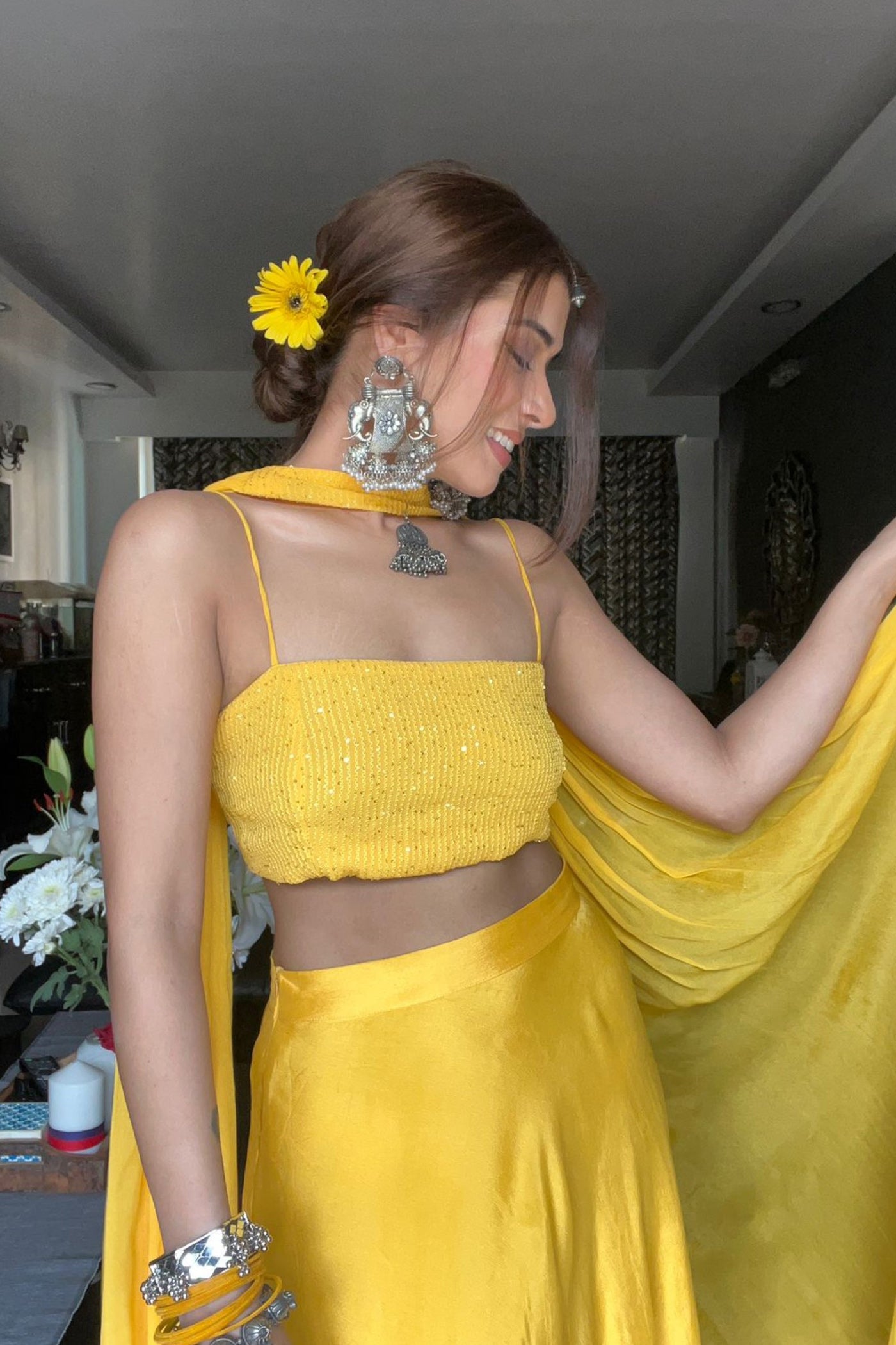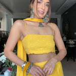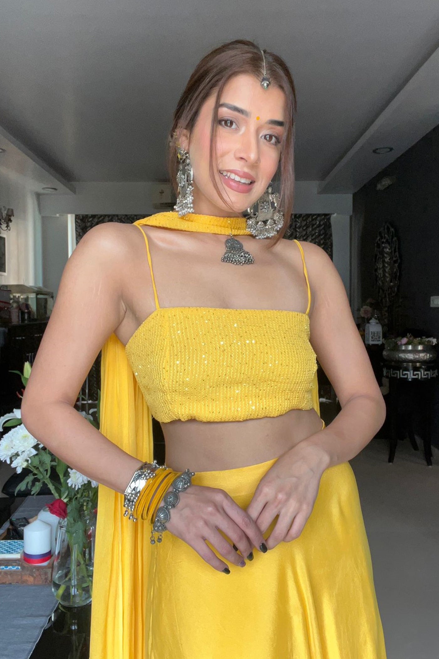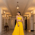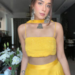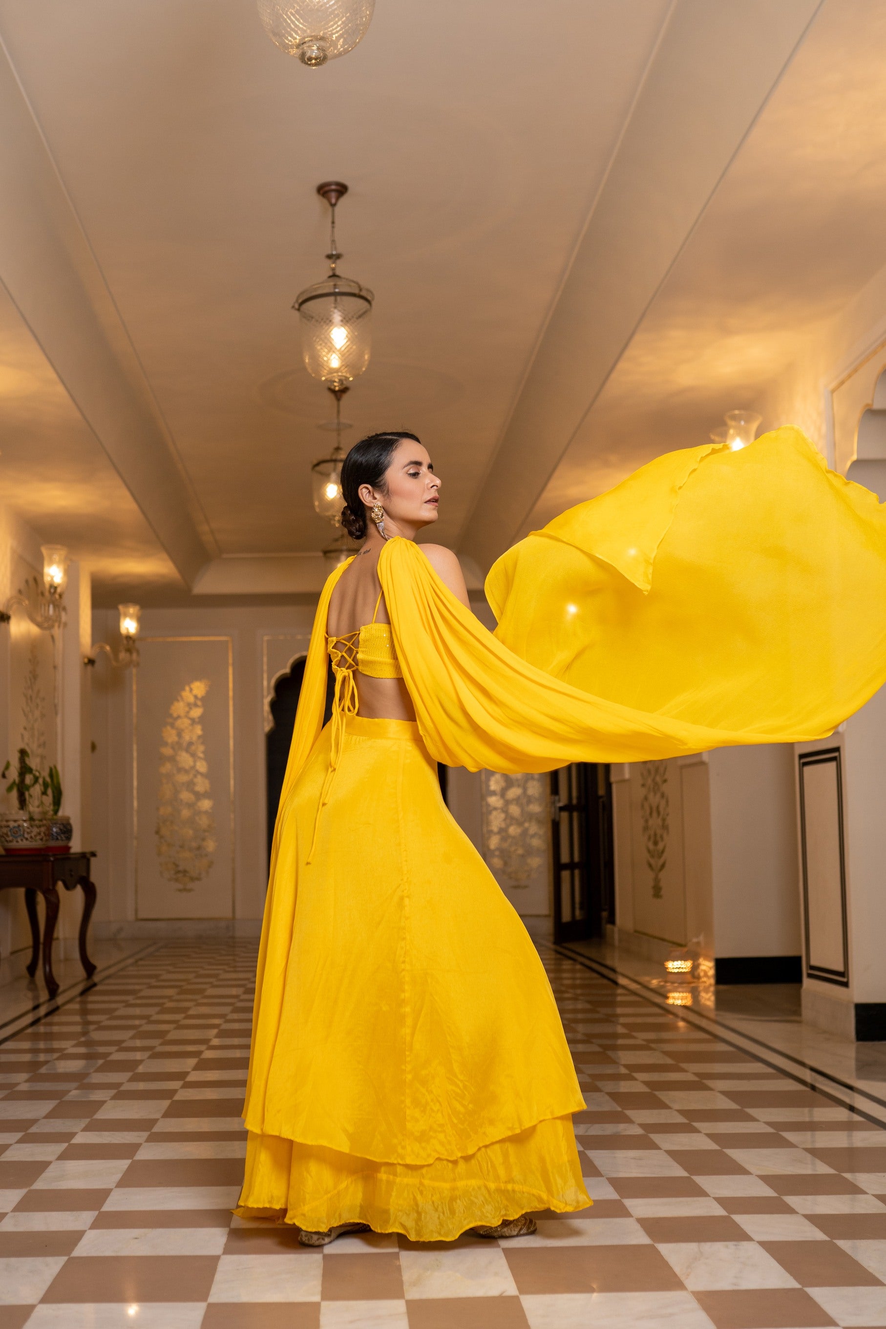 Featuring A Yellow Sharara Set In Chinon Base. It Is Paired With Matching A Dupatta In Base.
