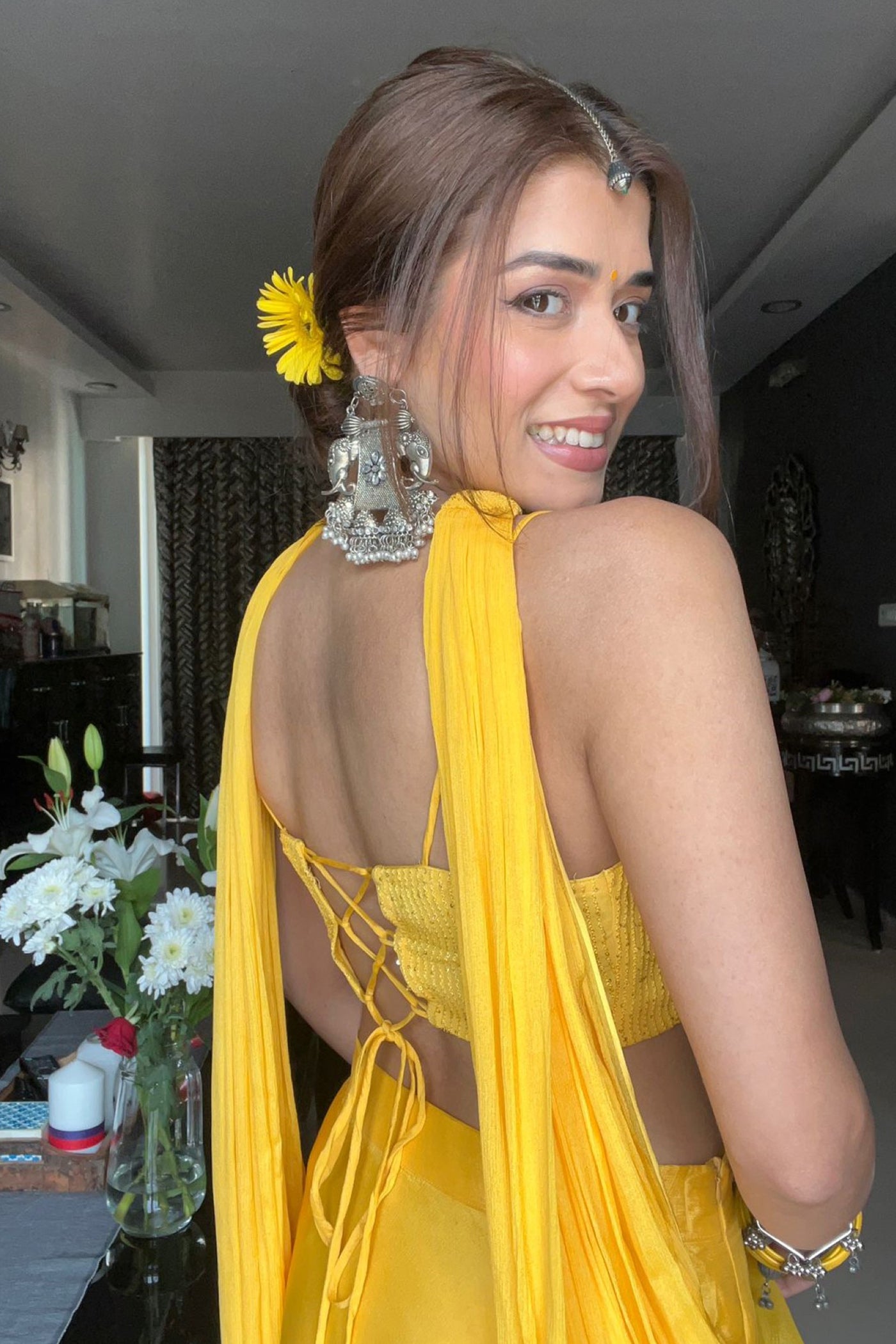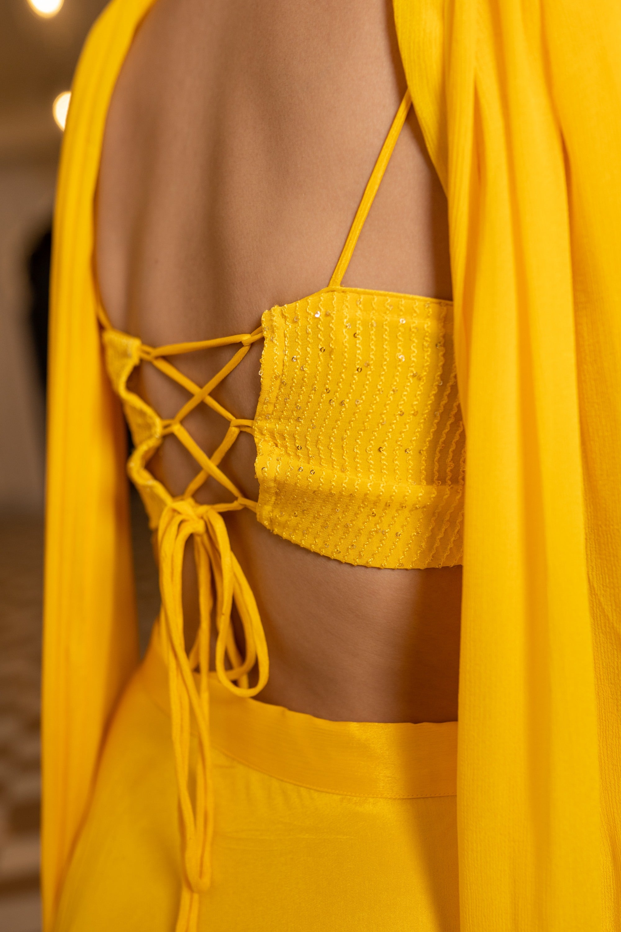 Details: Strappy Blouse With Back String Detailing, Sharara Pants & Dupatta.
