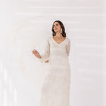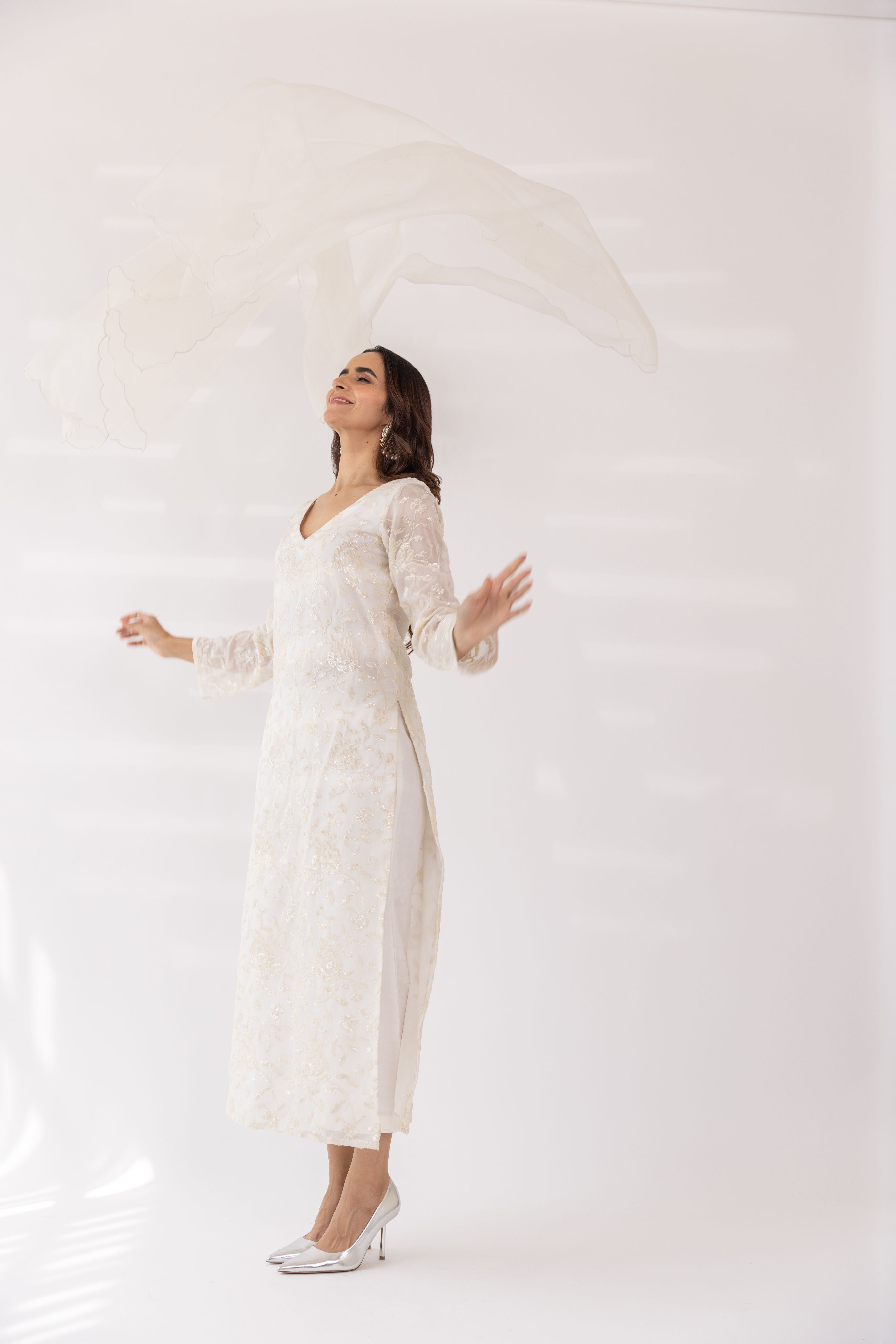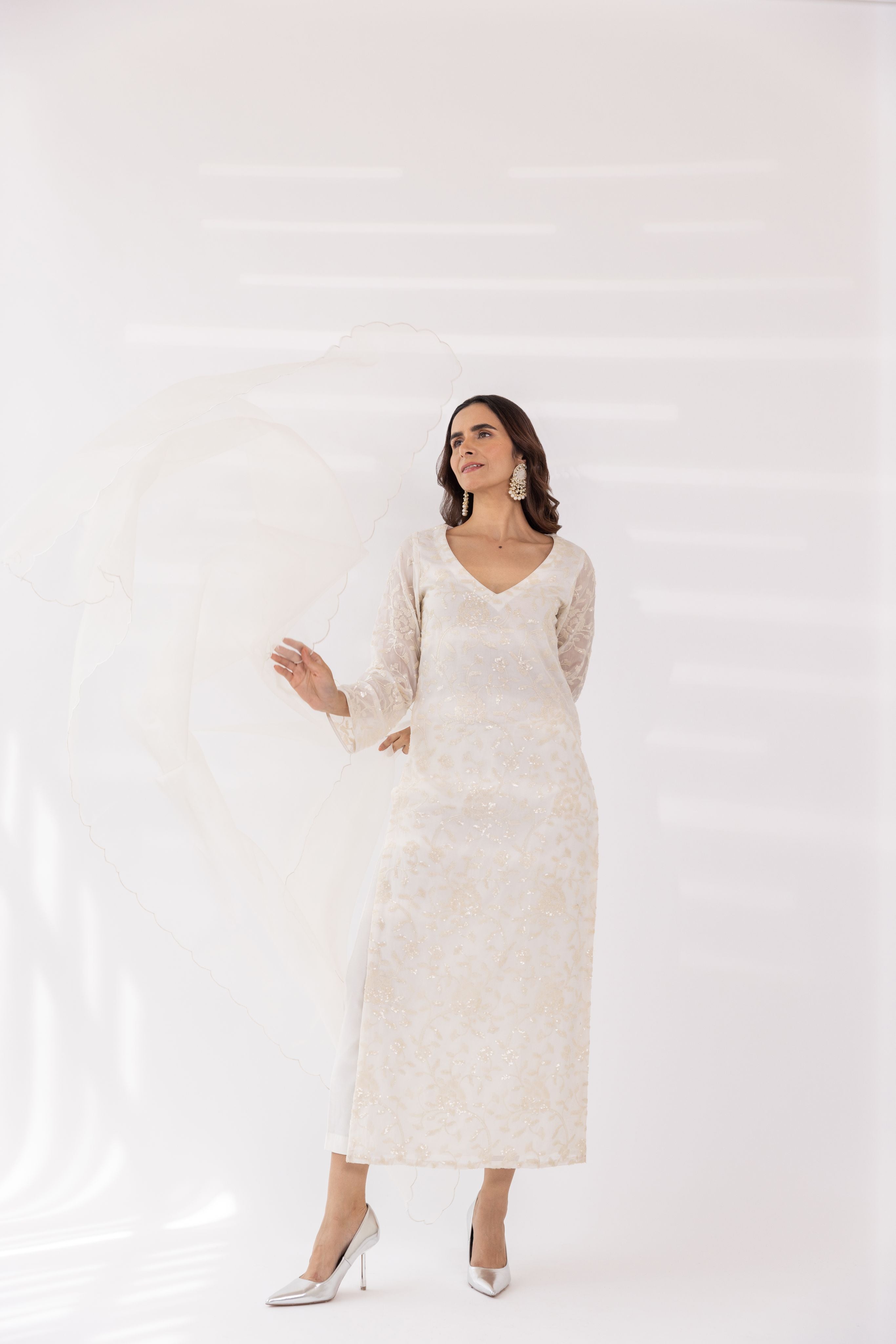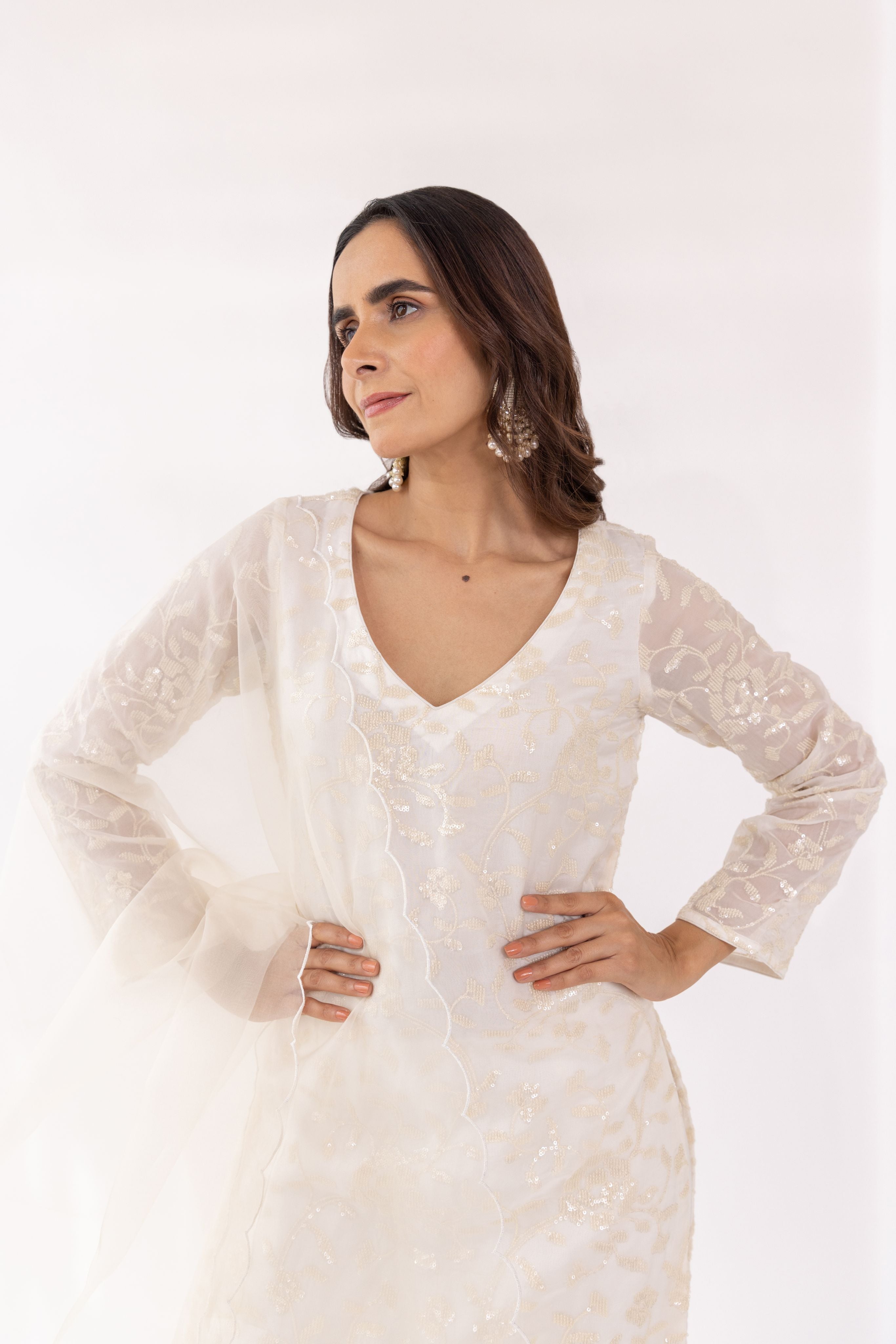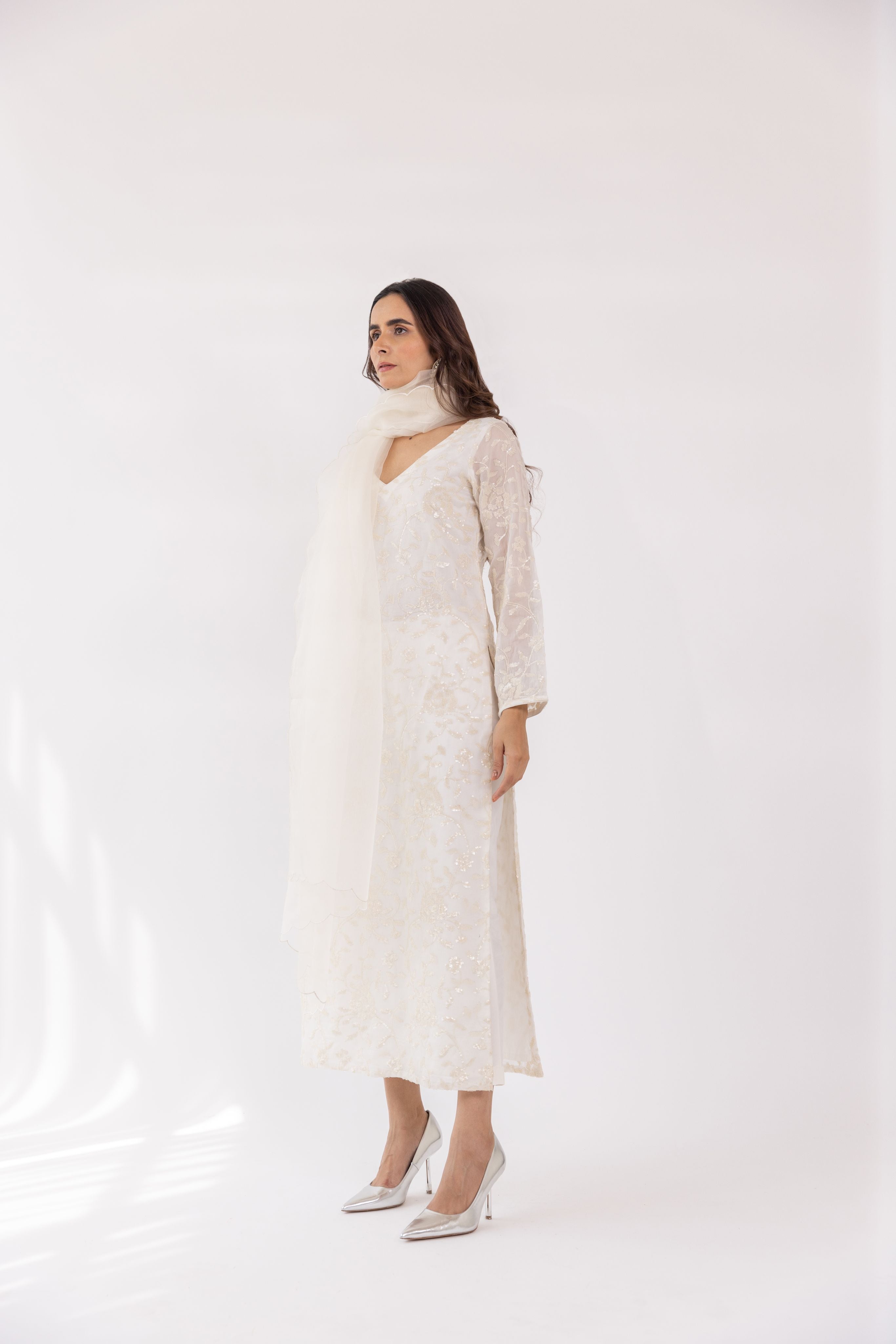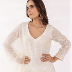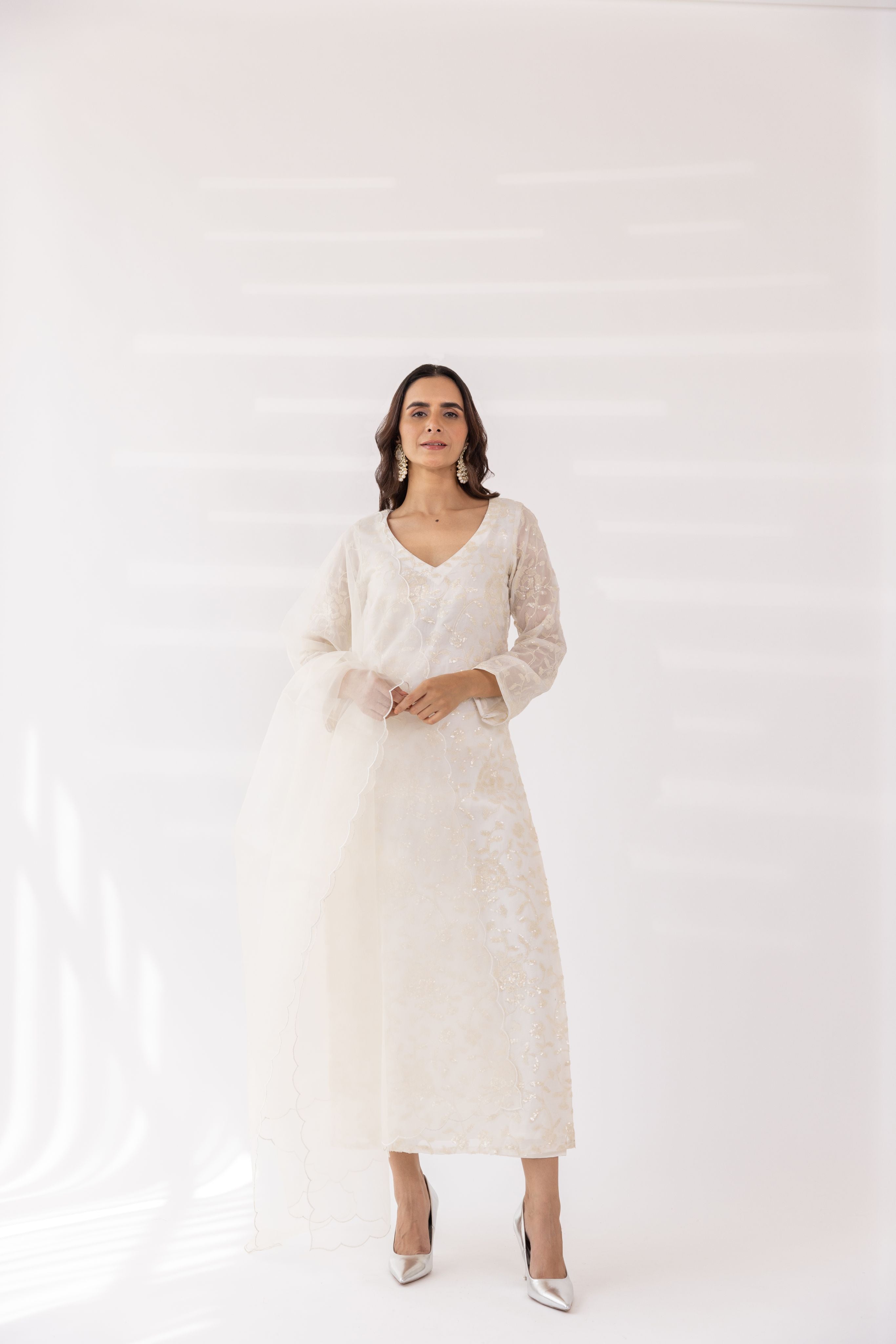 Featuring a white embroidered v-neck kurta set in gorgette base. It is paired with solid pants and scalloped organza dupatta.