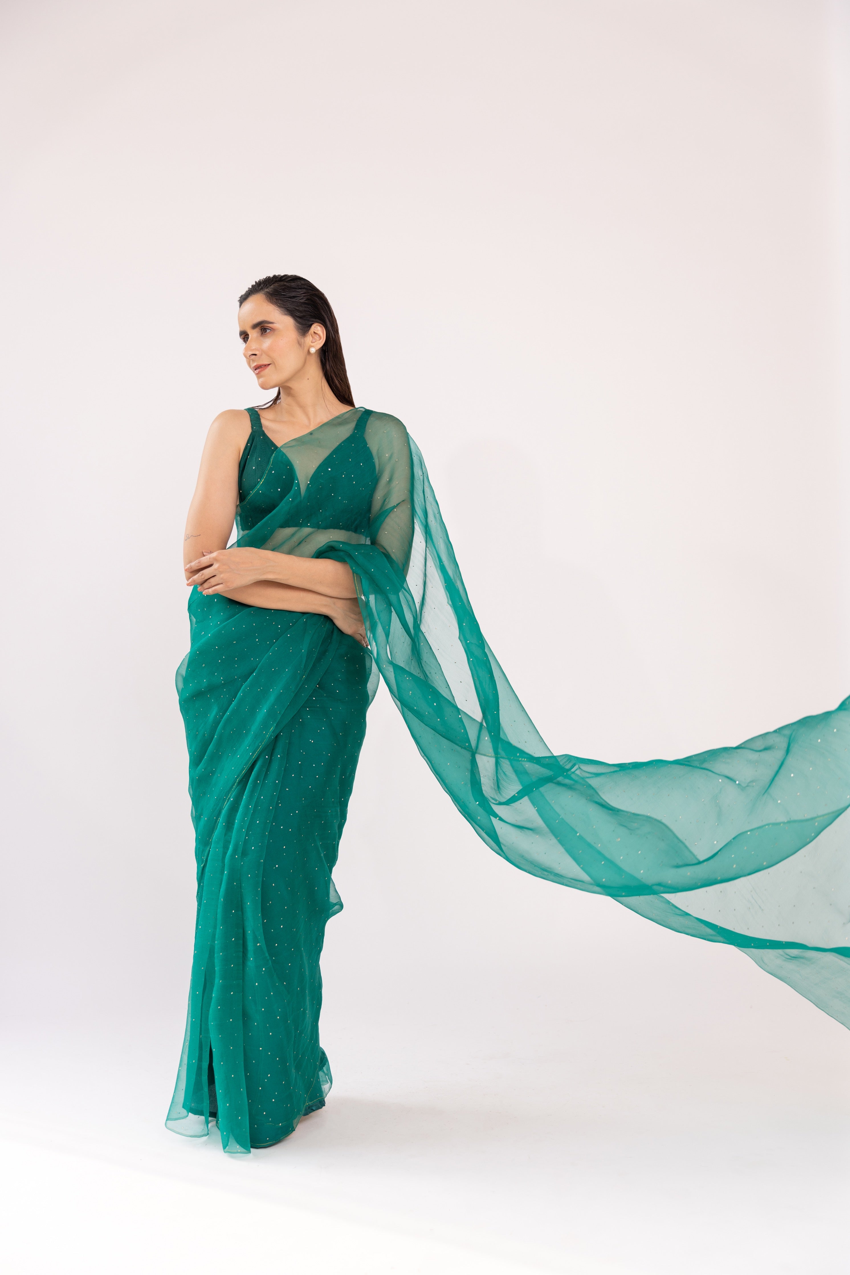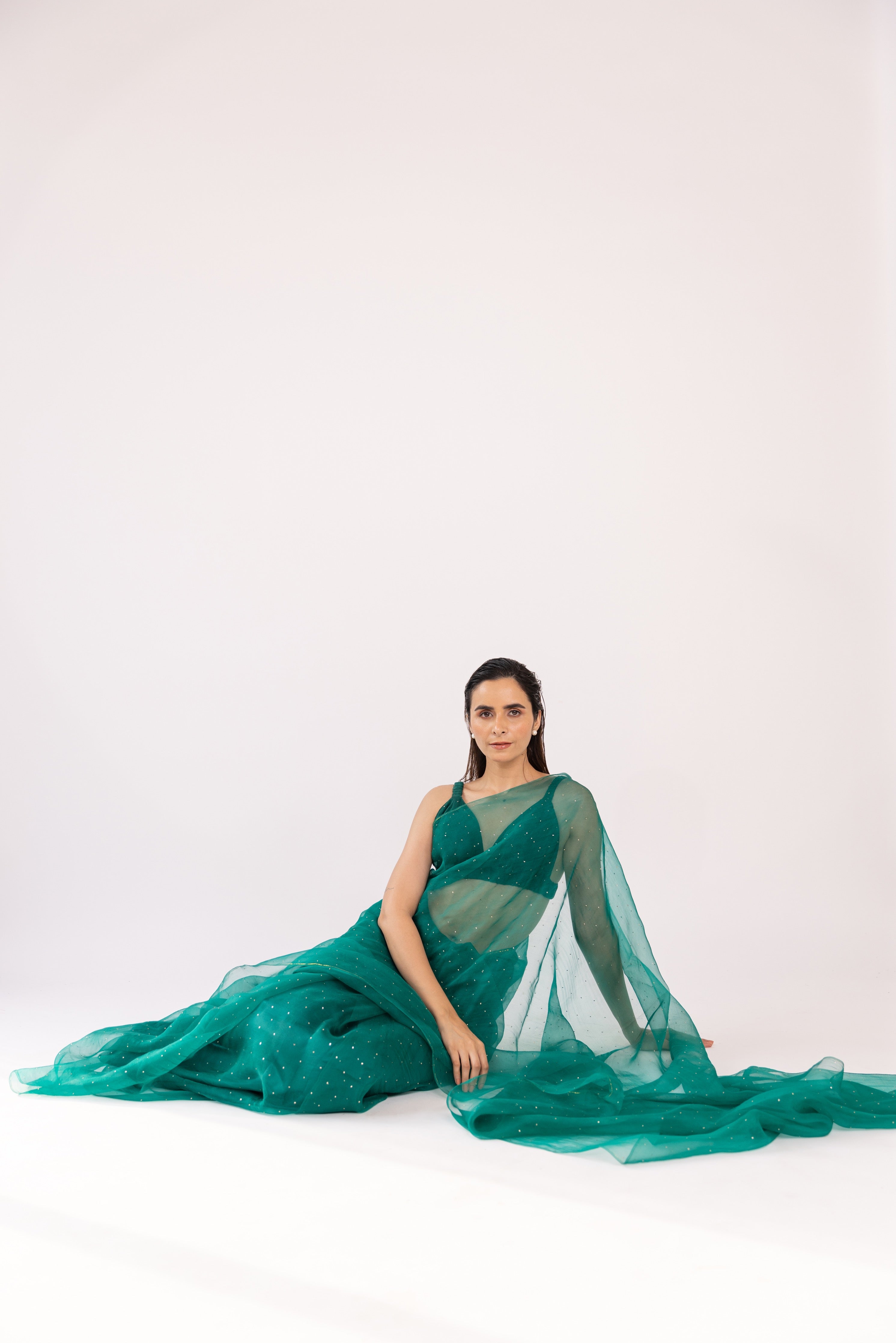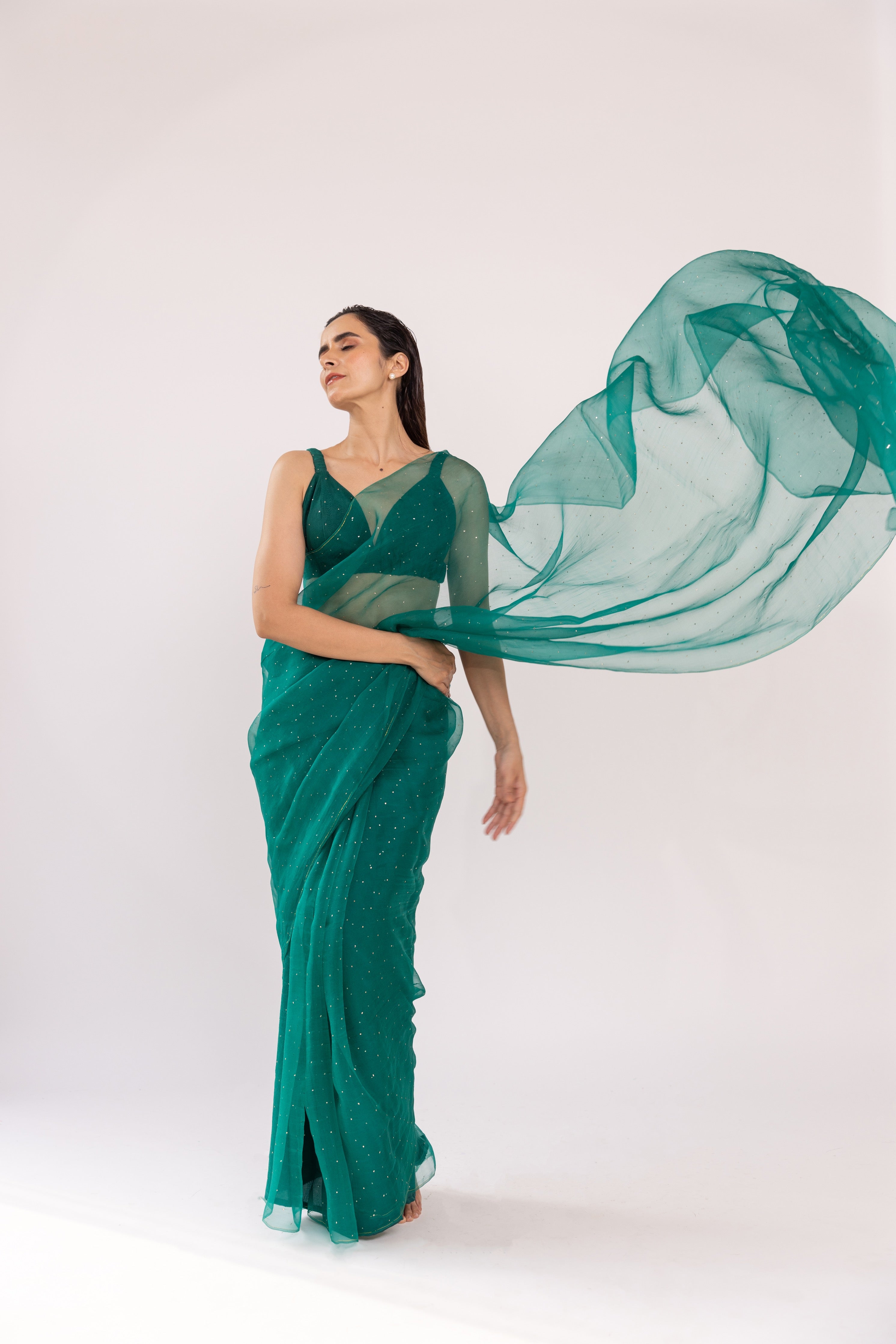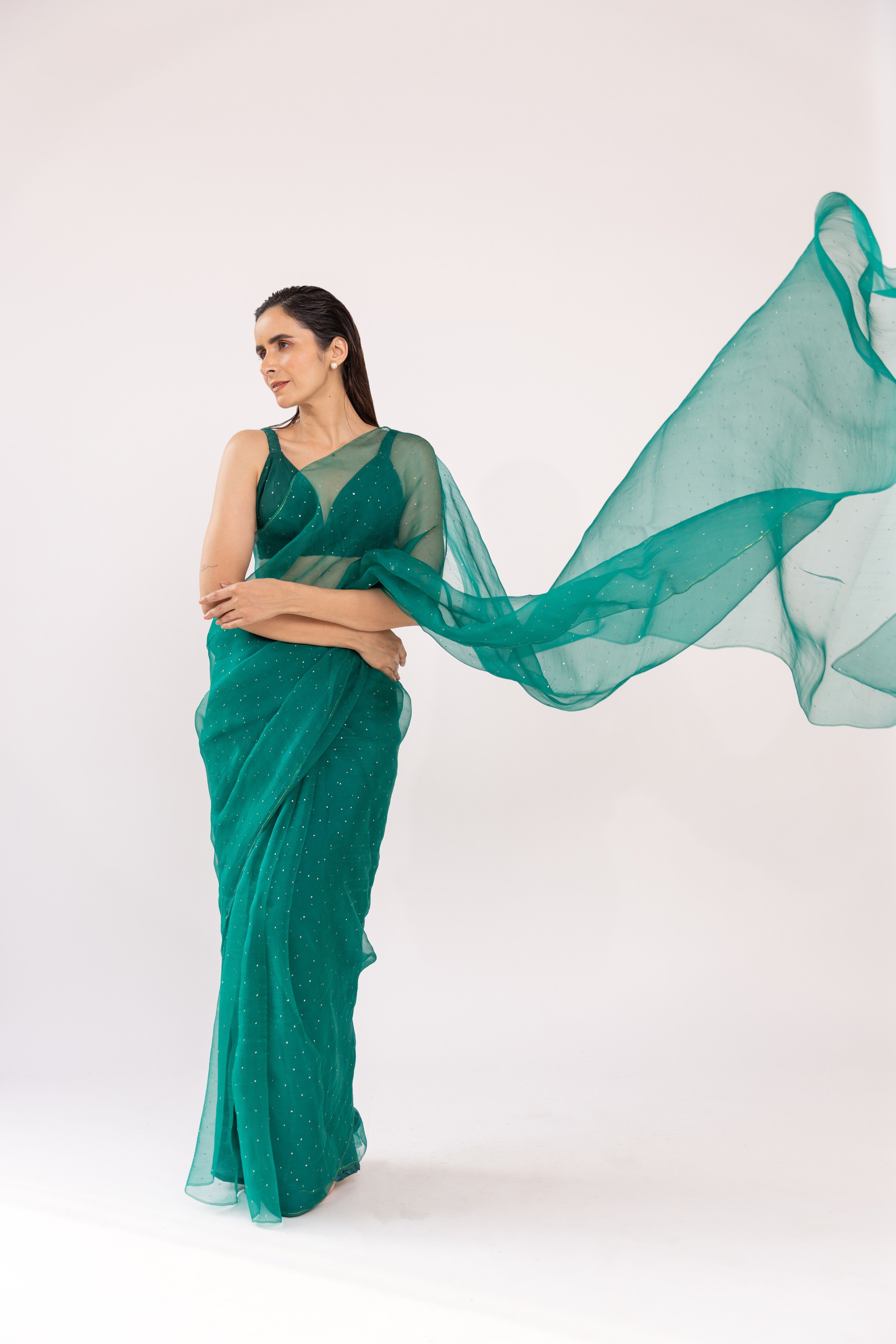 Featuring a opal green saree in silk organza base. It is paired with a plunging v neckline blouse.