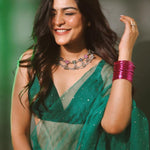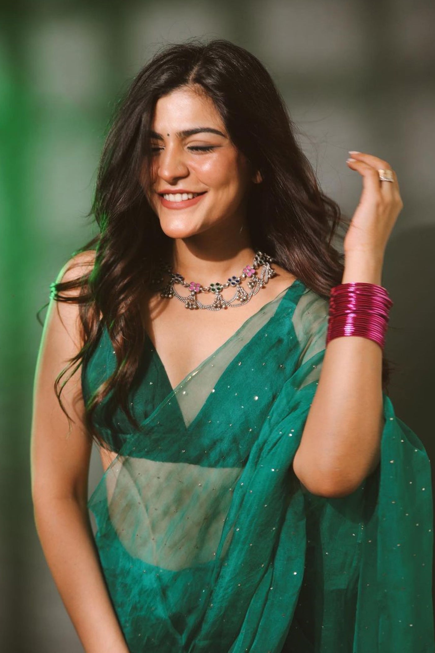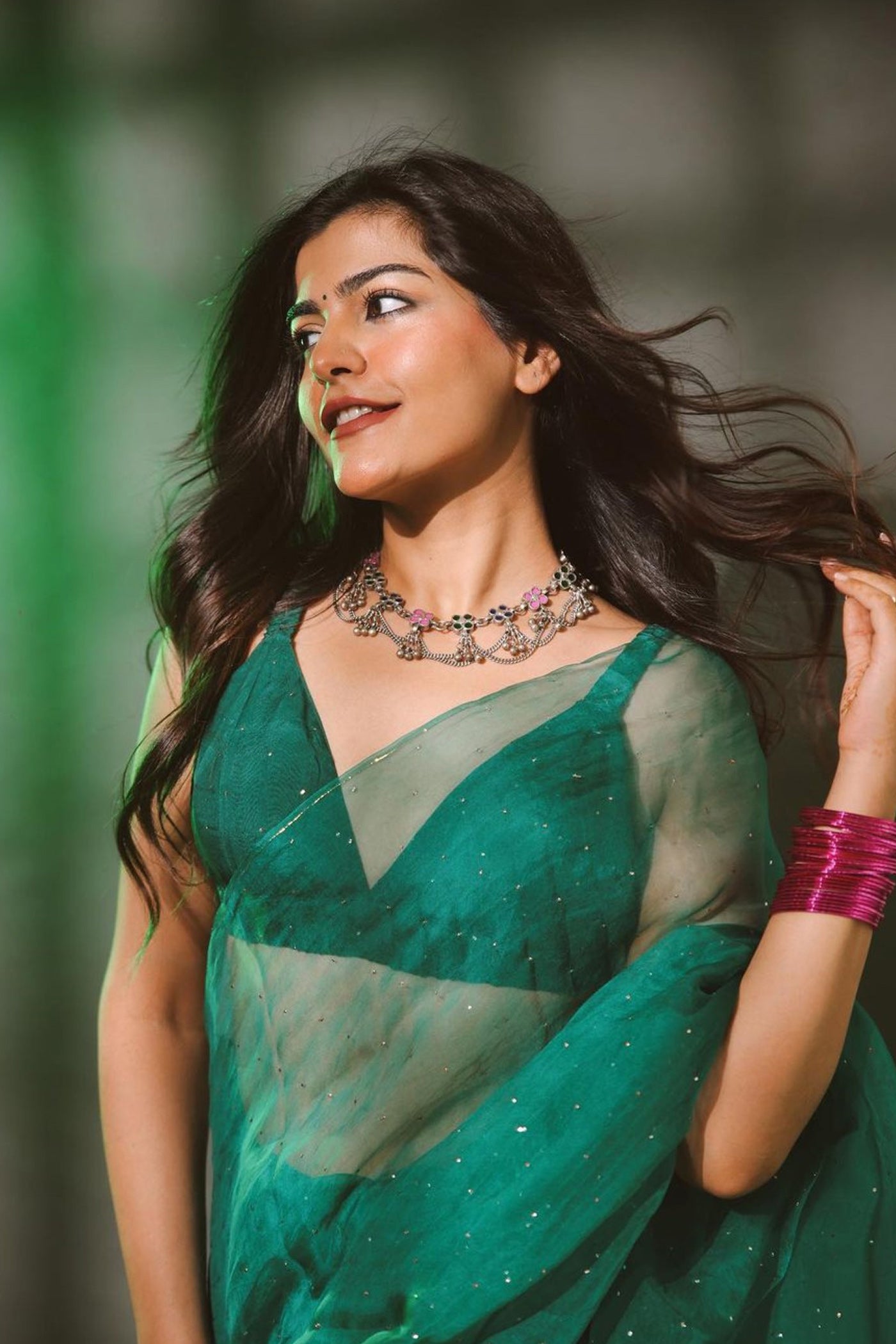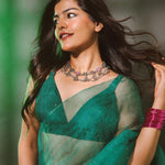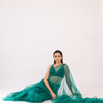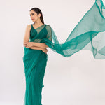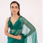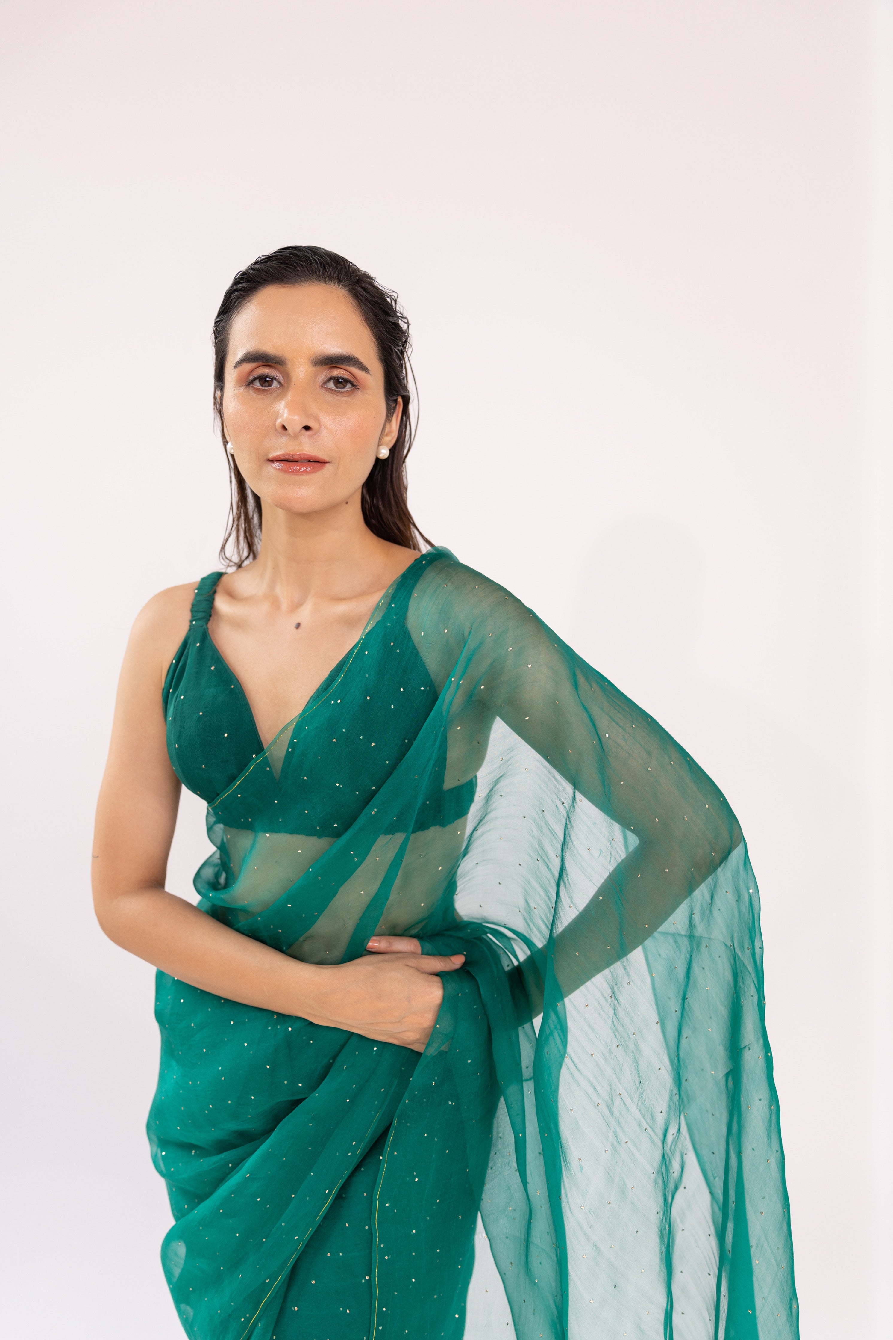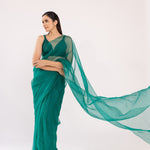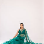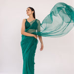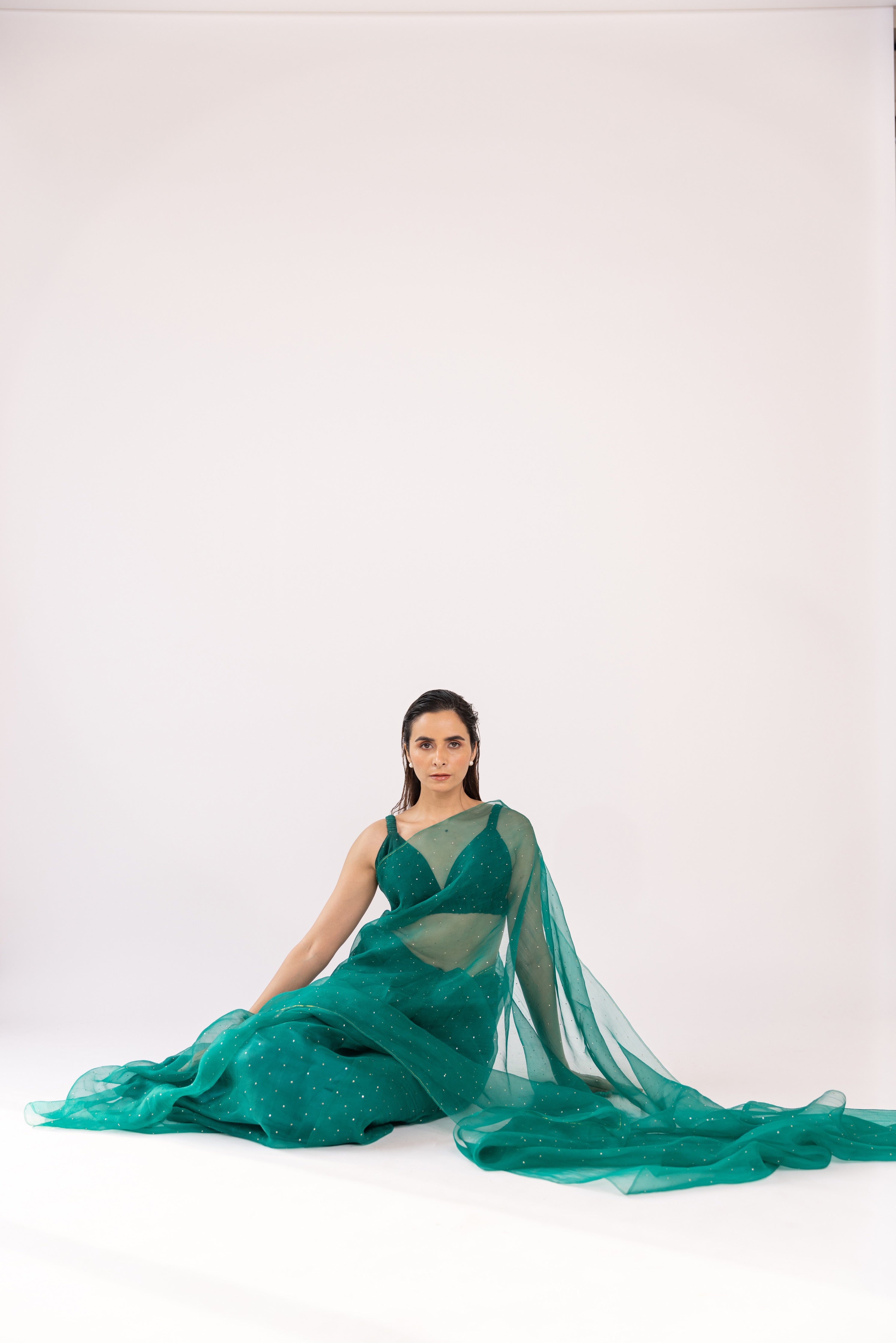 Featuring a opal green saree in silk organza base. It is paired with a plunging v neckline blouse.
