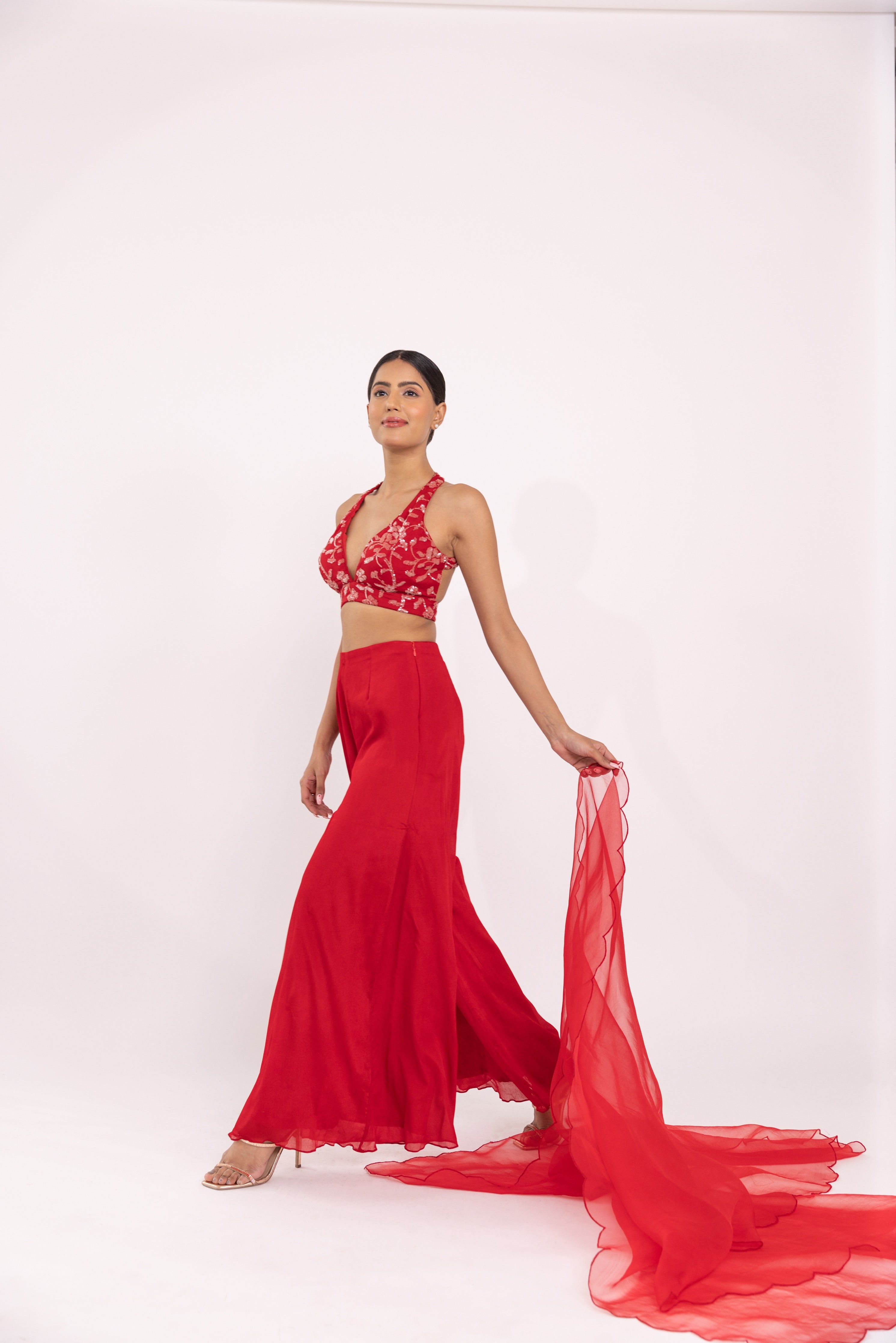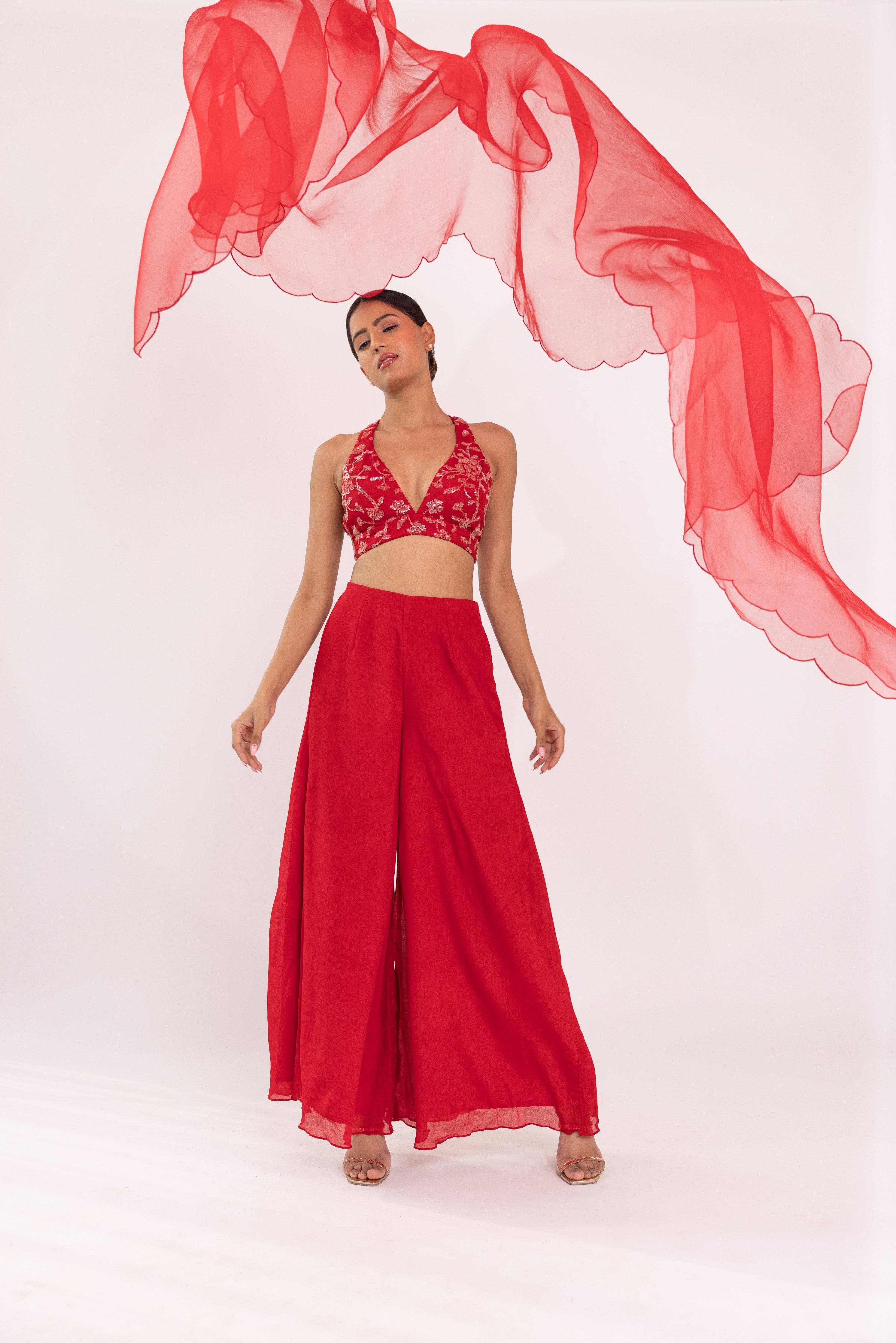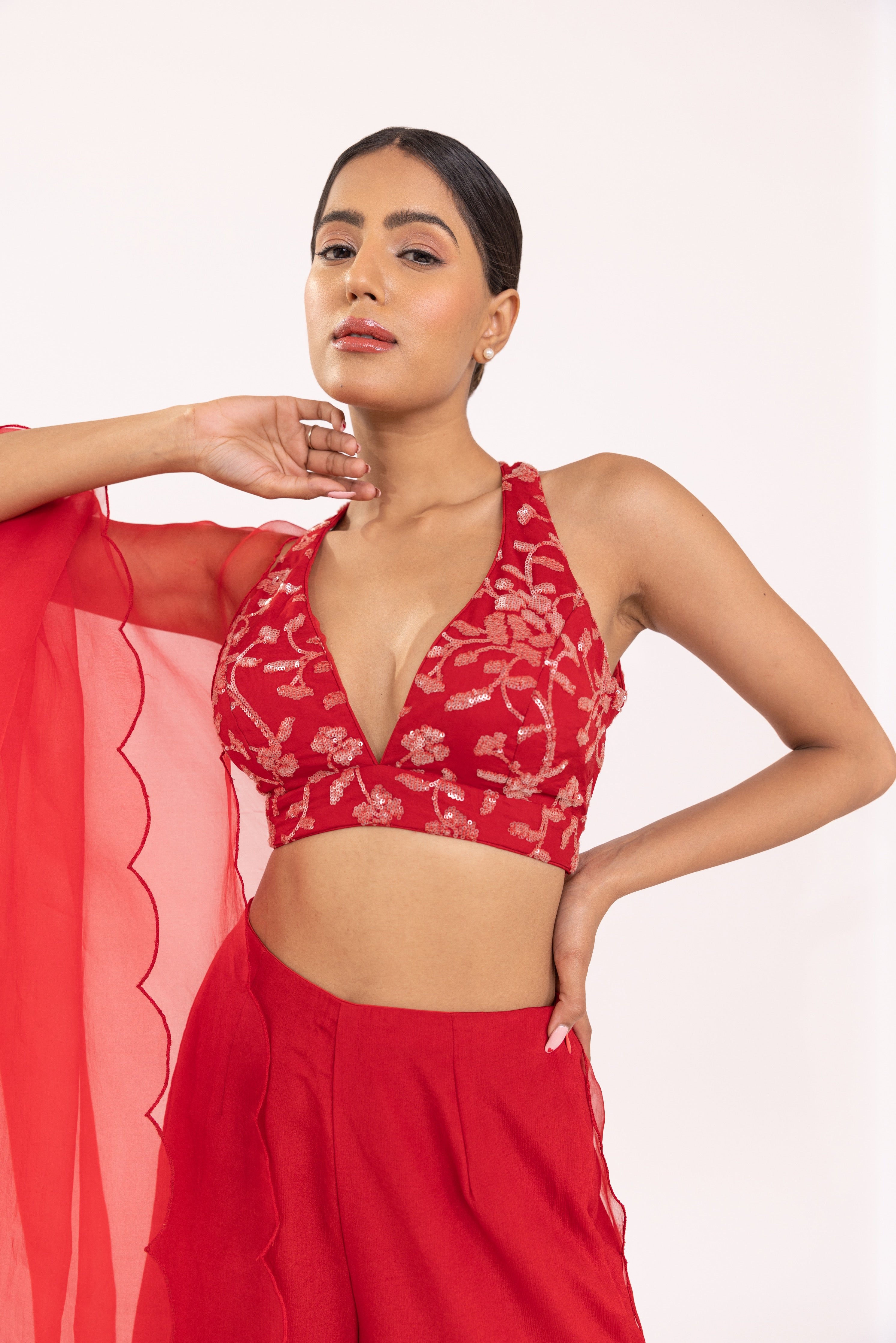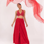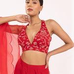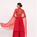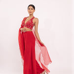 Featuring a red halte embroidered blouse in georgette base. It is paired with a solid gorgette flared sharara pants and organza embroidered dupatta with scalloped edges.