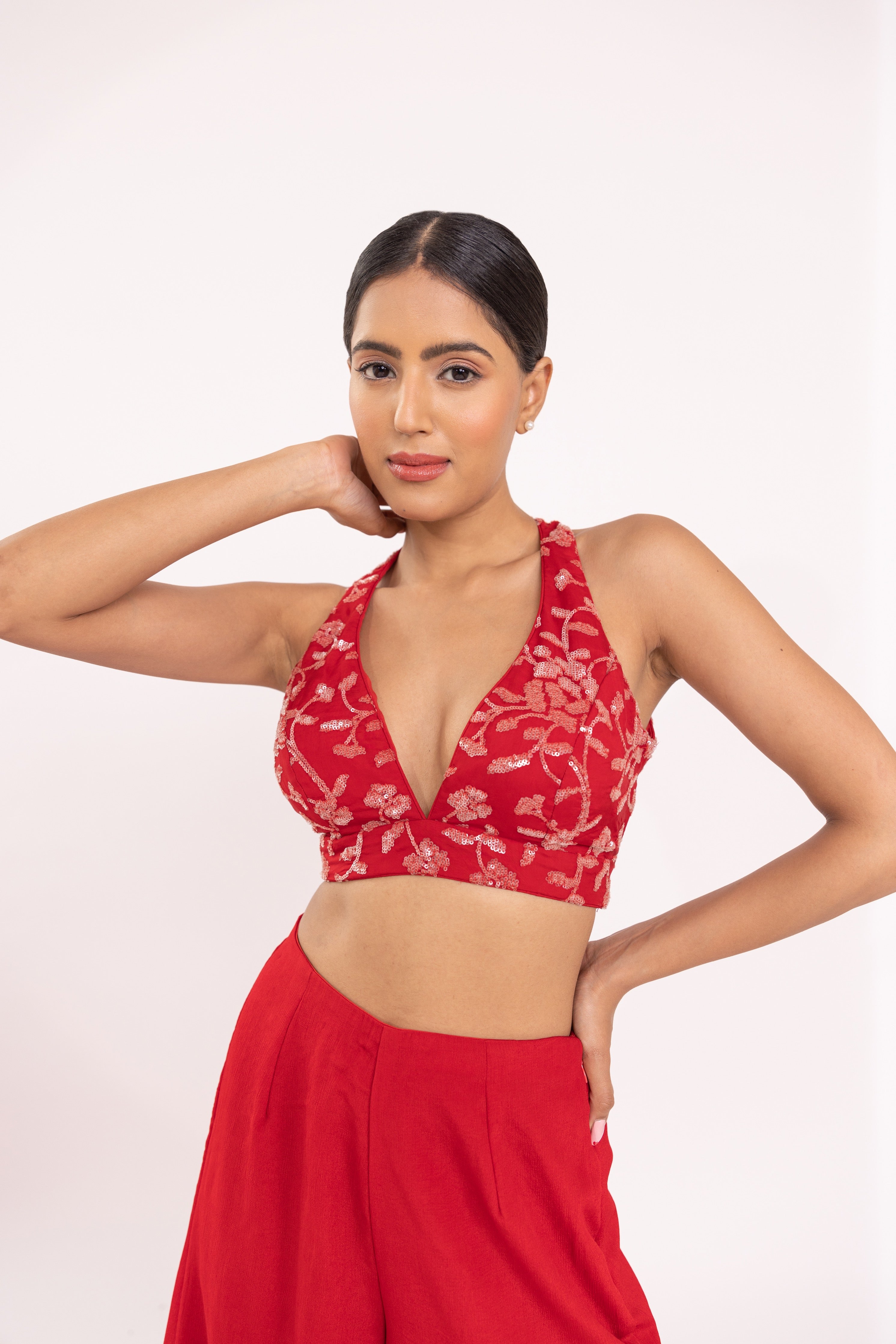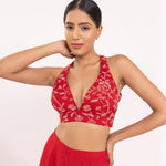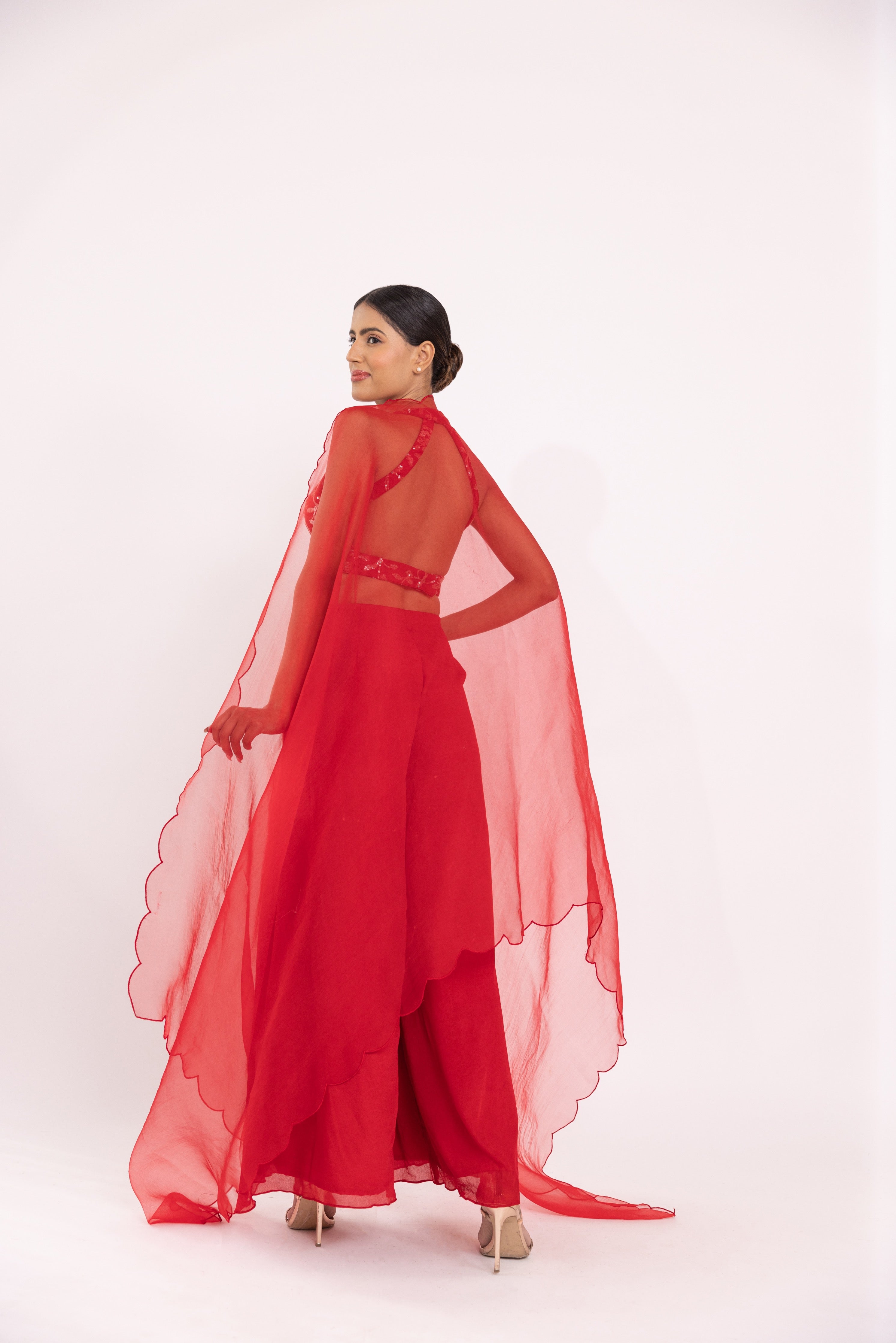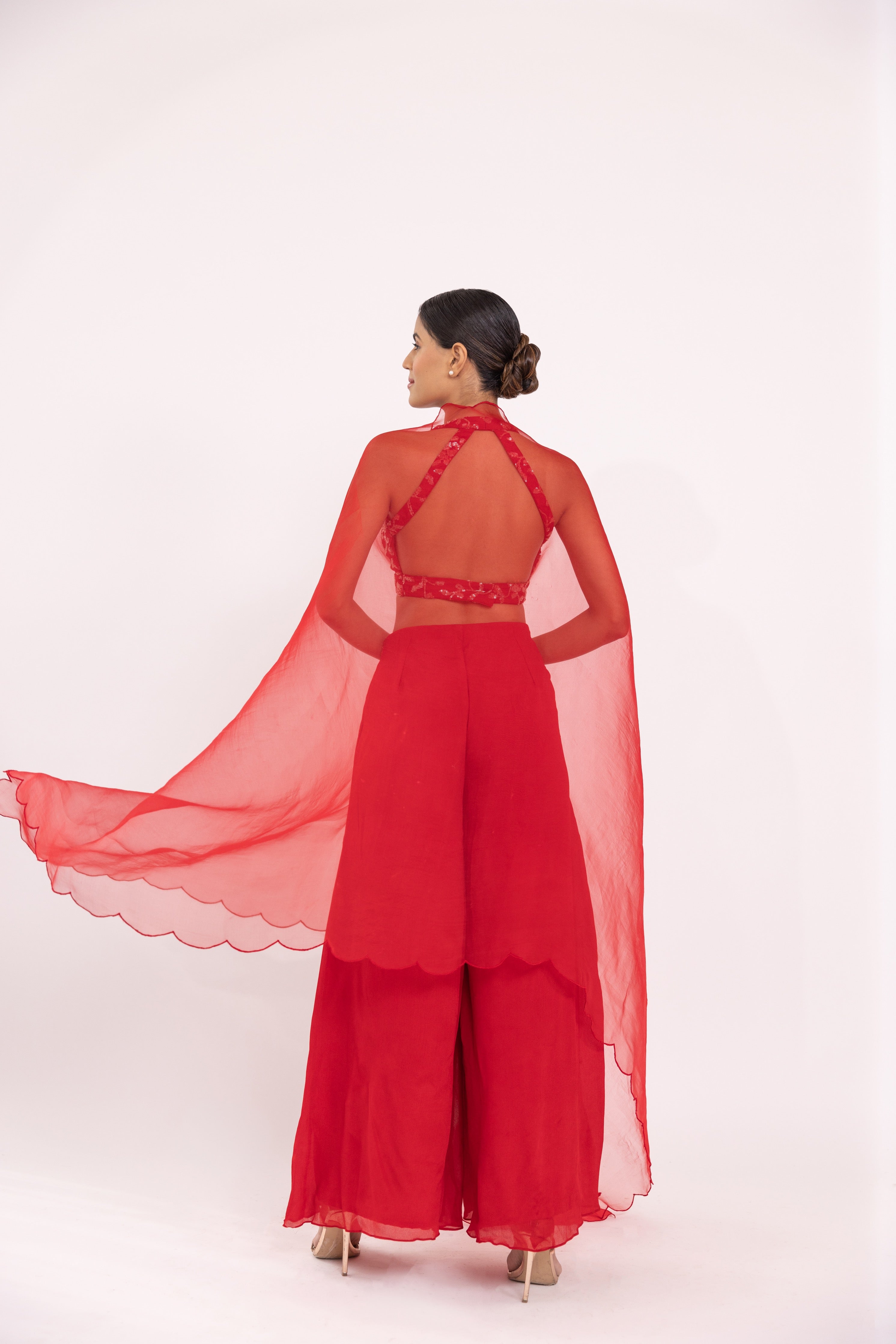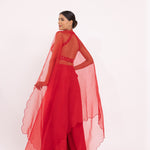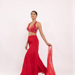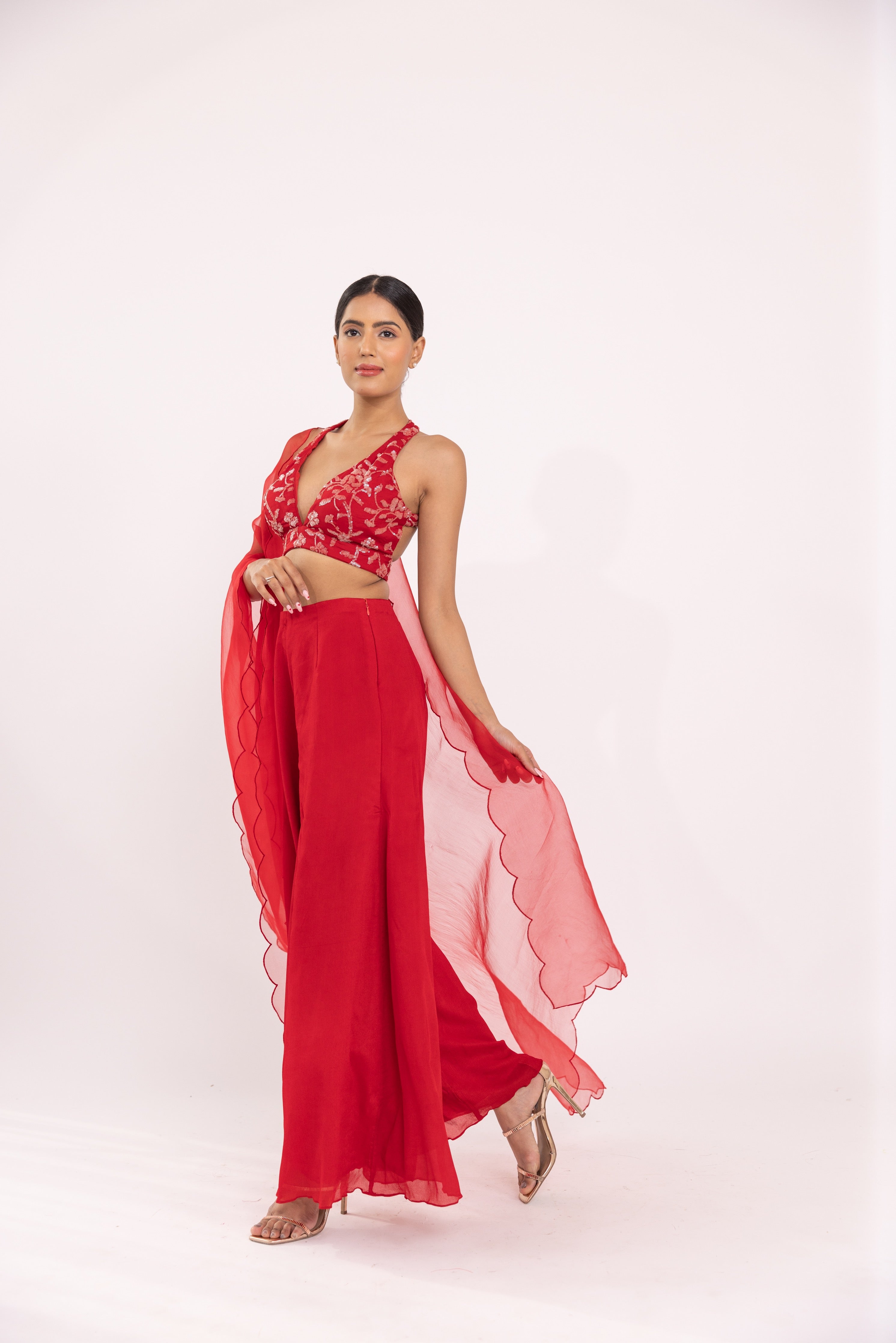 Featuring a red halte embroidered blouse in georgette base. It is paired with a solid gorgette flared sharara pants and organza embroidered dupatta with scalloped edges.