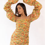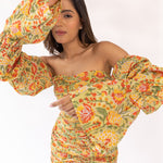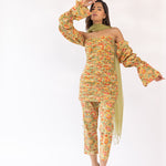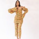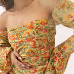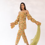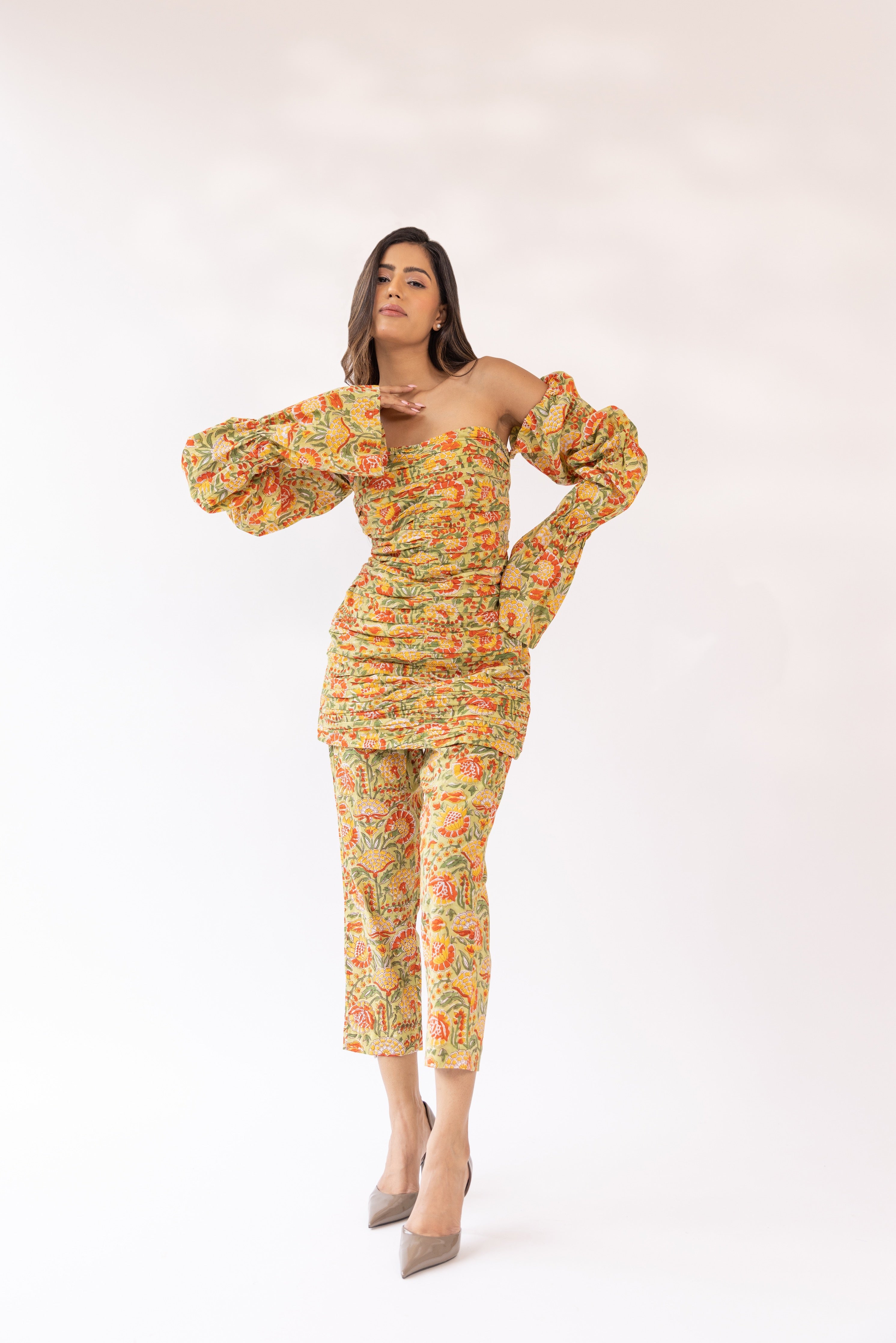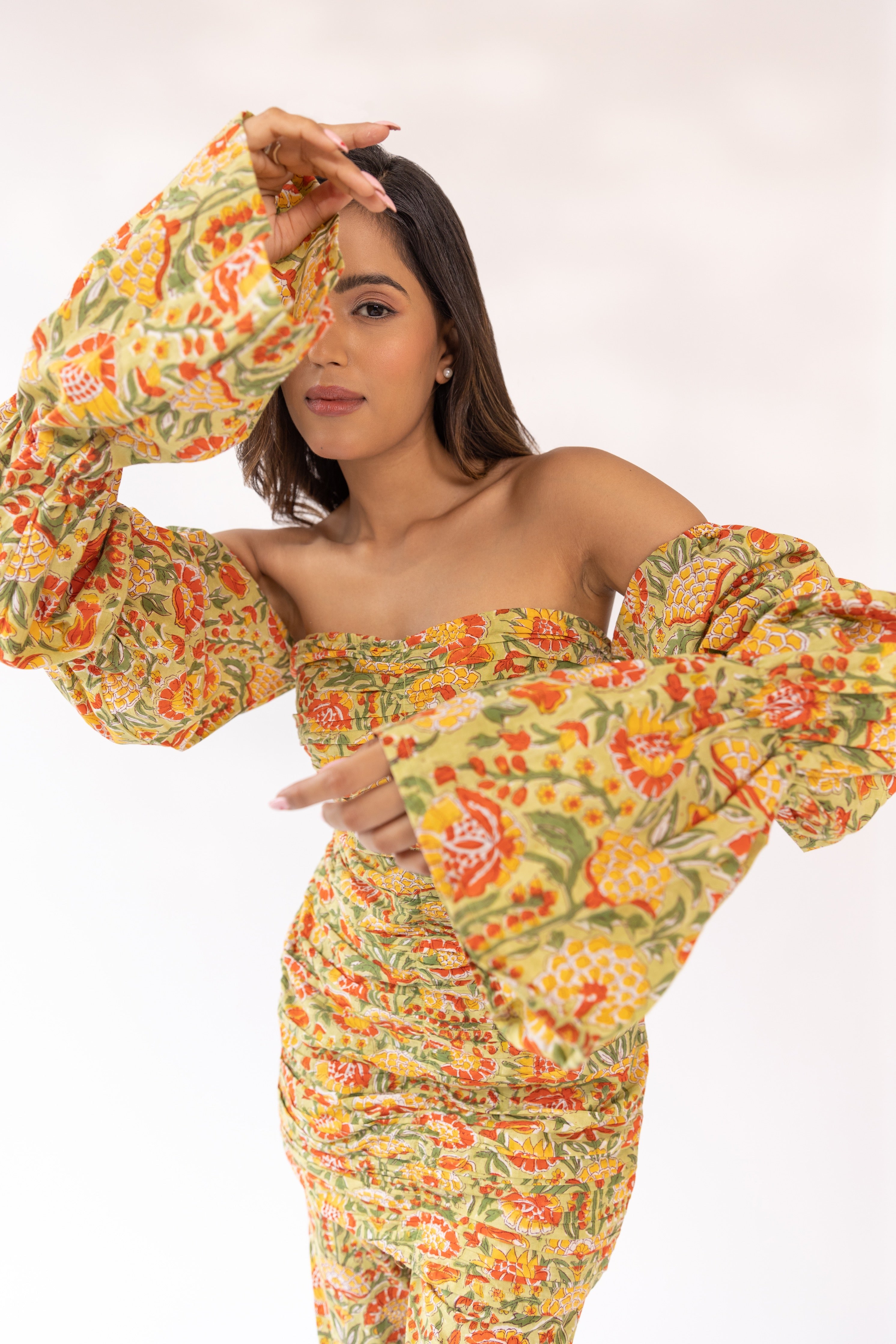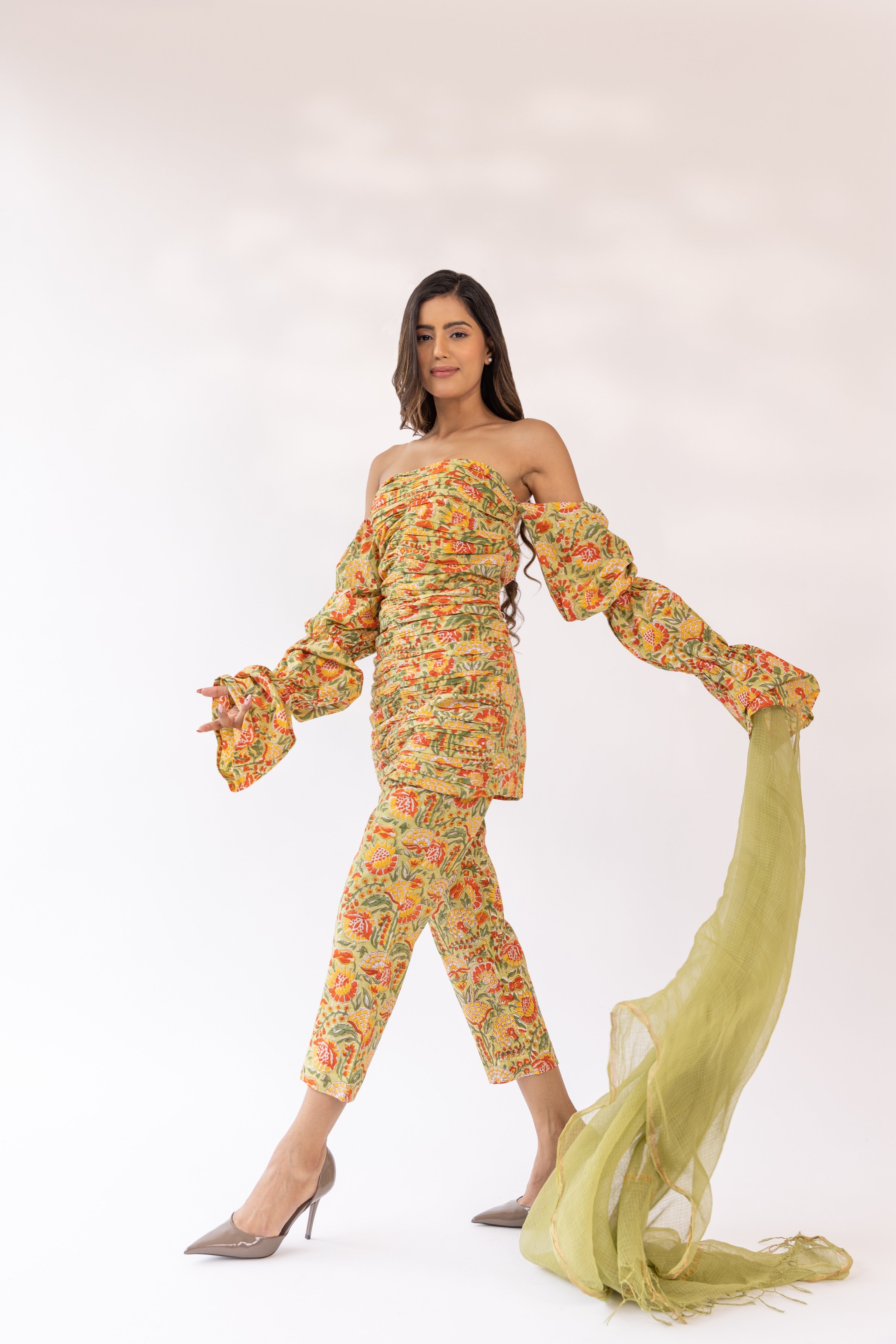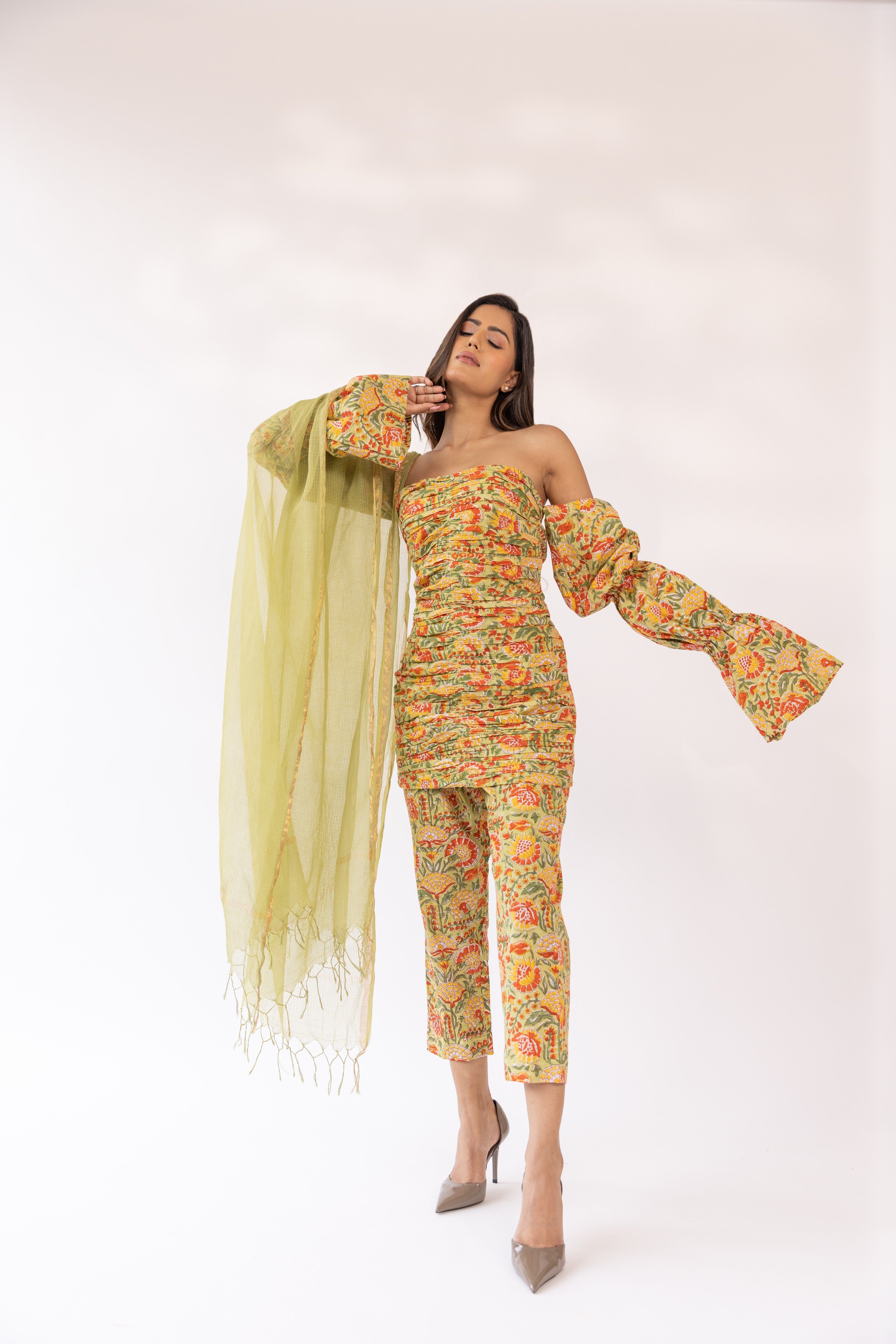 Featuring mustard block printed off shoulder ruched kurta set in cotton blend base detailed with voluminious sleeves. It is paired with matching pants and solid cottadoria dupatta.