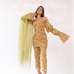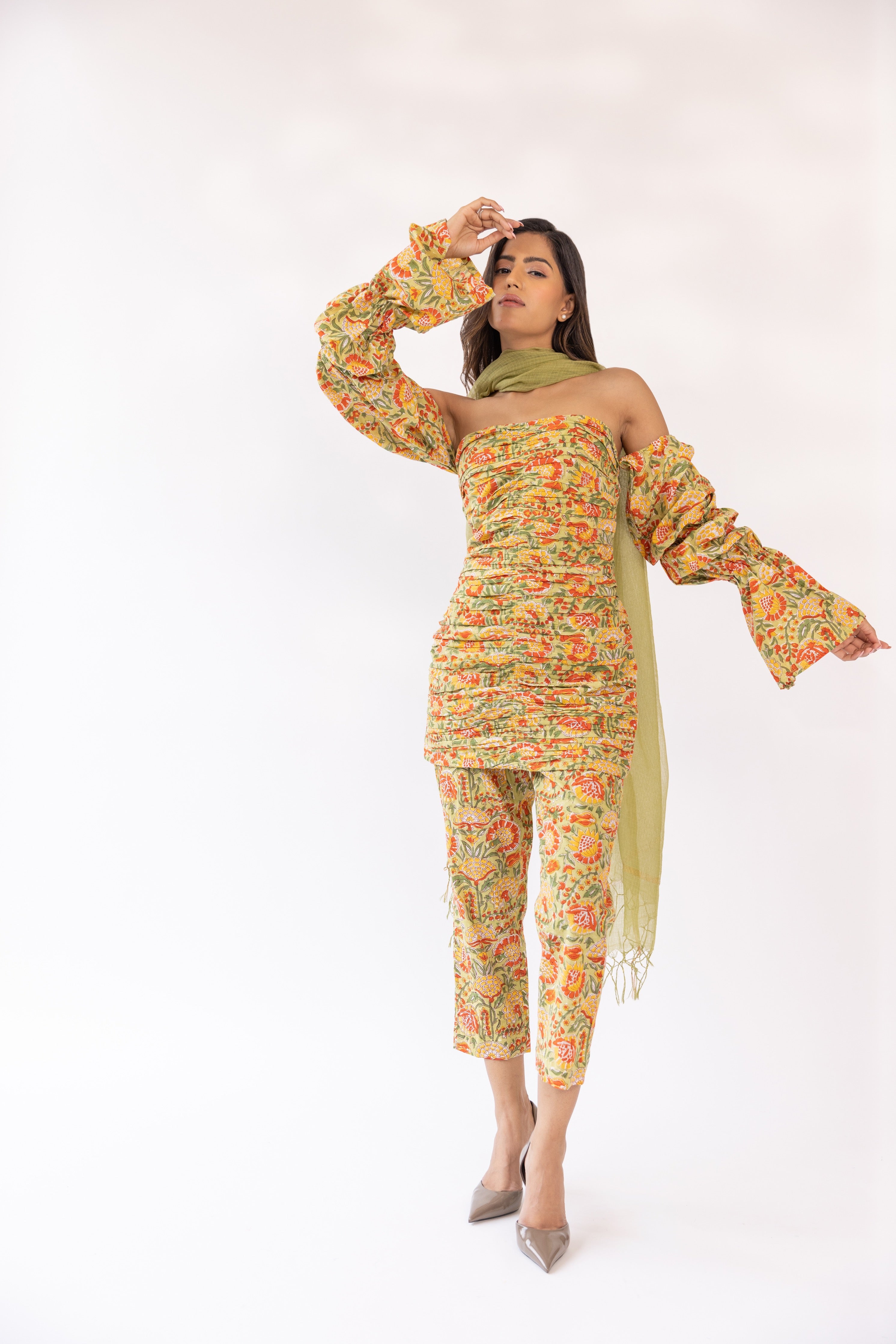 Aarohi Blockprinted Off Shoulder Ruched Kurta Set With Dupatta