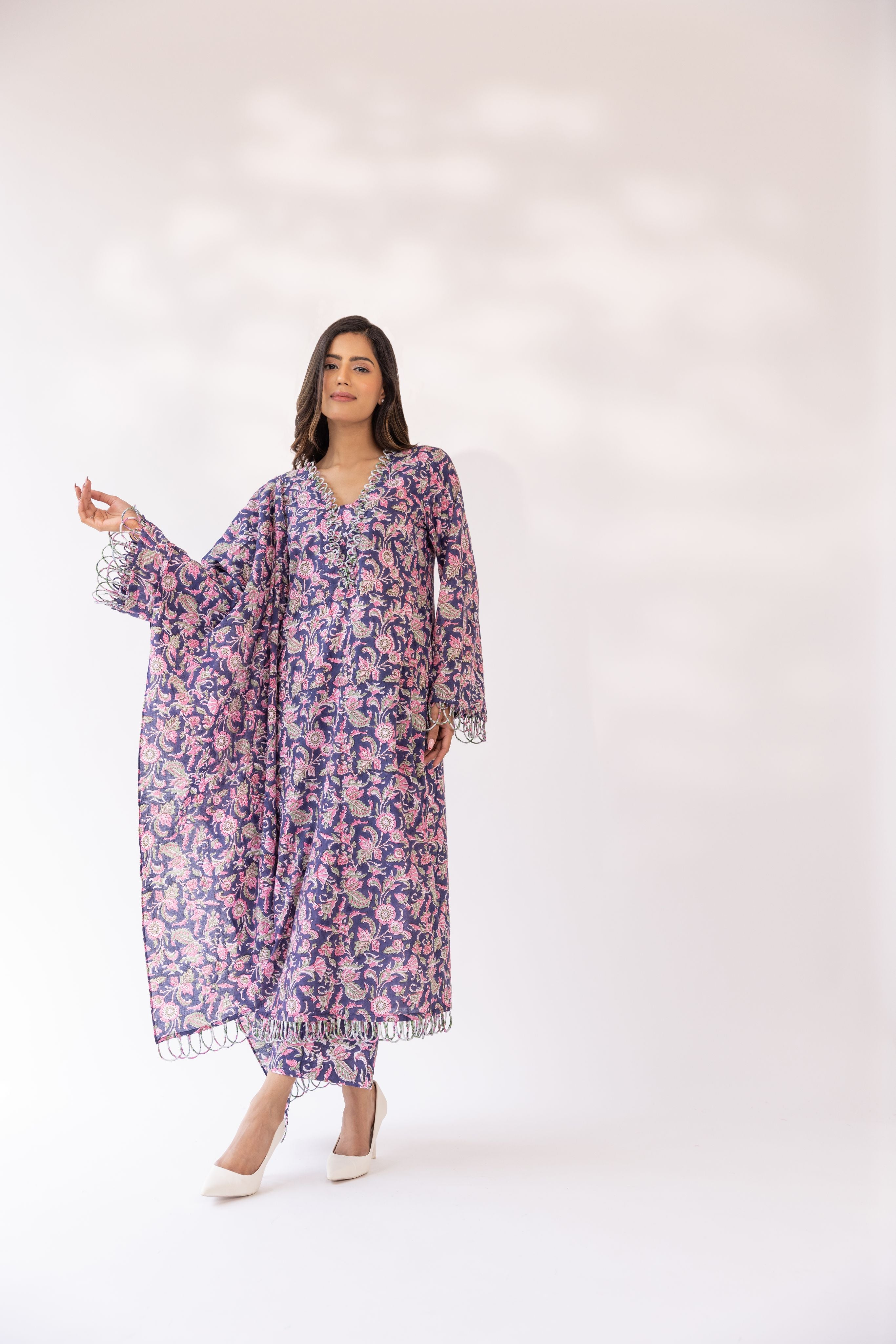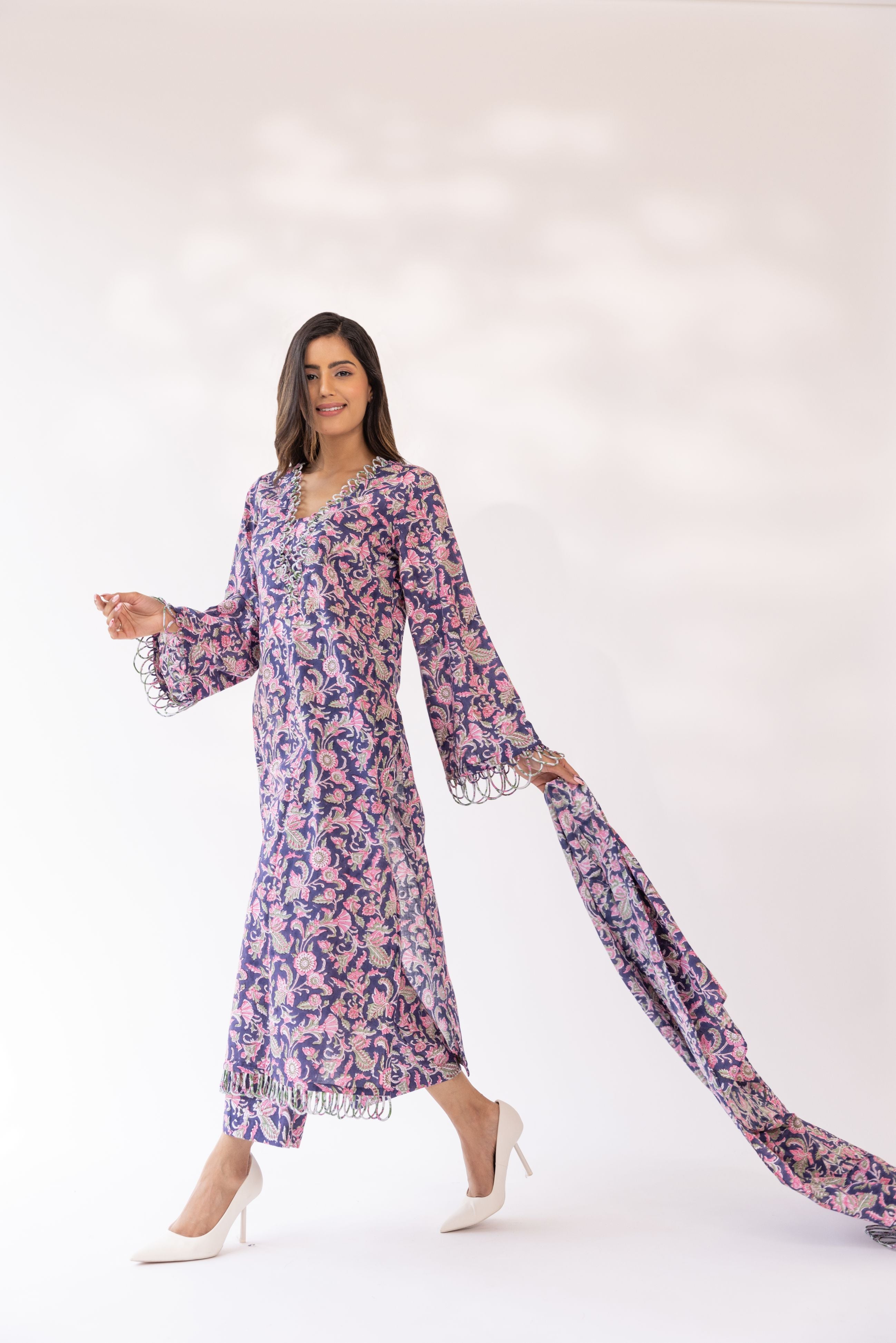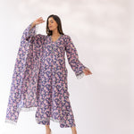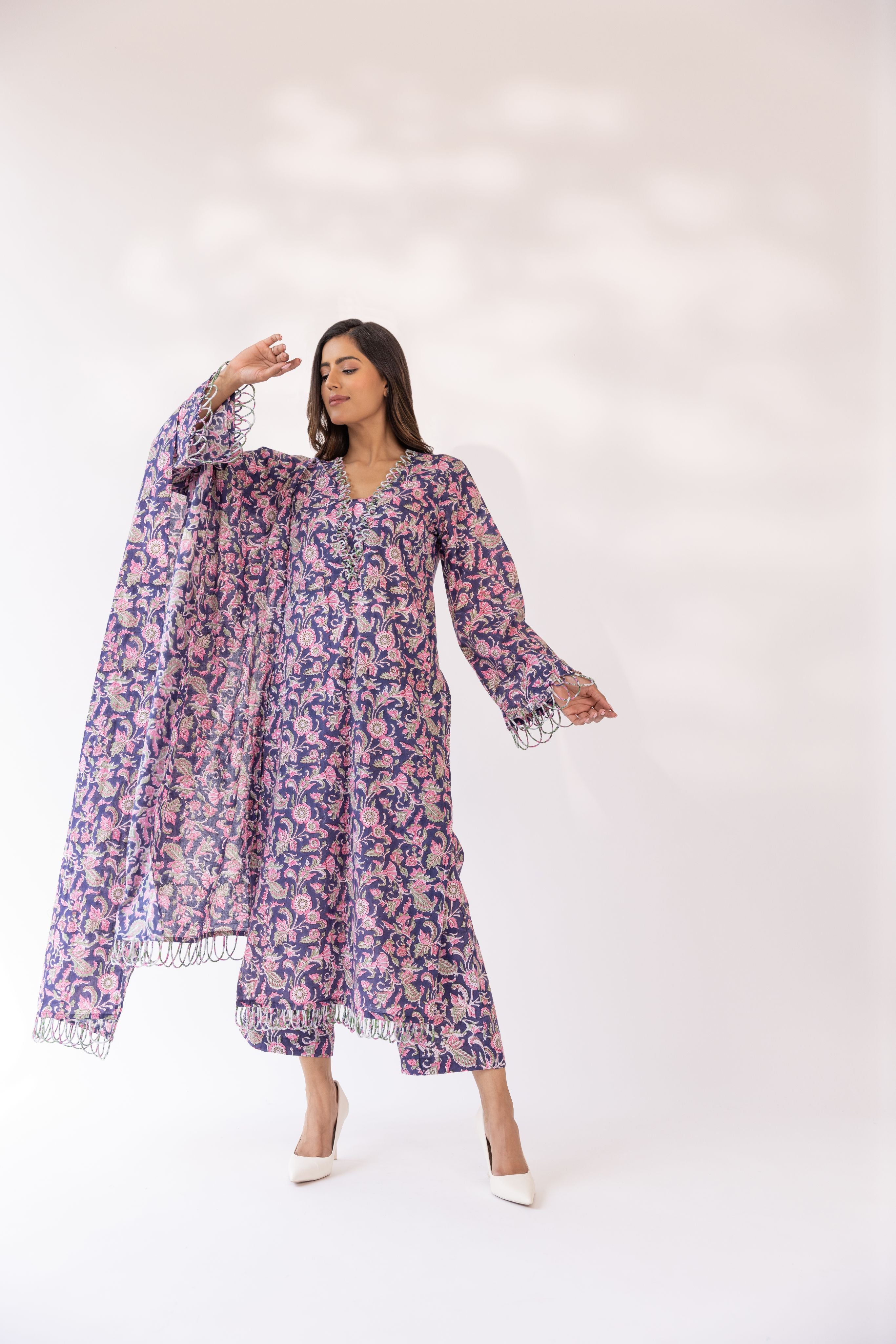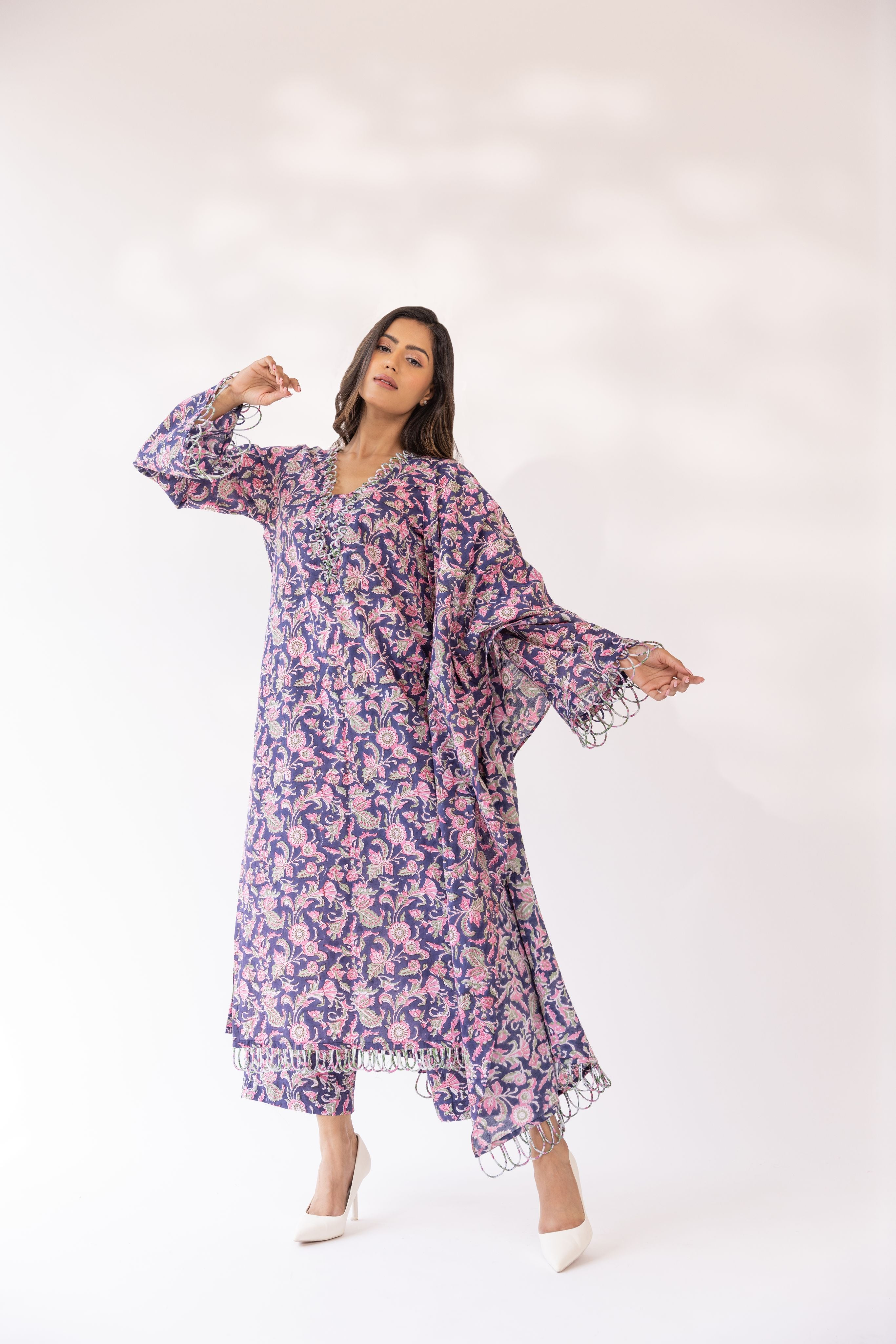 Featuring a purple kurta set in cotton base detailed with scalloped edging , paired with matching pants and dupatta.