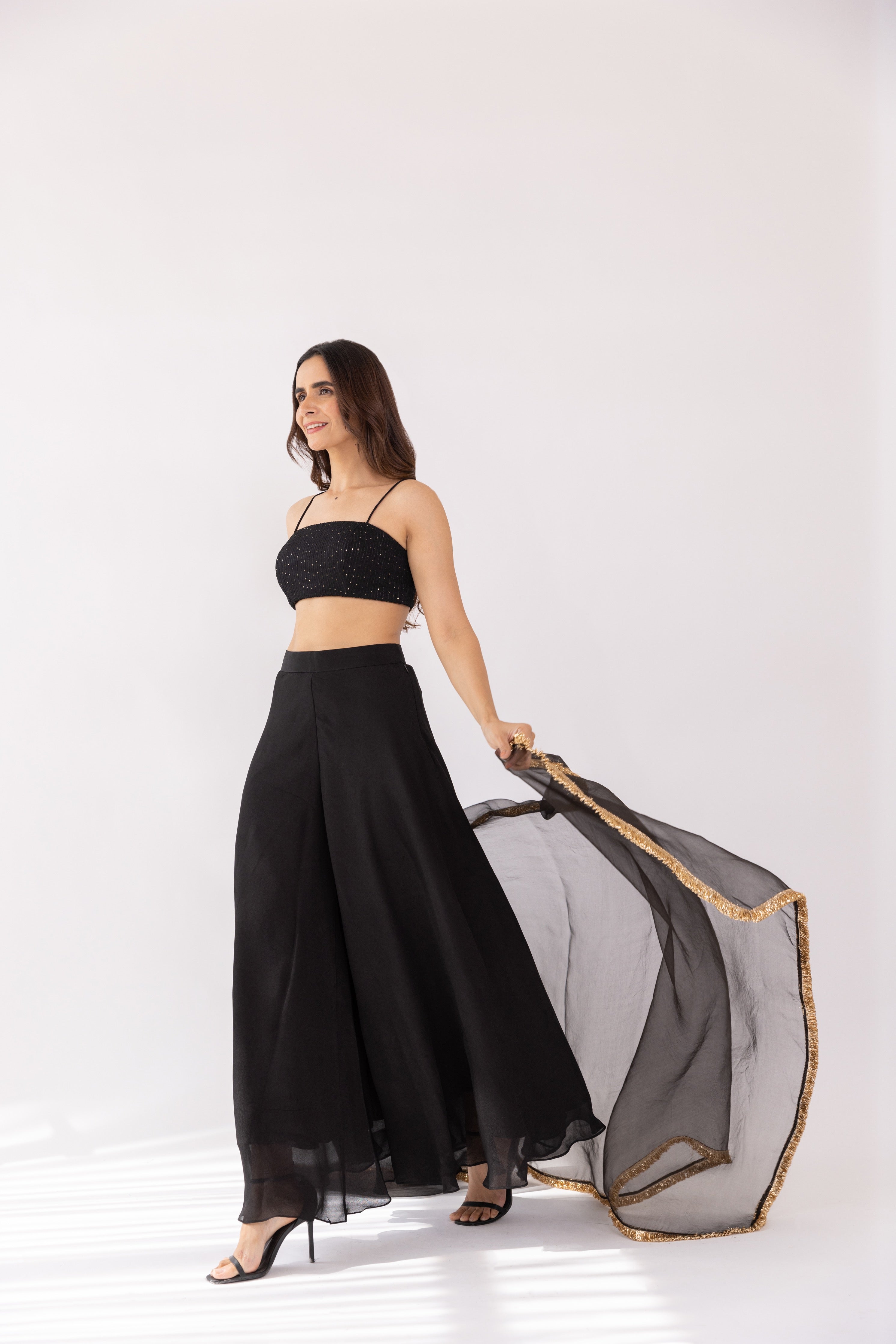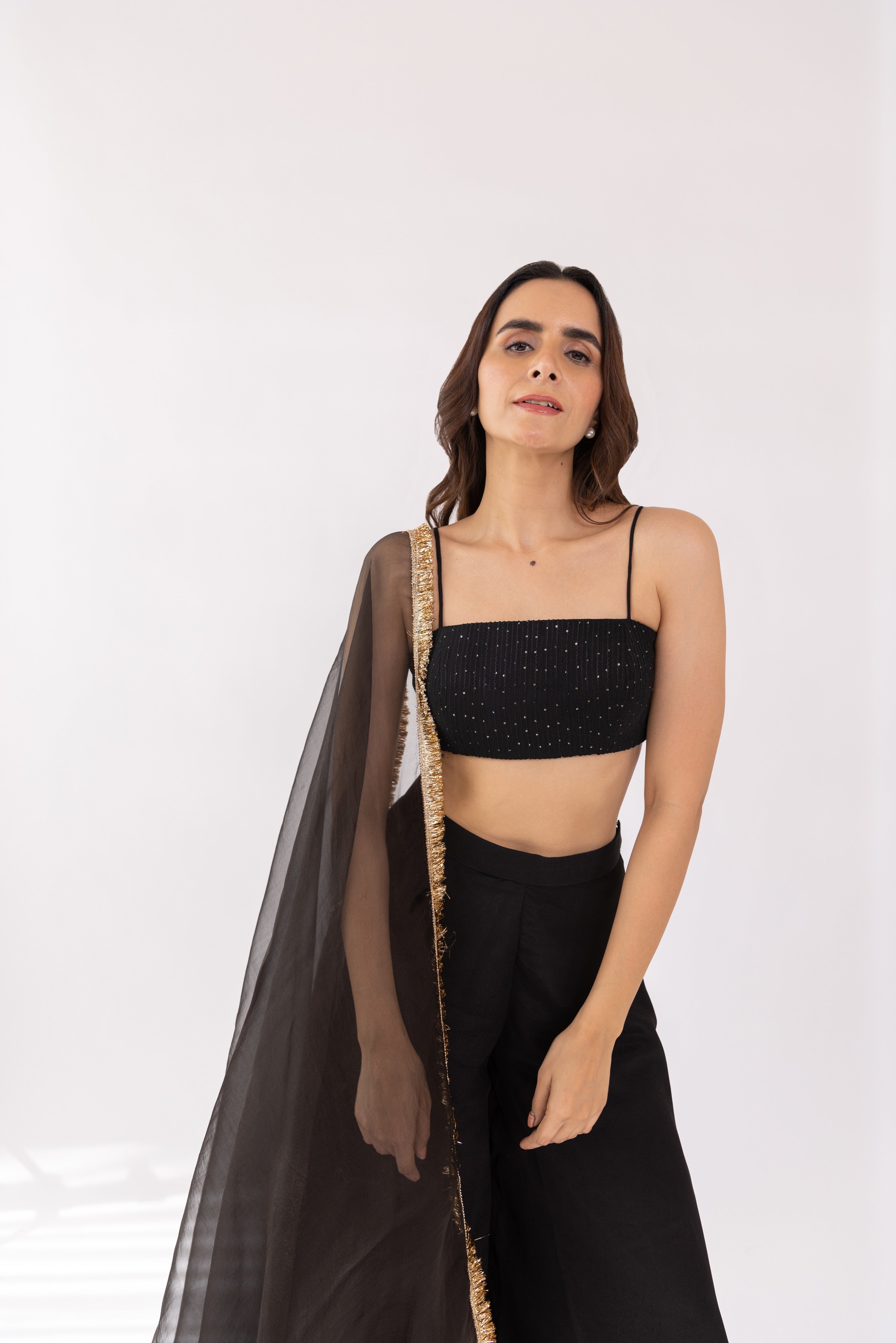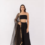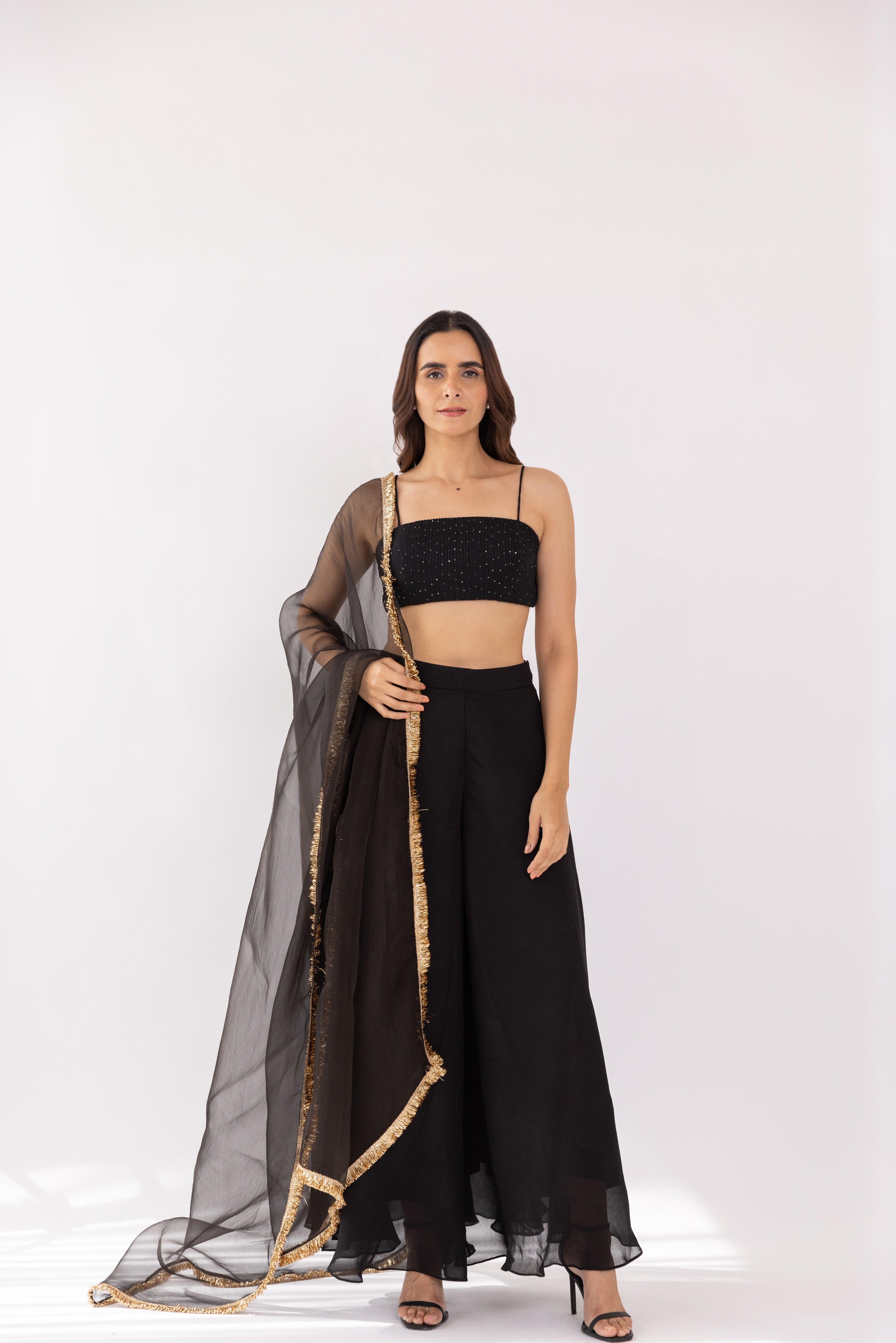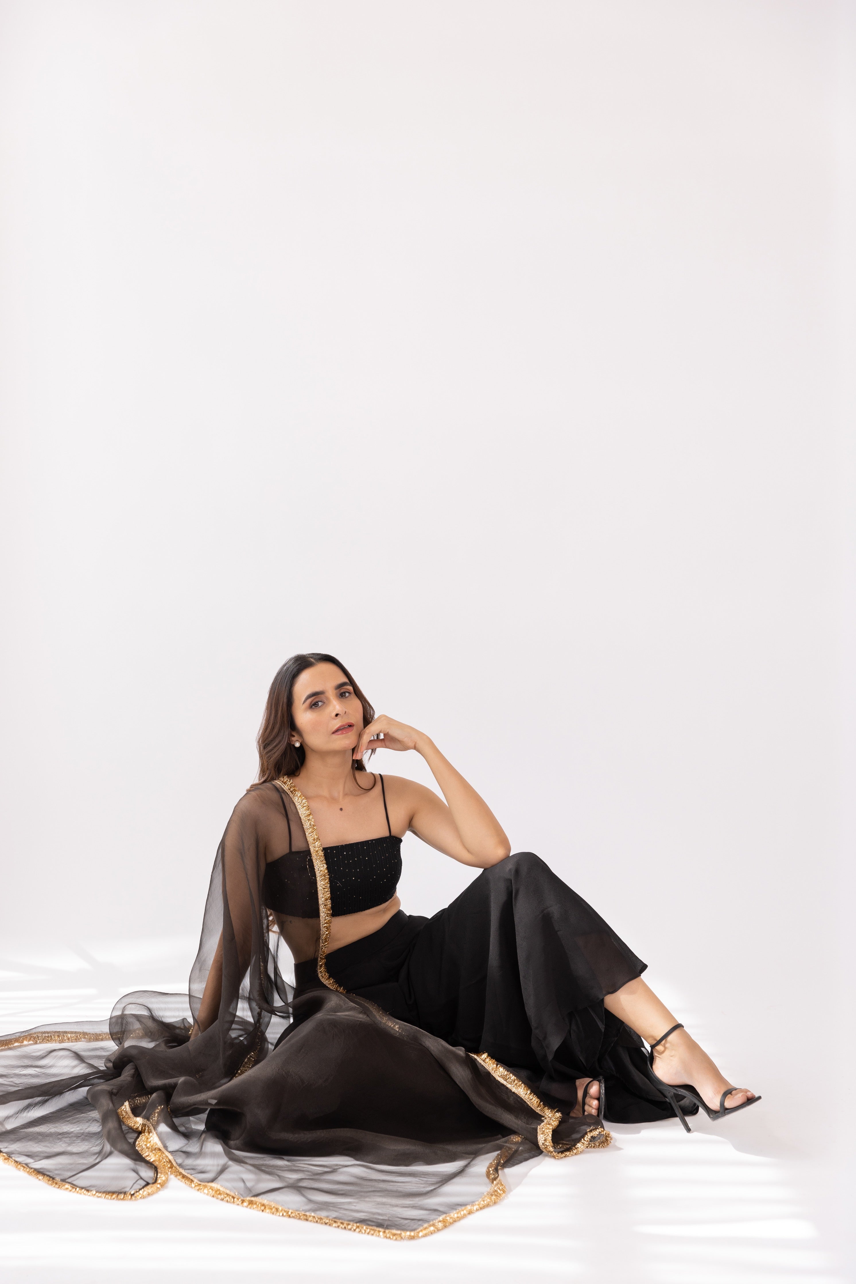 Featuring a black embroidered bandeau in georgette base. It is paired with a solid flared sharara pants and organza dupatta with lurex fringe edging.