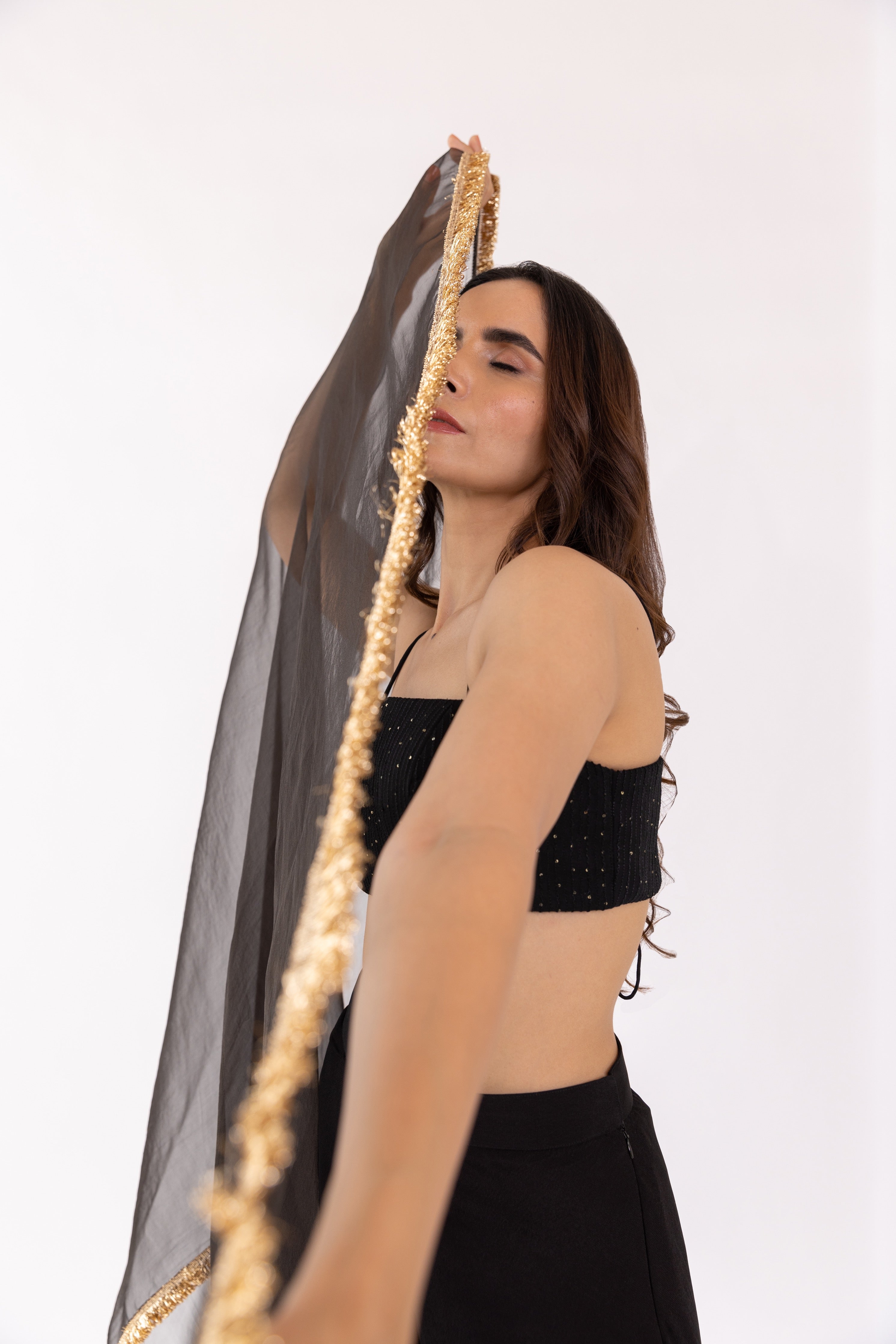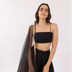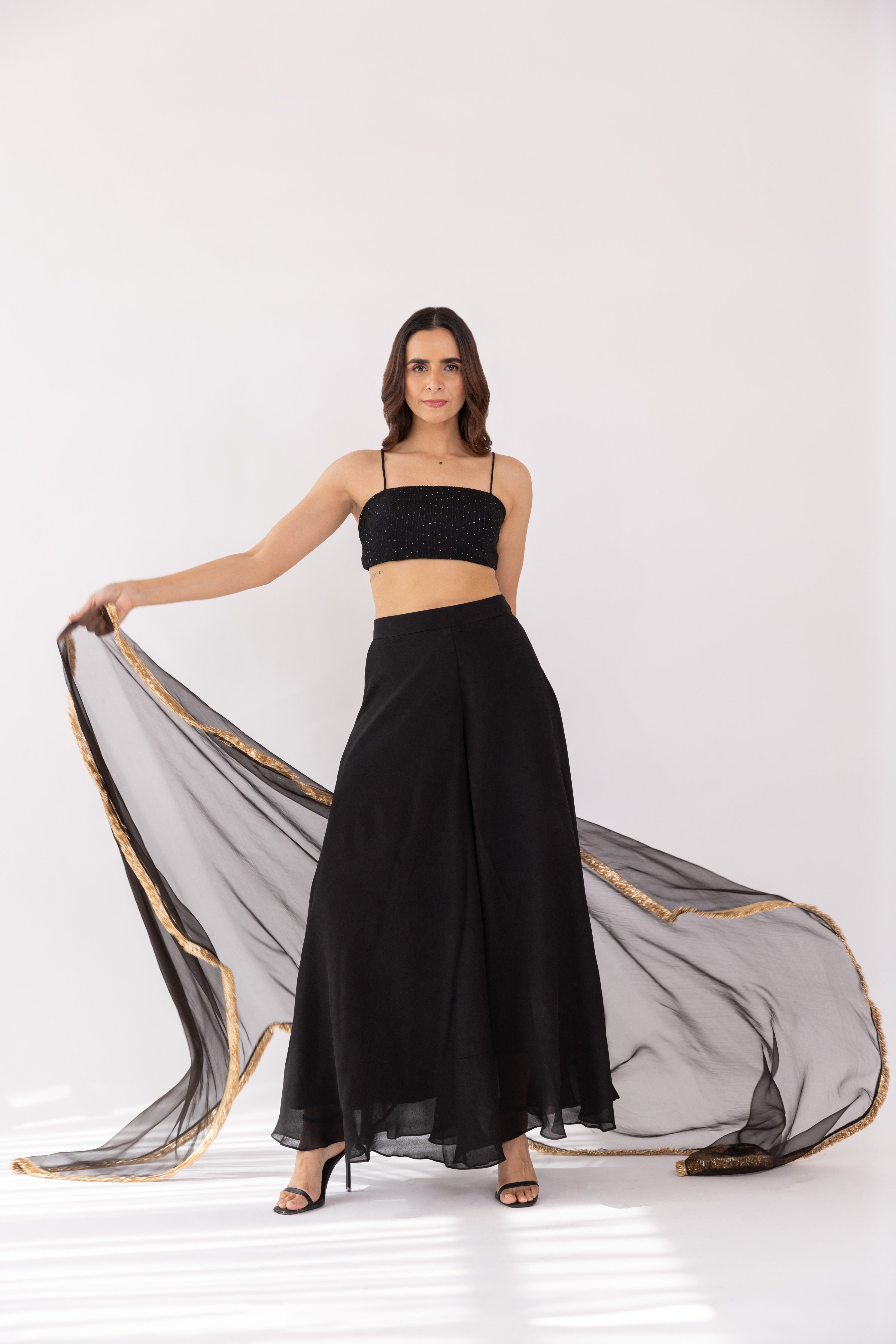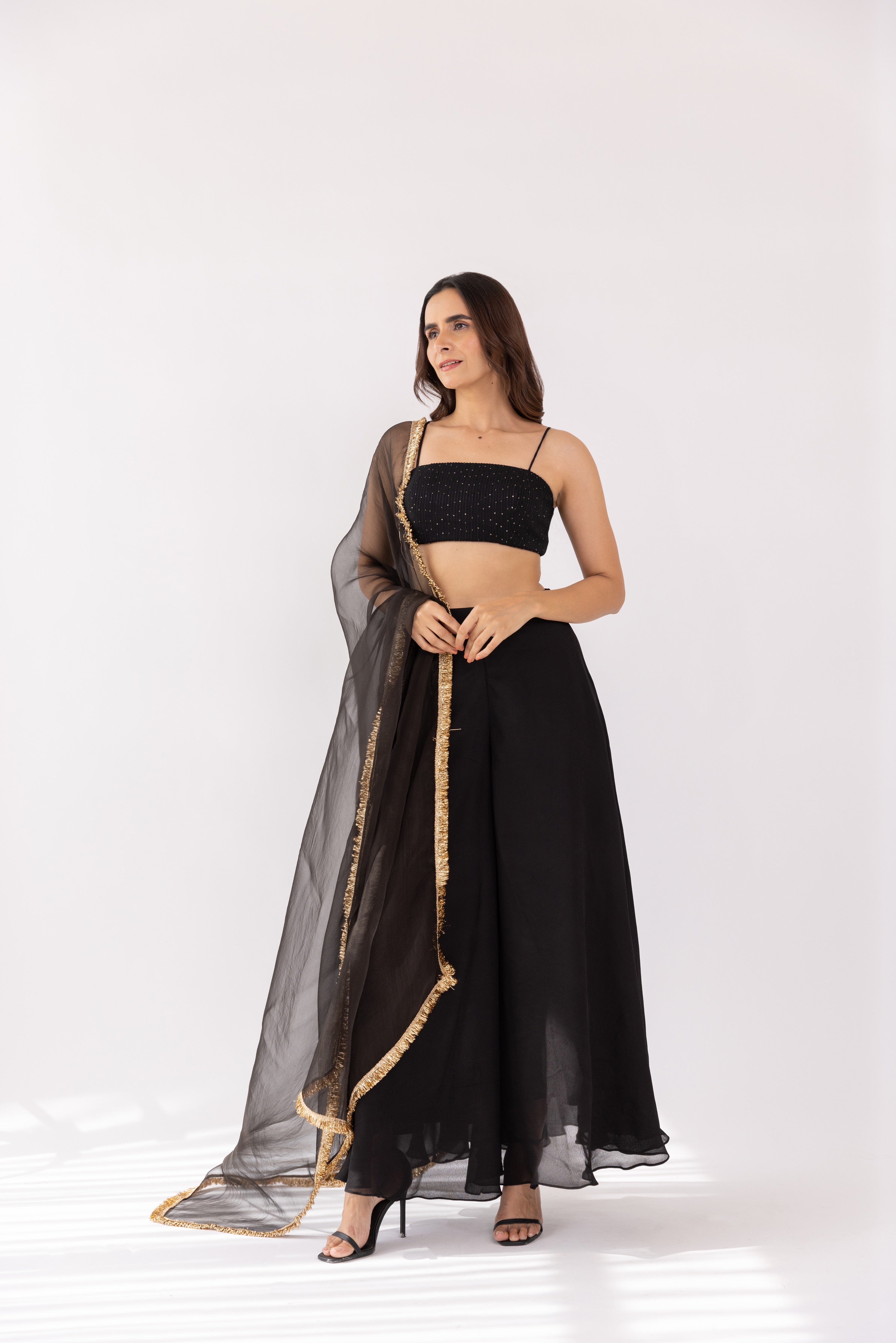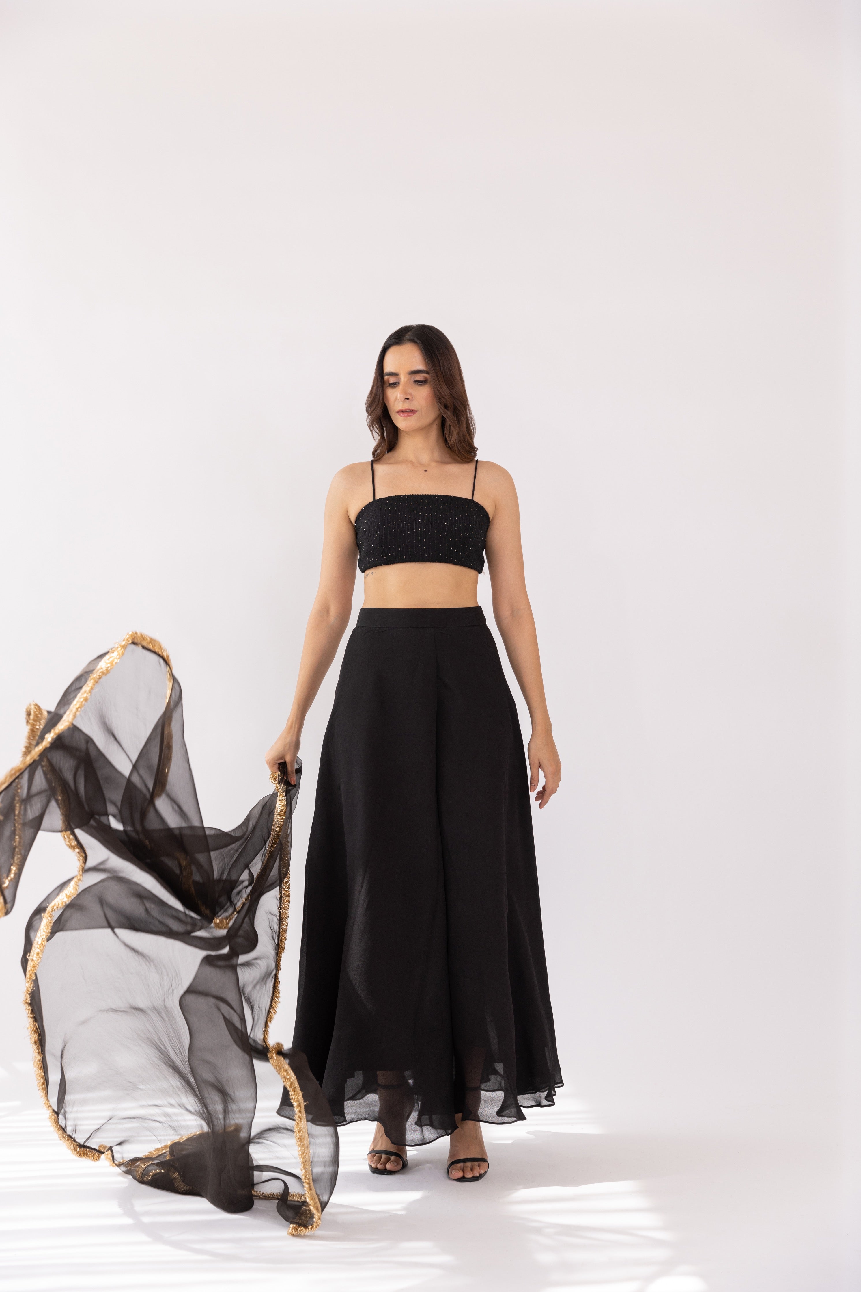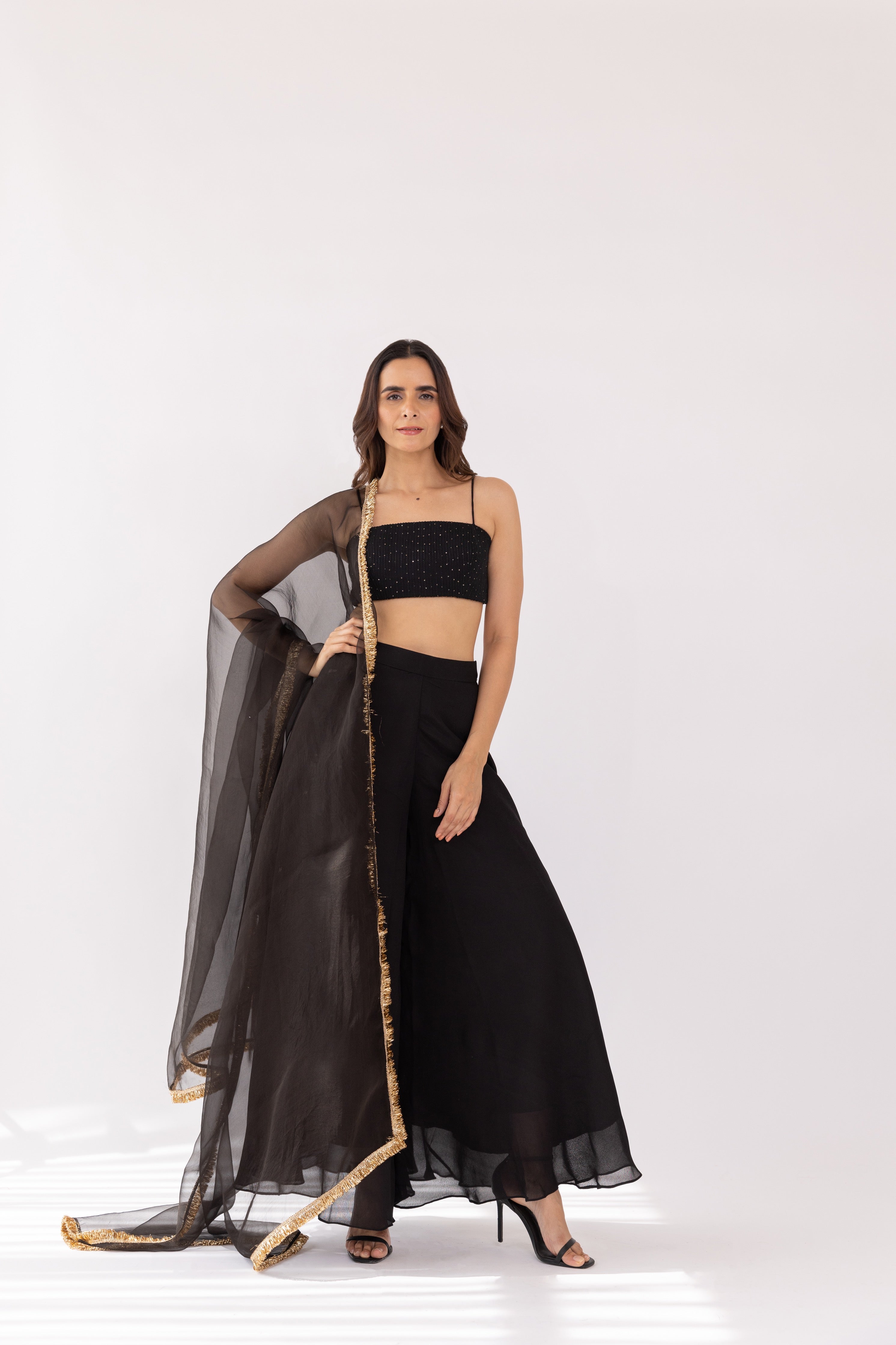 Featuring a black embroidered bandeau in georgette base. It is paired with a solid flared sharara pants and organza dupatta with lurex fringe edging.