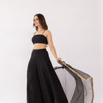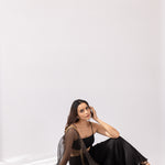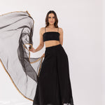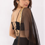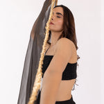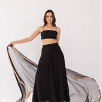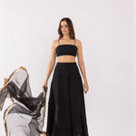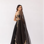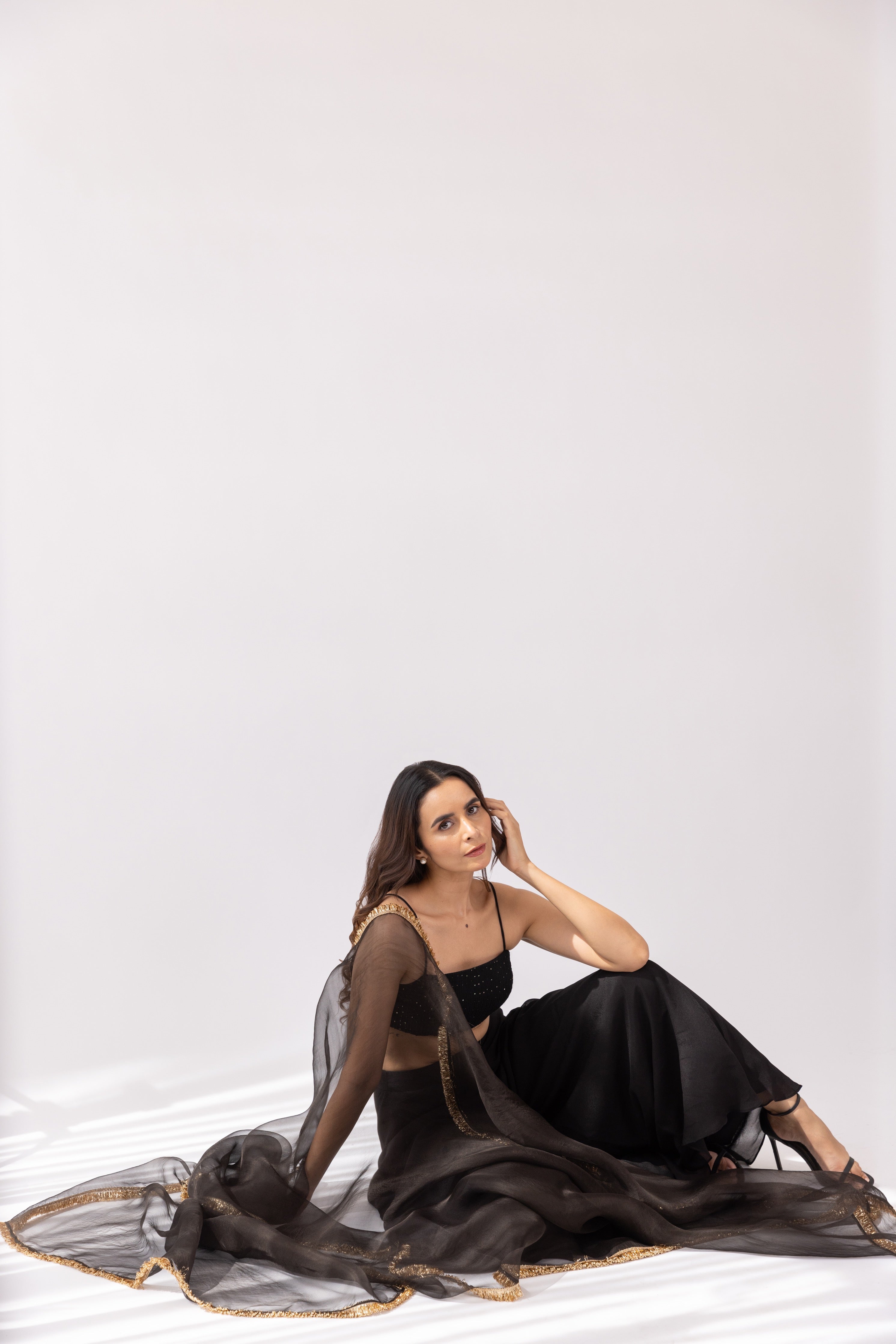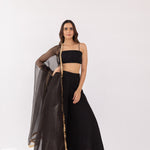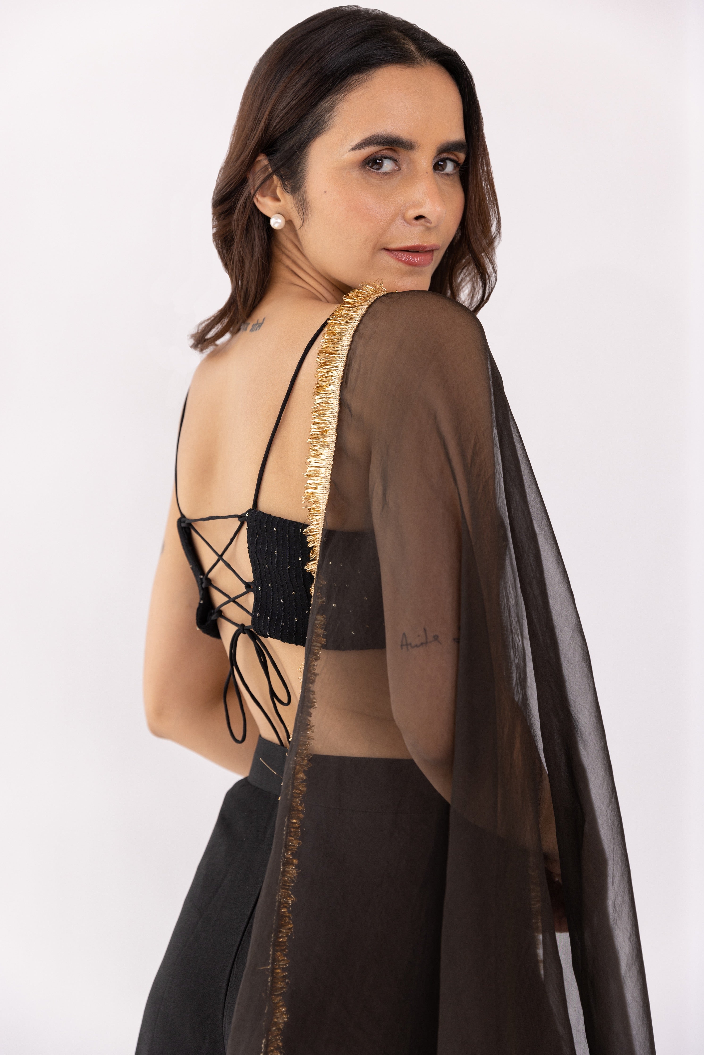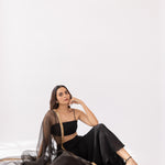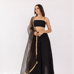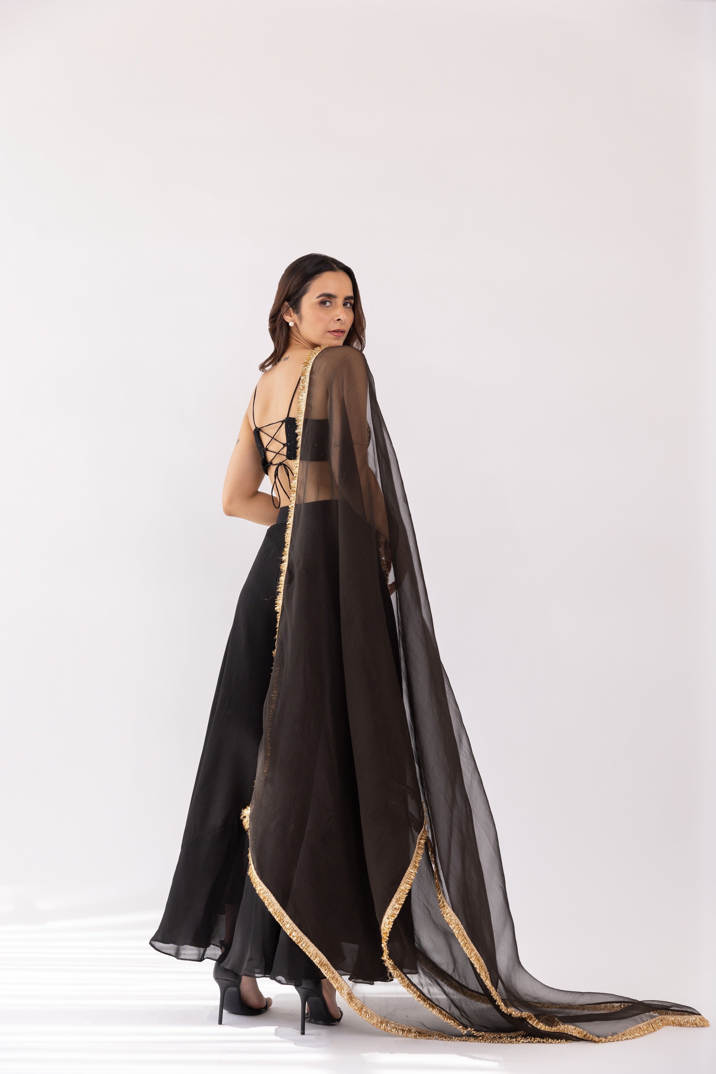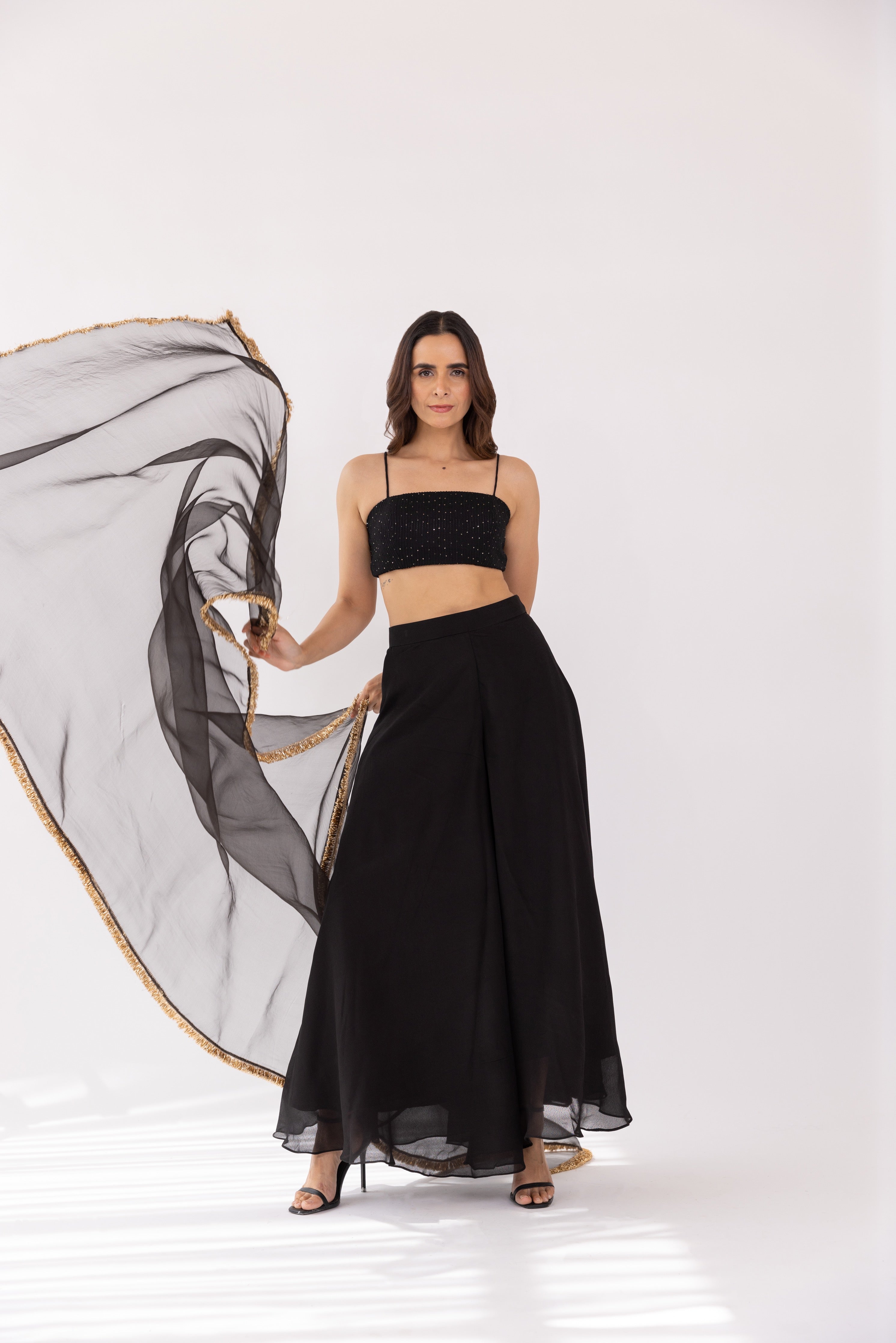 Featuring a black embroidered bandeau in georgette base. It is paired with a solid flared sharara pants and organza dupatta with lurex fringe edging.