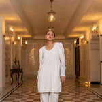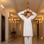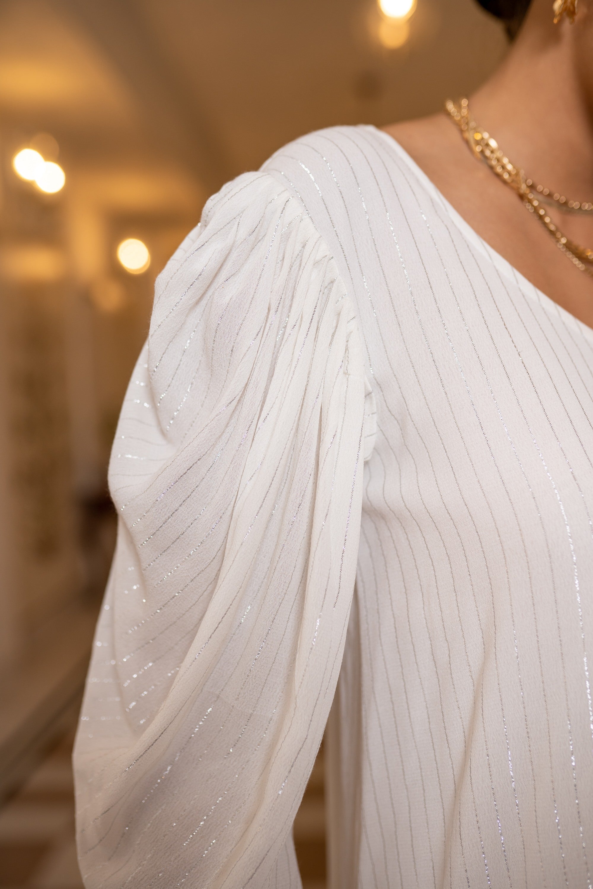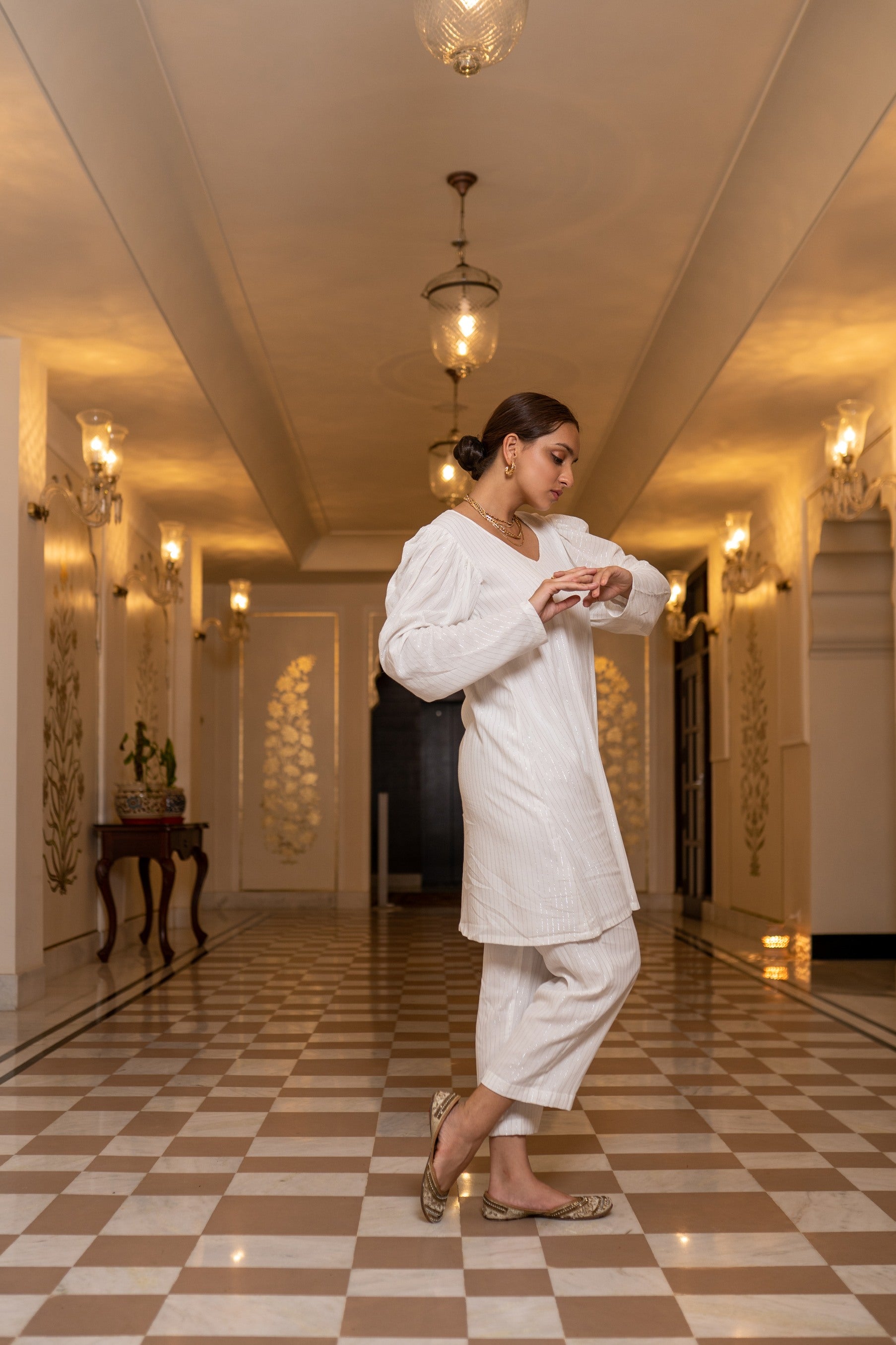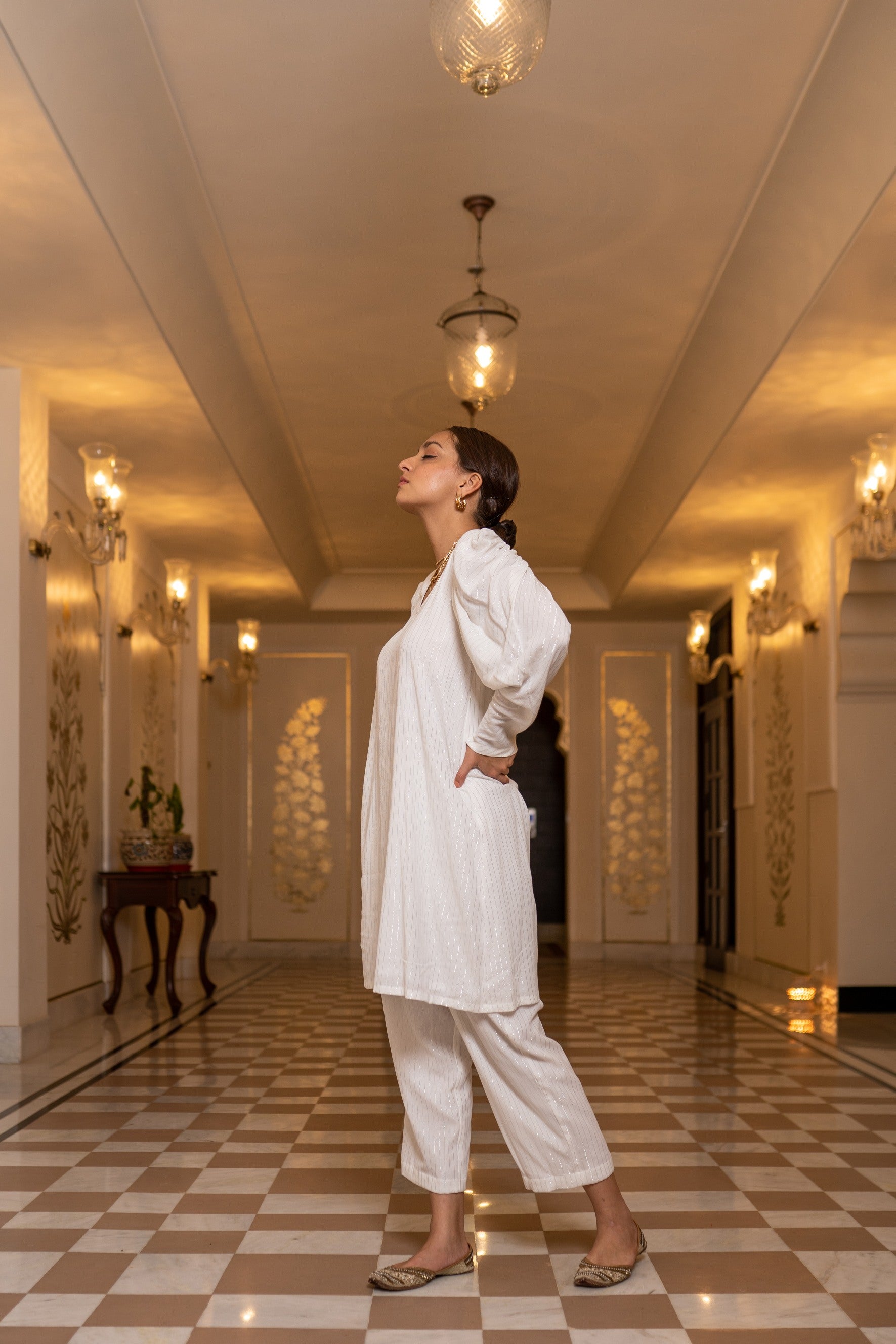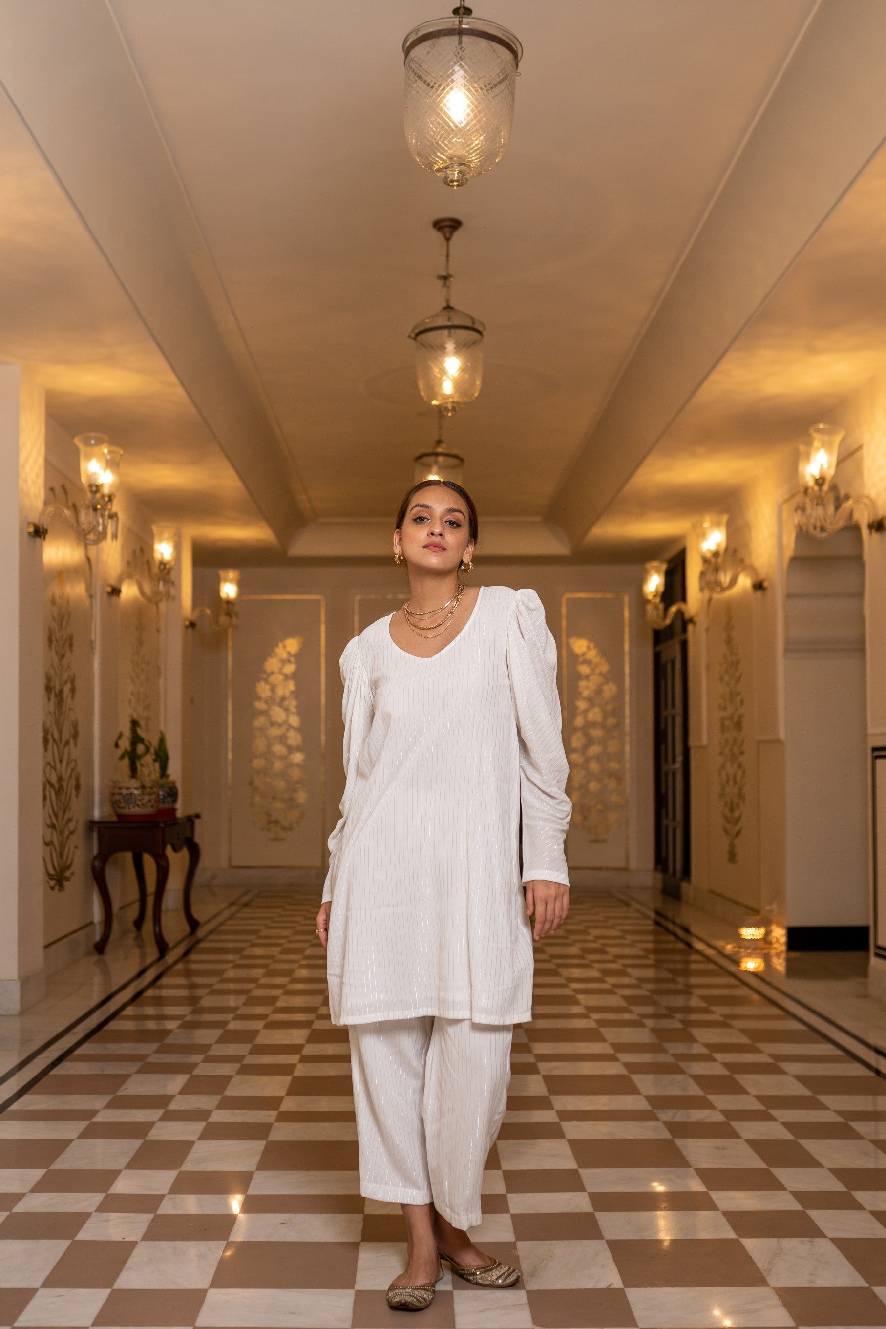 Details: Oval Shaped Neckline, Leg Of Mutton Sleeve, Straight Fit Pants.