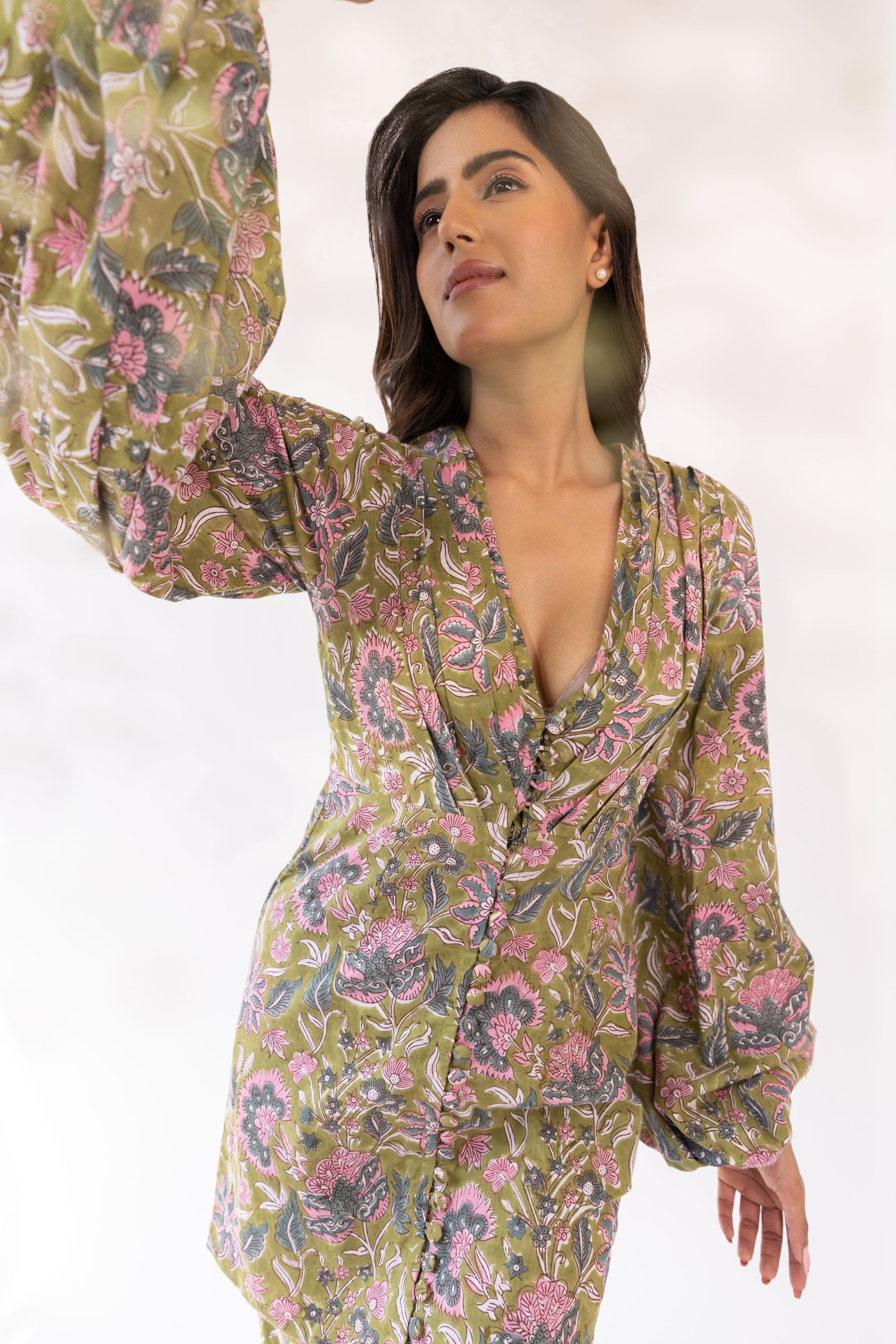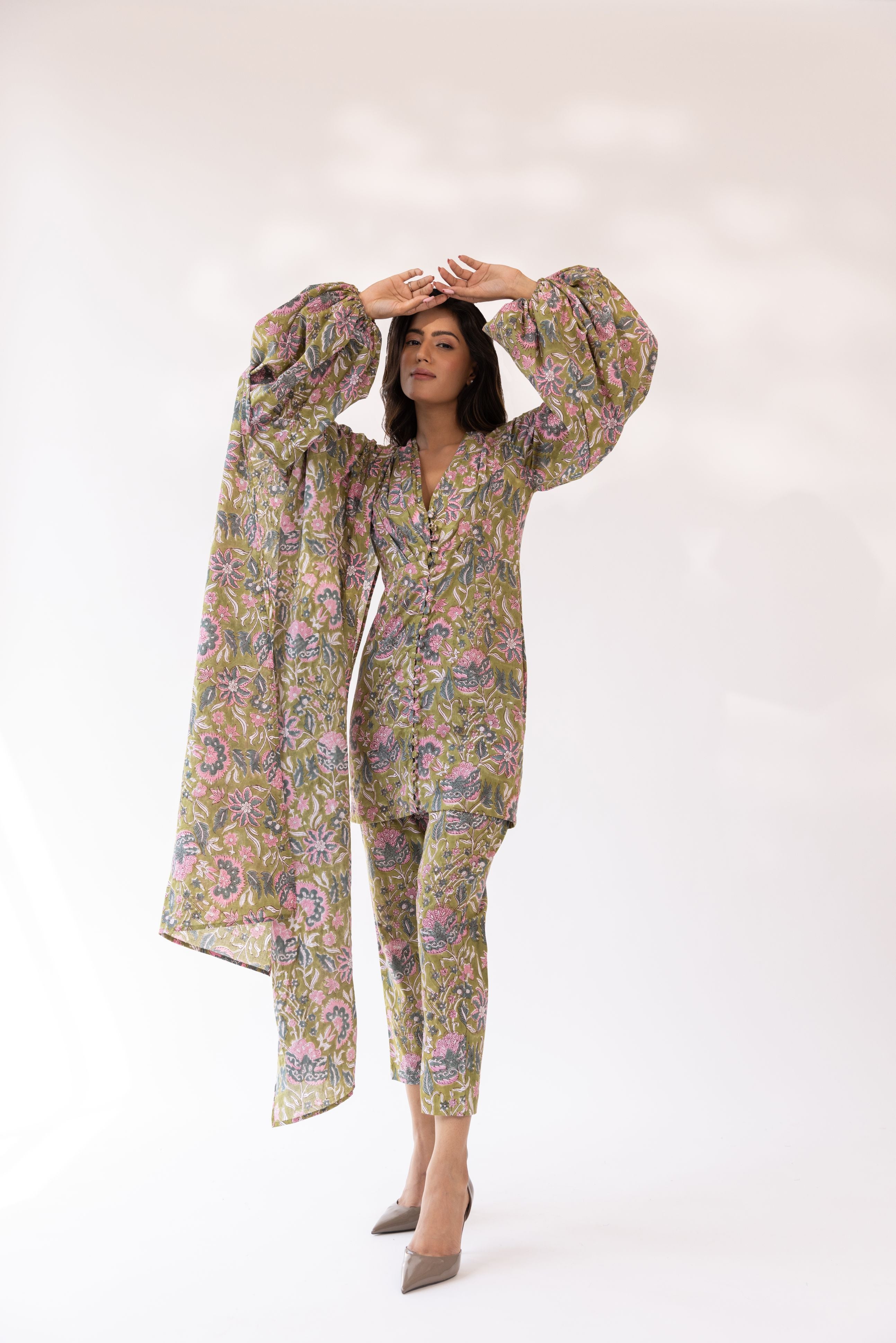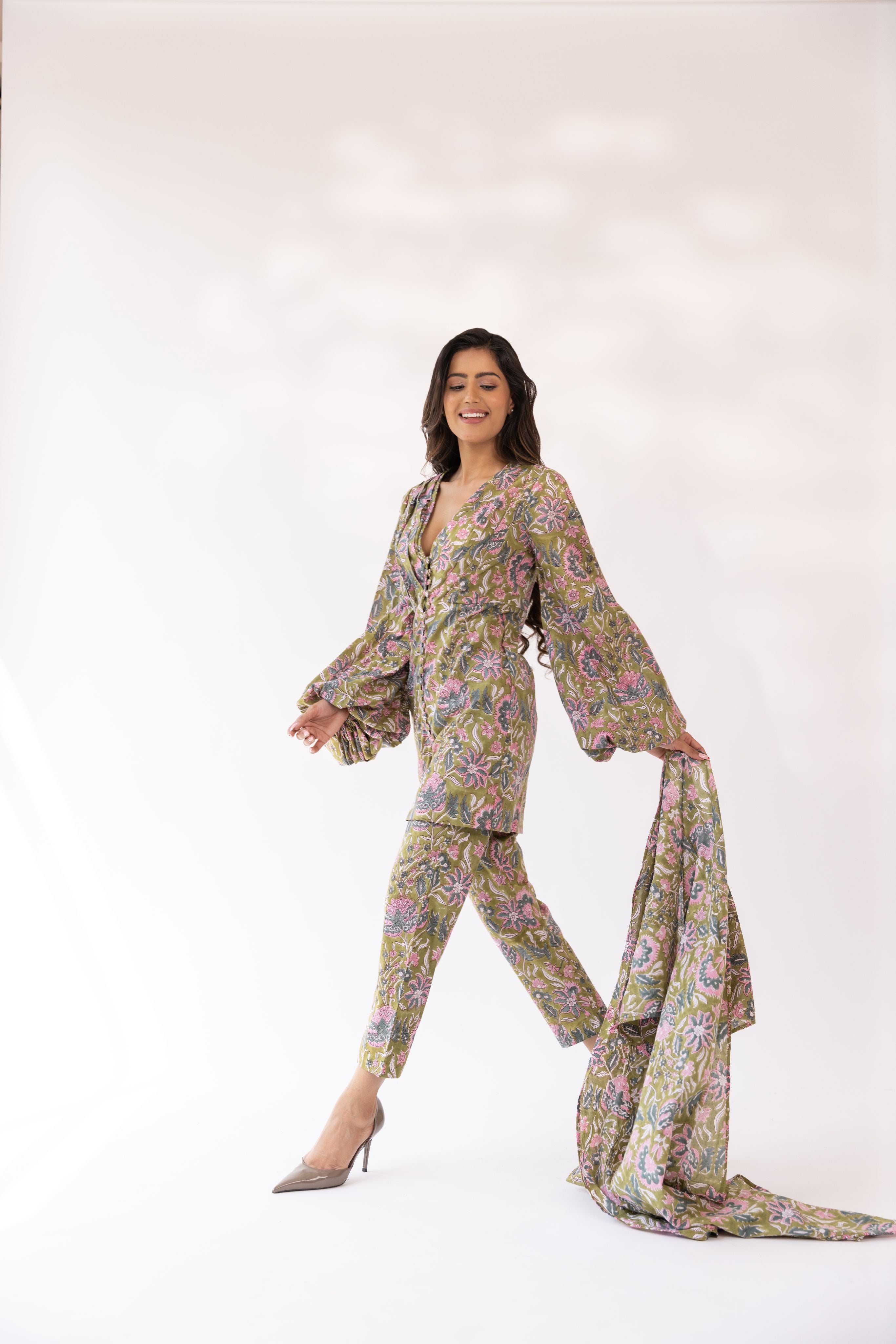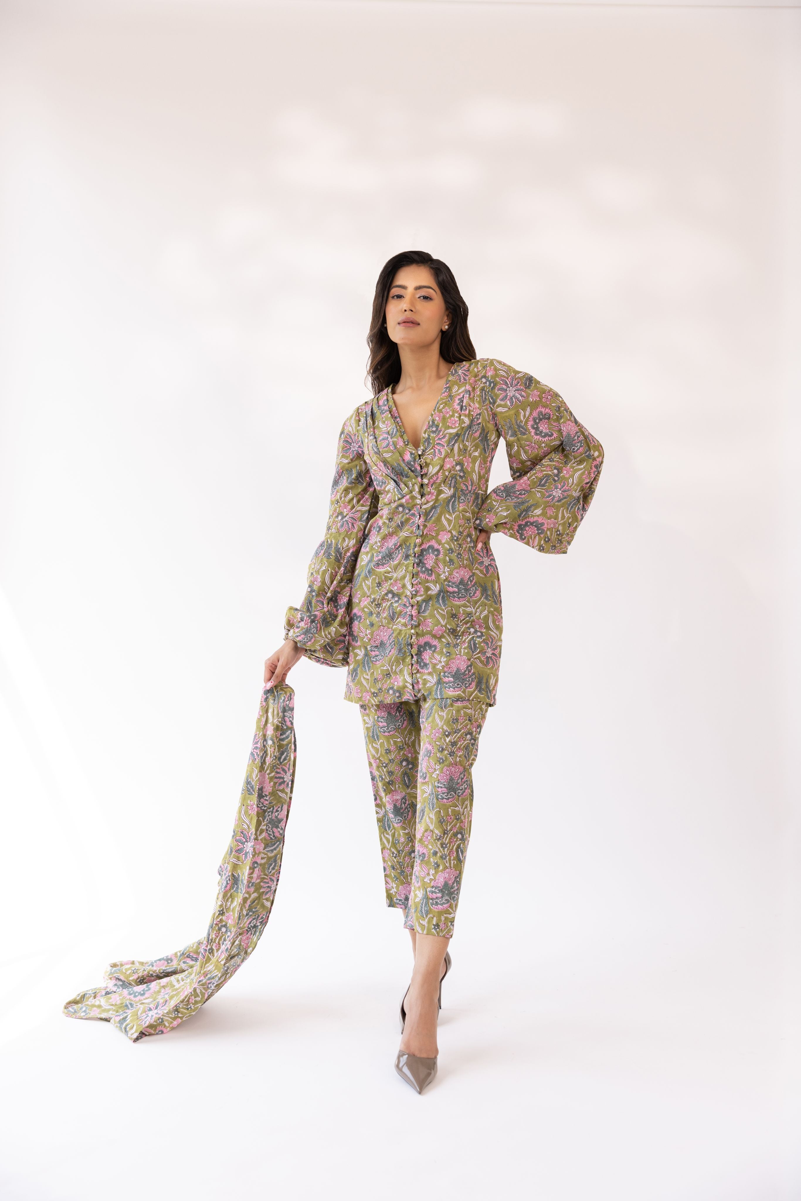 Featuring olive block printed v neck kurta set in cotton blend base detailed front button closure, fitted silhouette. It is paired with matching pants and dupatta.