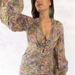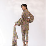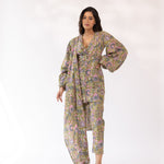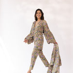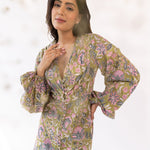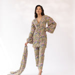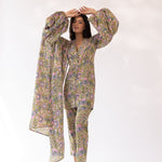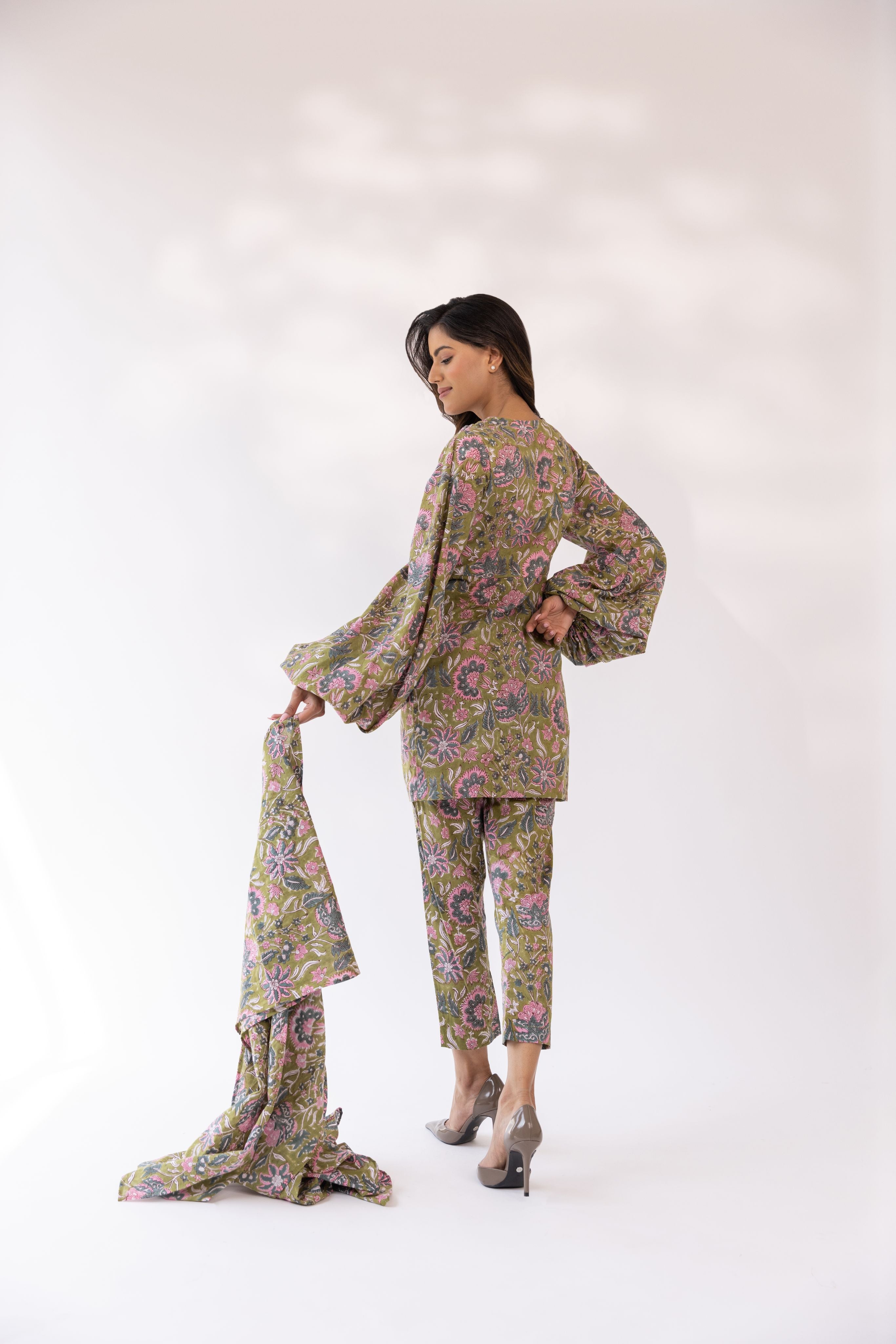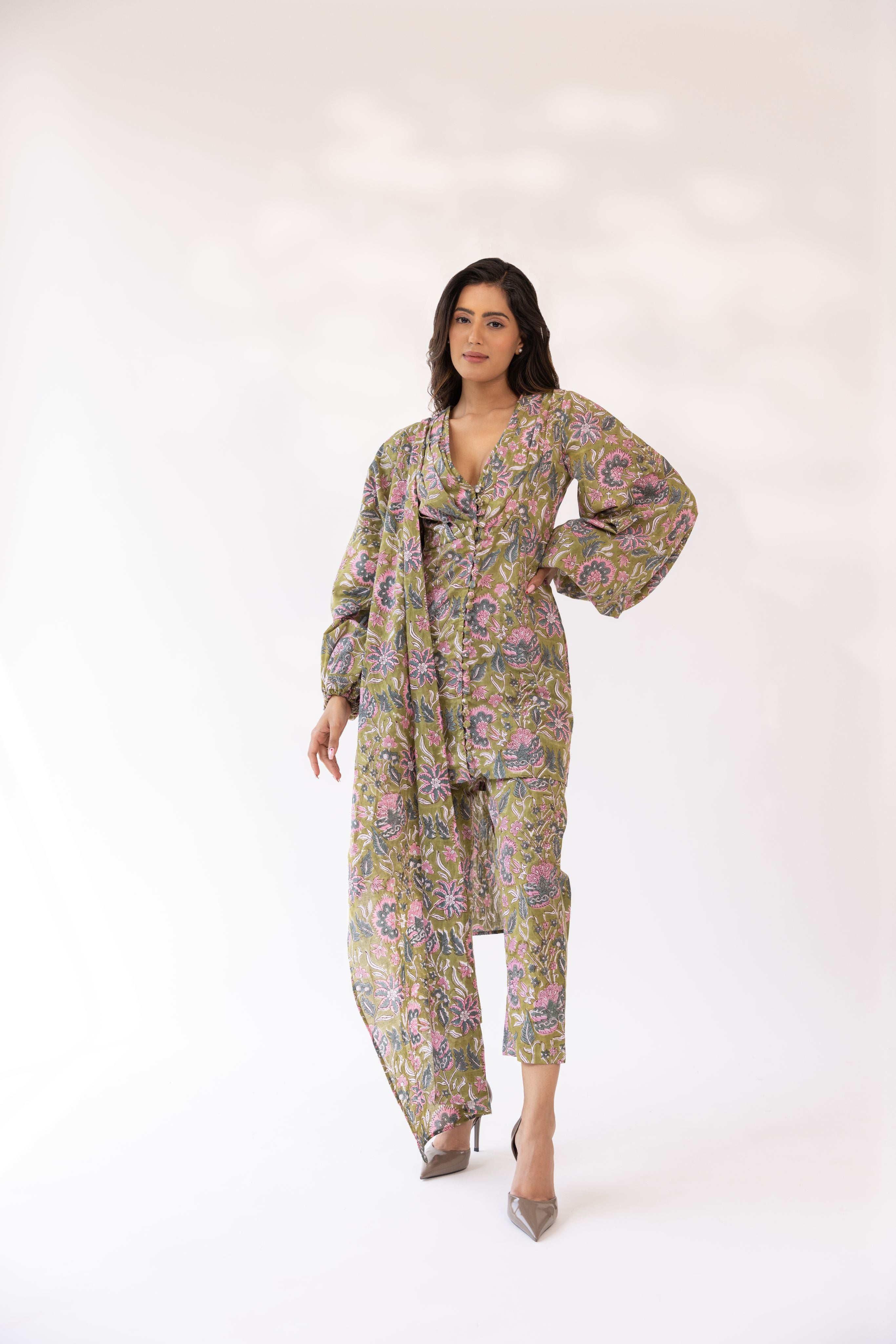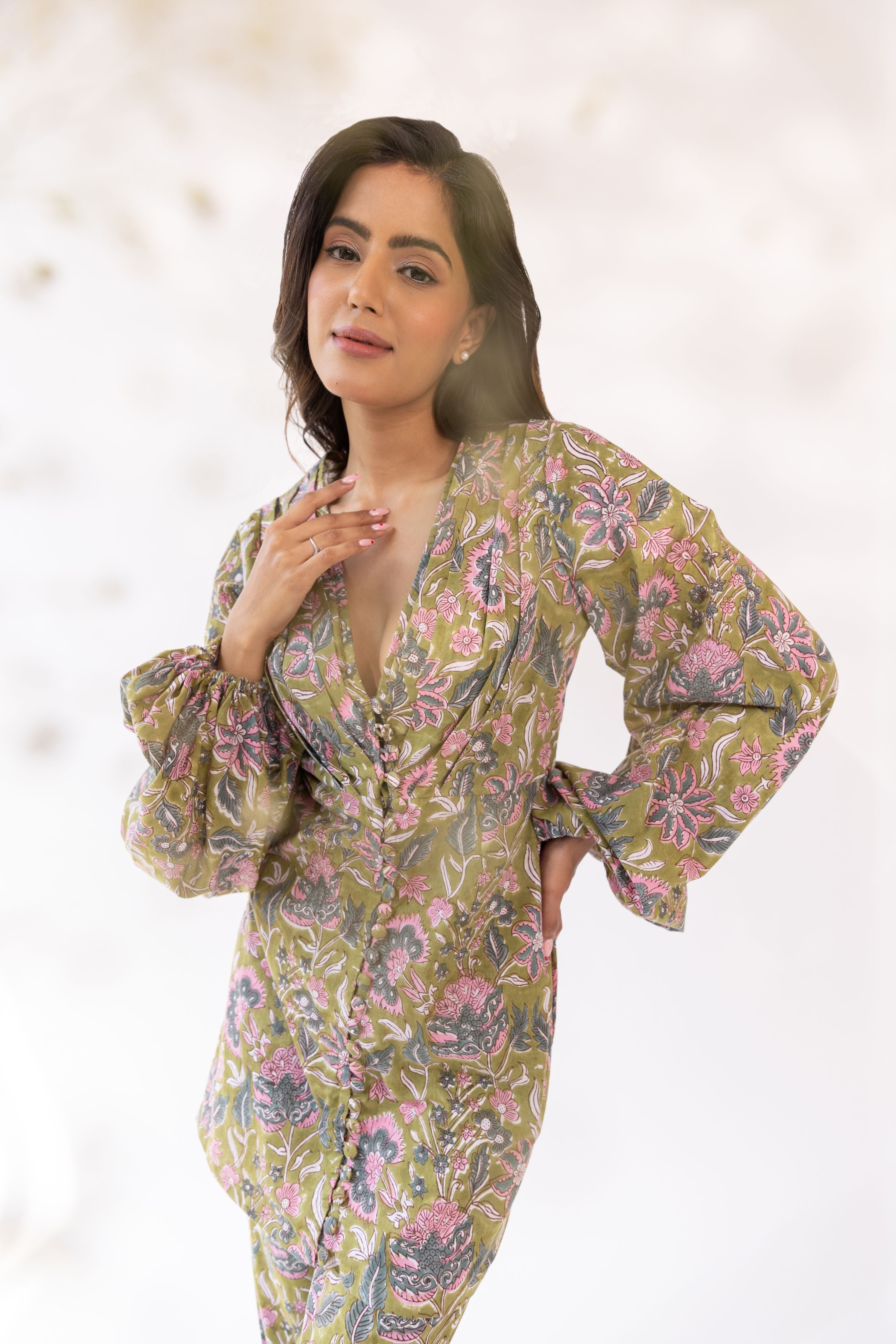 Featuring olive block printed v neck kurta set in cotton blend base detailed front button closure, fitted silhouette. It is paired with matching pants and dupatta.