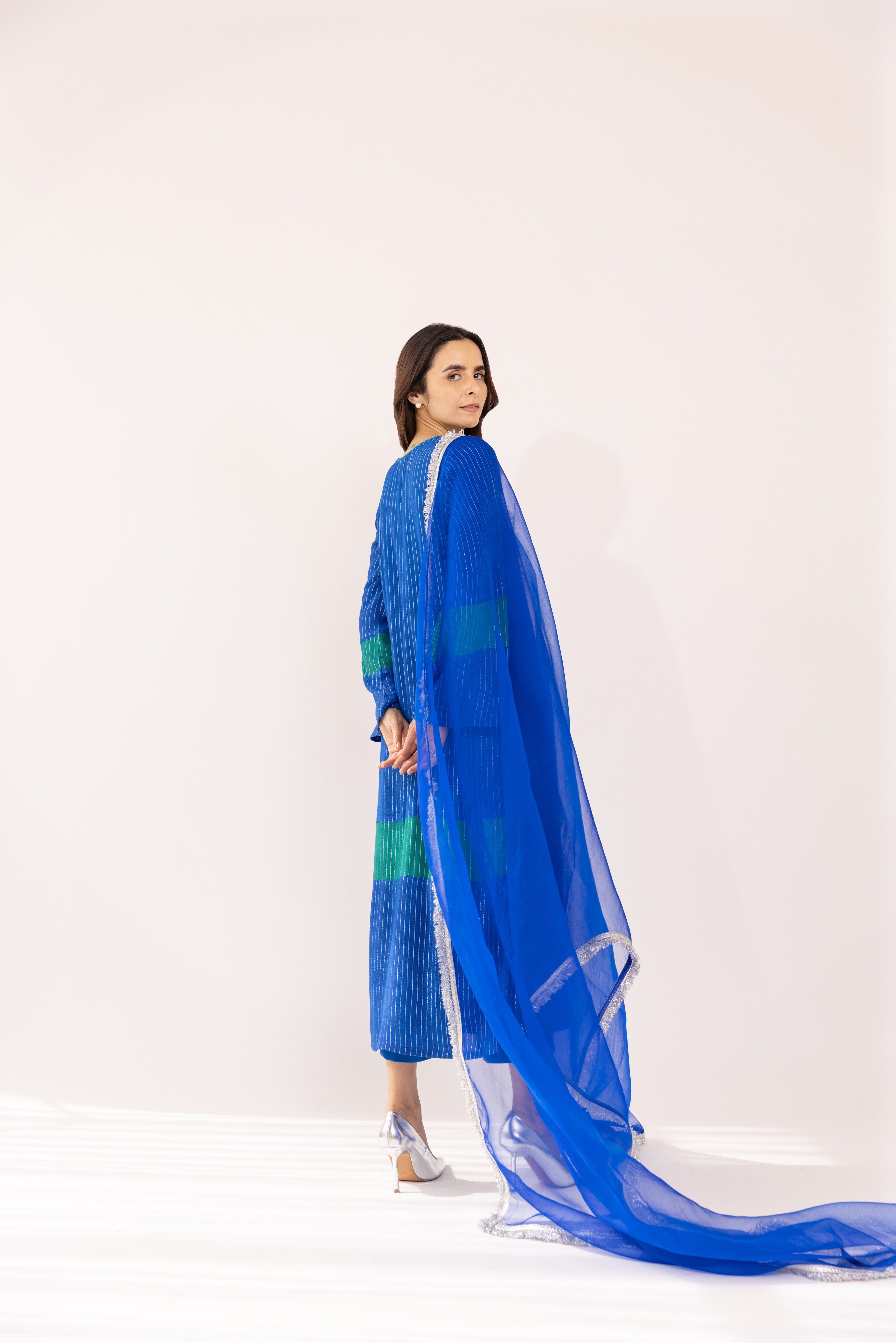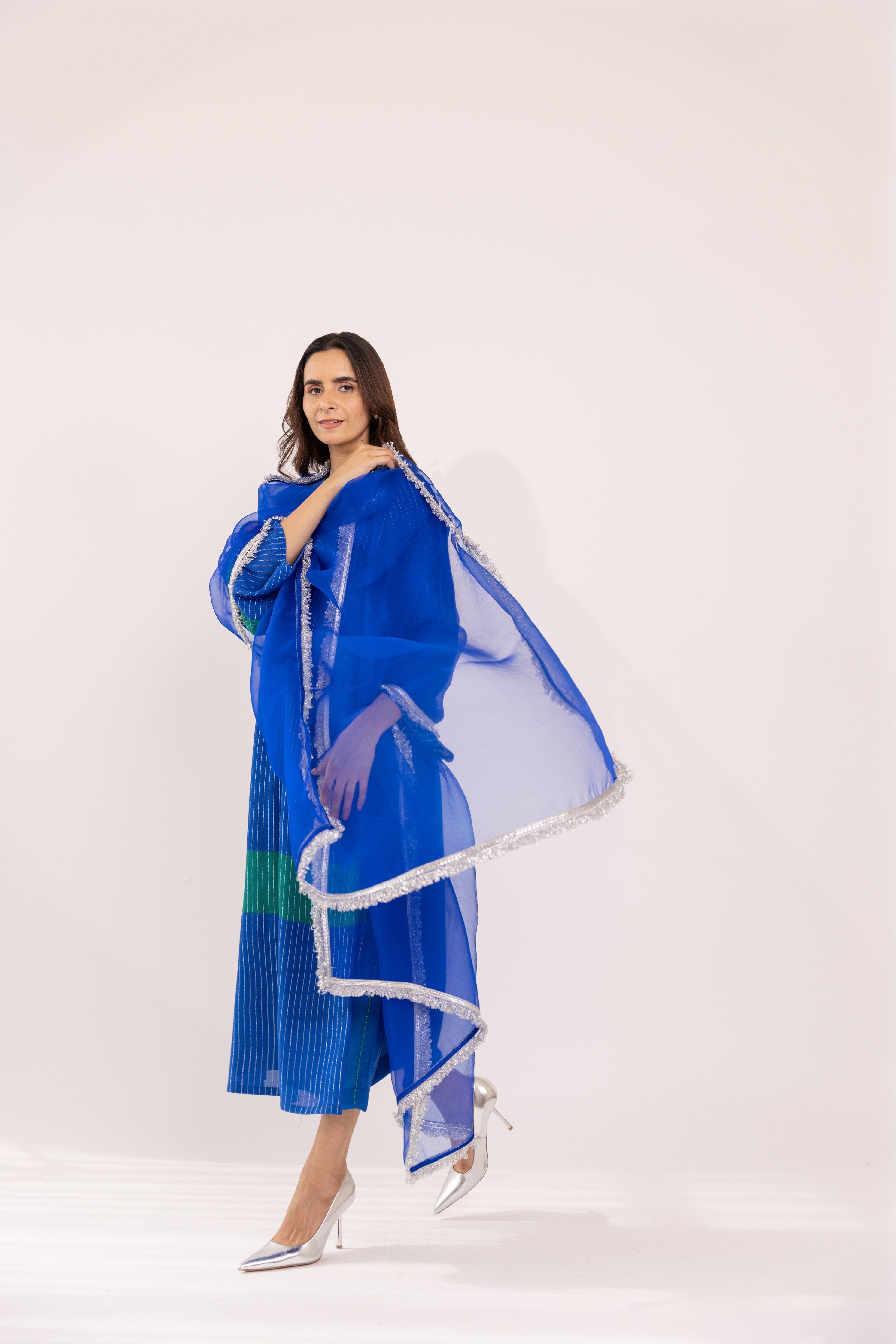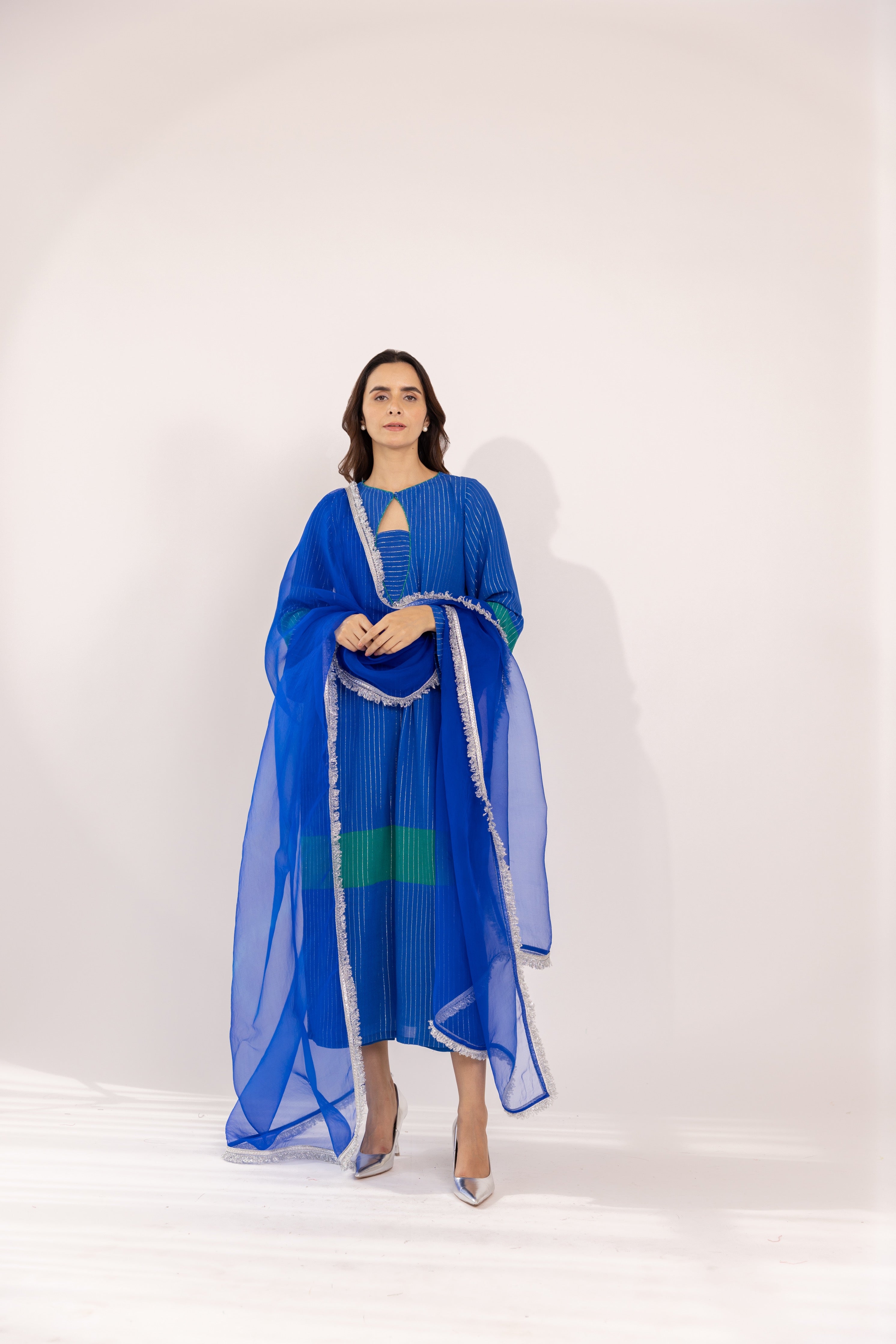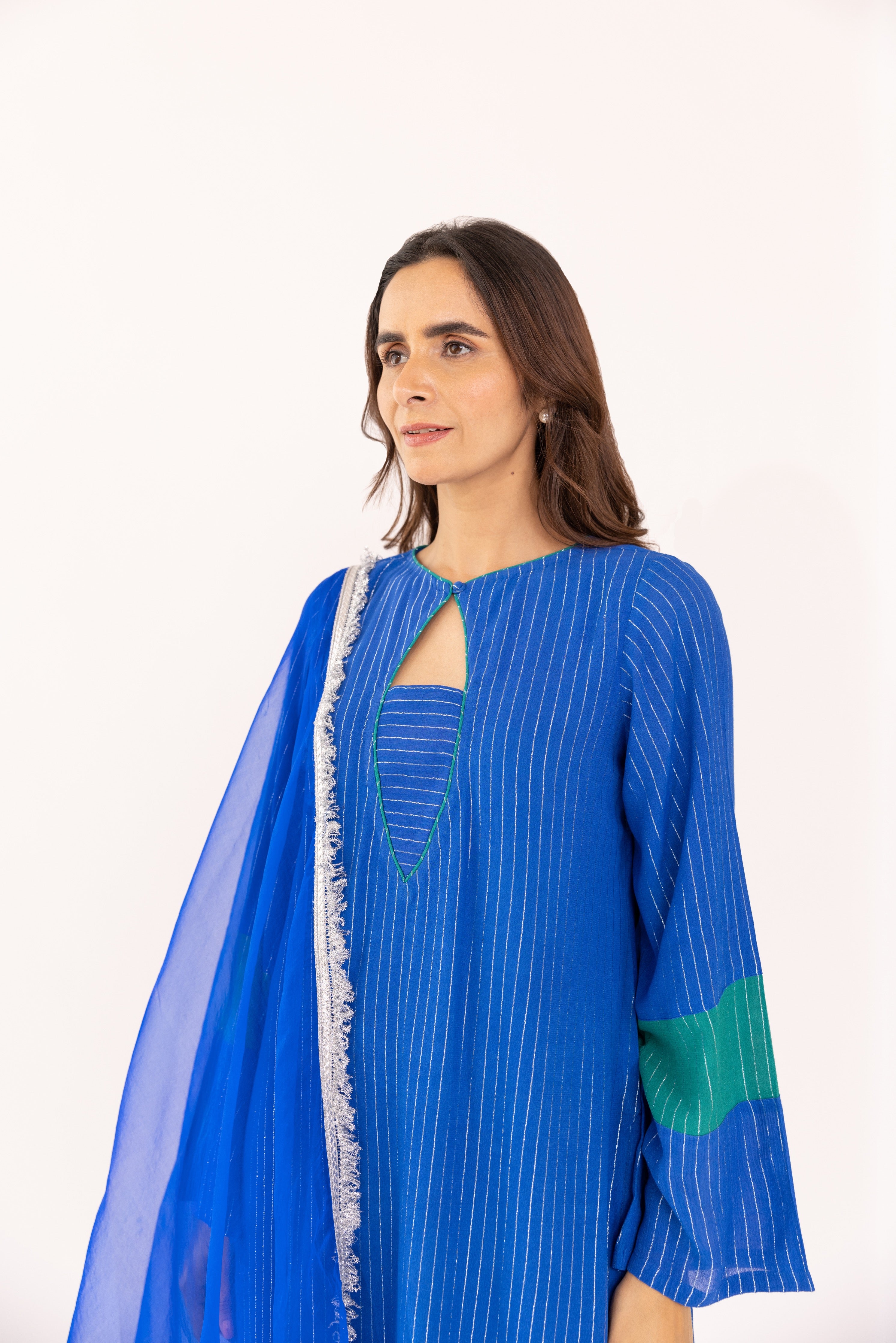 Featuring a royal blue lurex kurta set in cotton base. It is paired with matching pants and organza dupatta with lurex fringe lace.