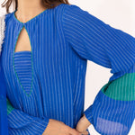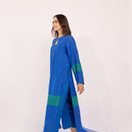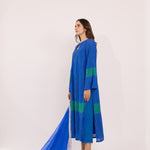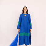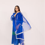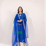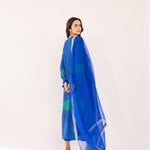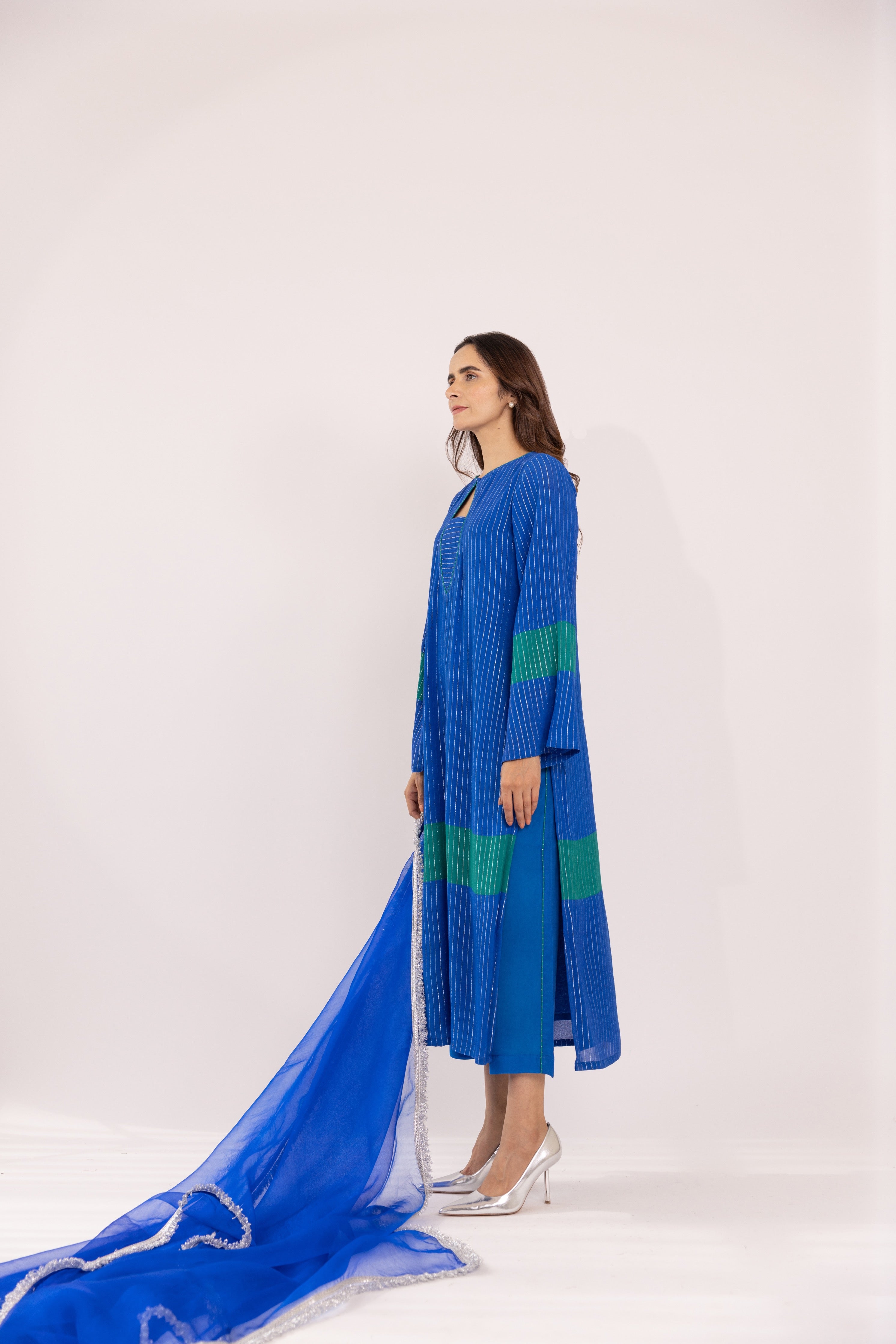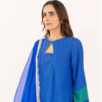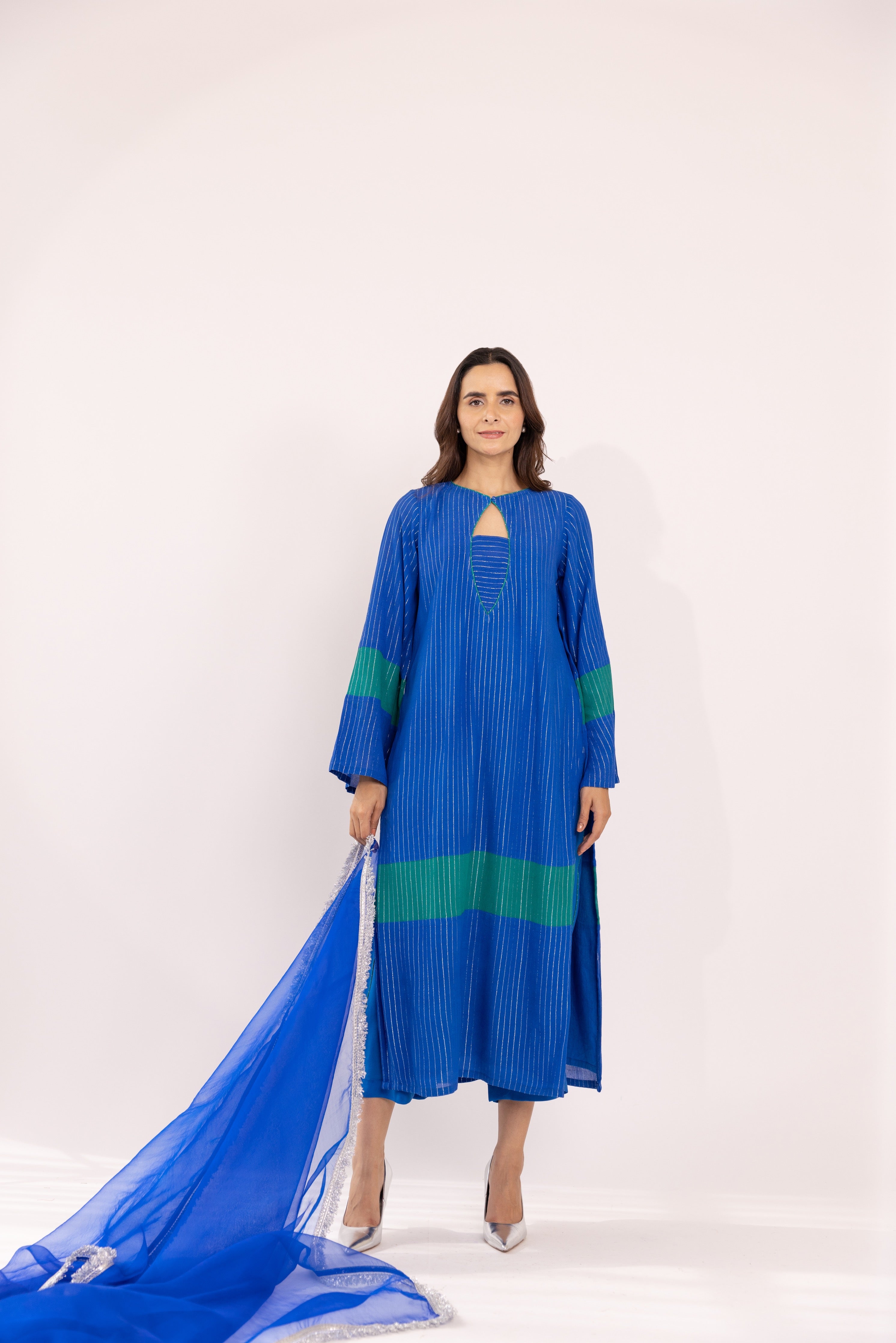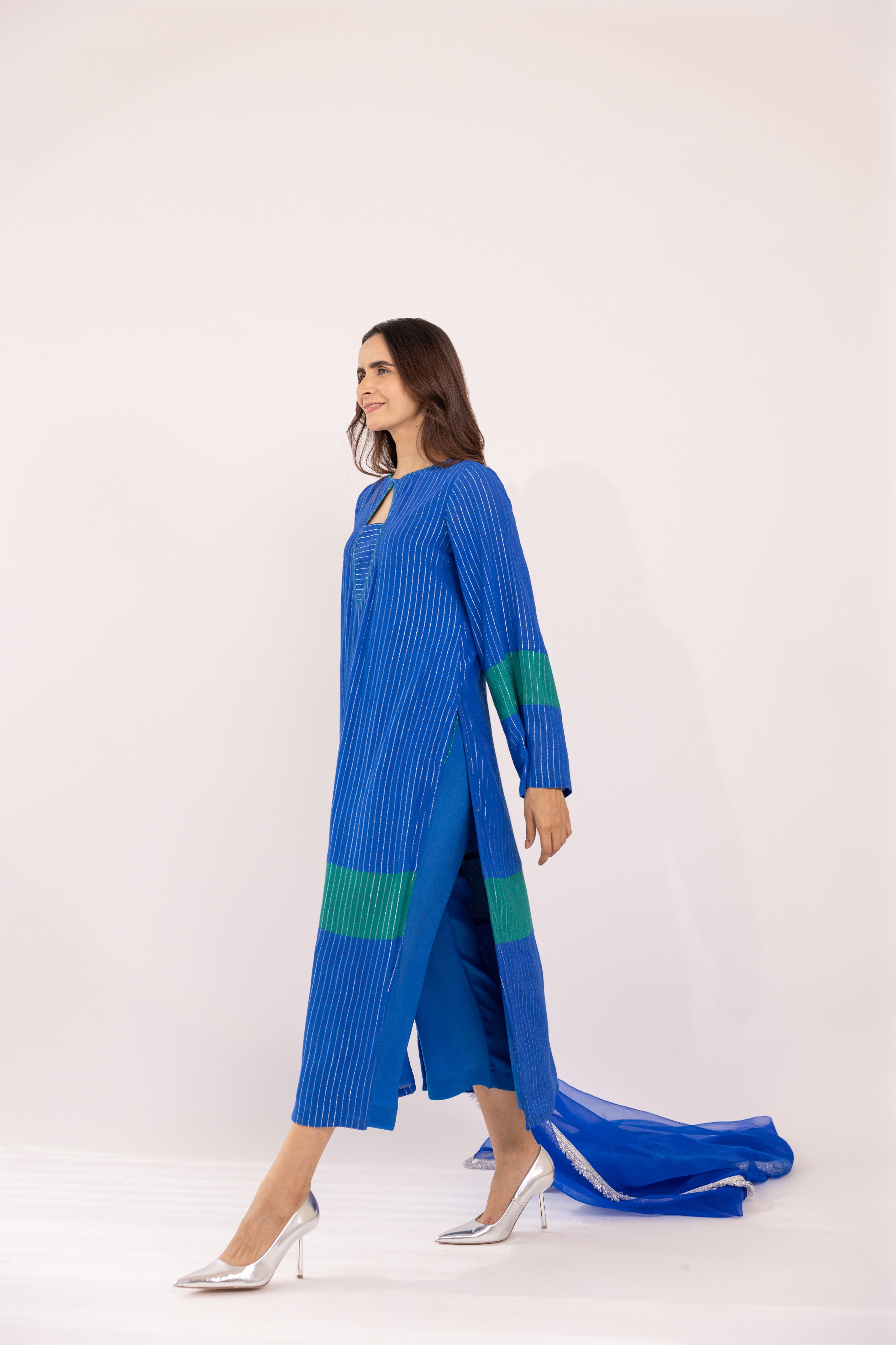 Featuring a royal blue lurex kurta set in cotton base. It is paired with matching pants and organza dupatta with lurex fringe lace.