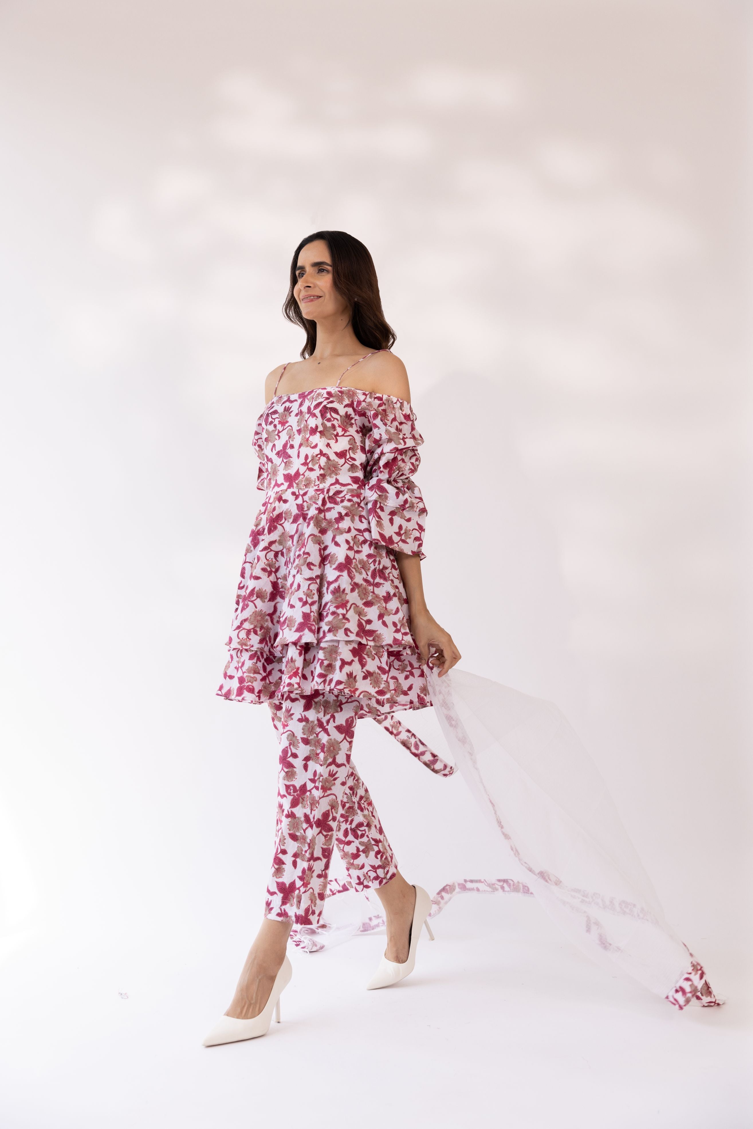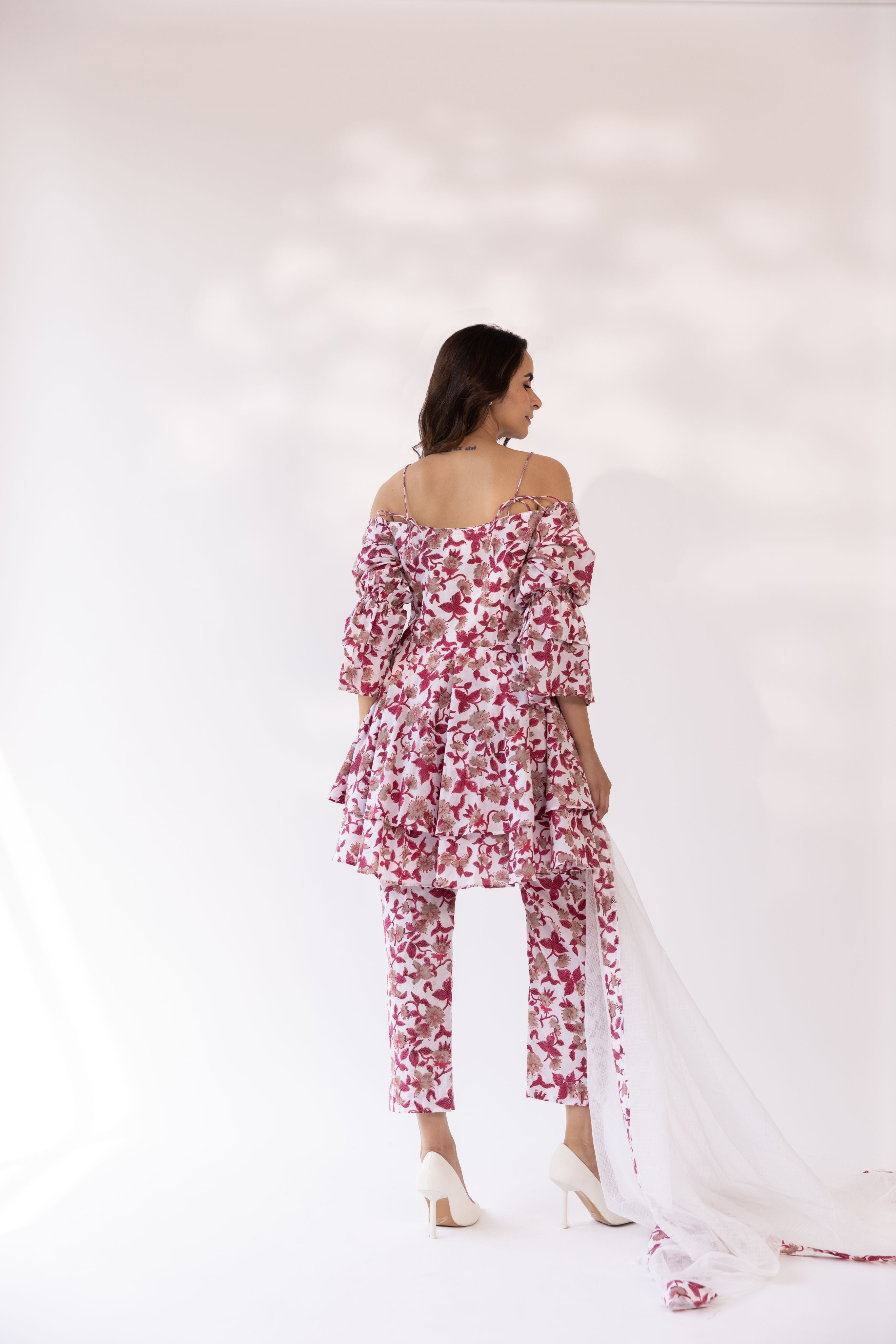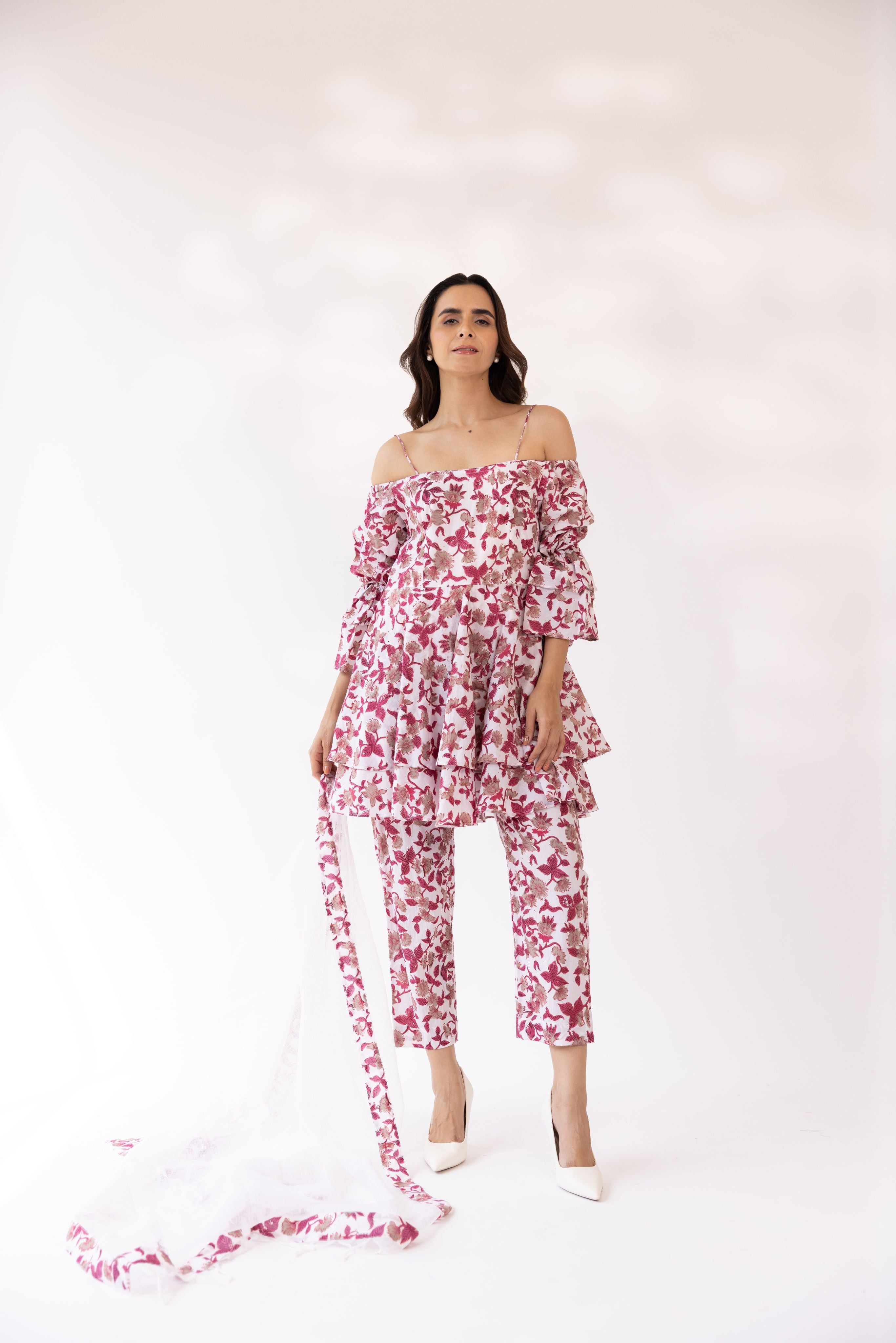 Featuring an off shoulder strappy kurta set with double a-lined flare in cotton blend base block print. It is paired with matching pants and dupatta detailed with printed edges.
