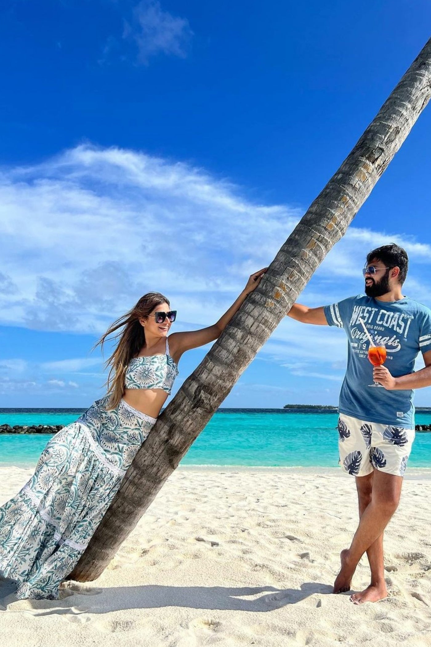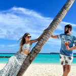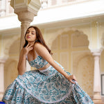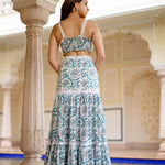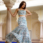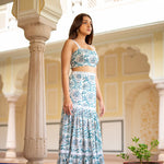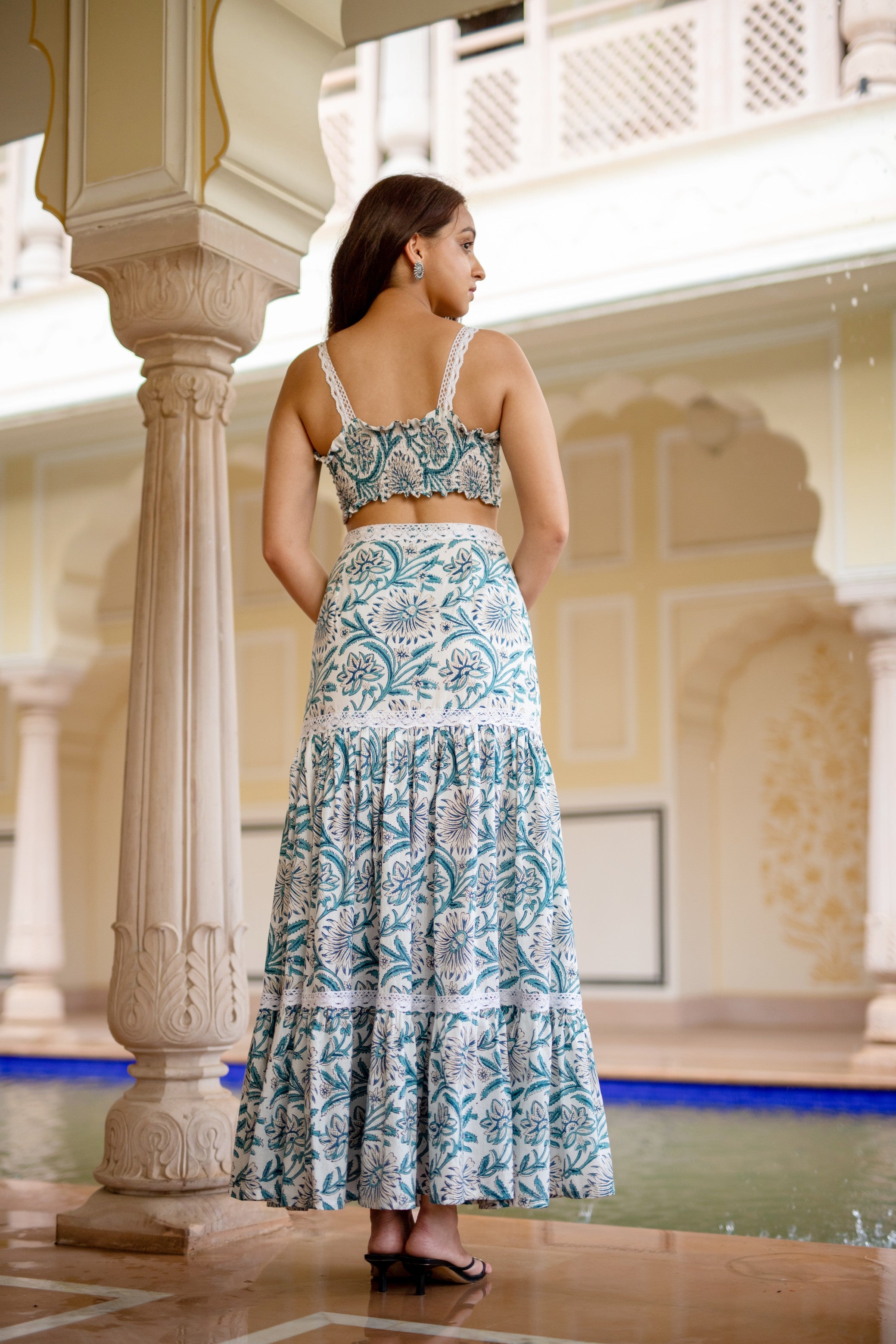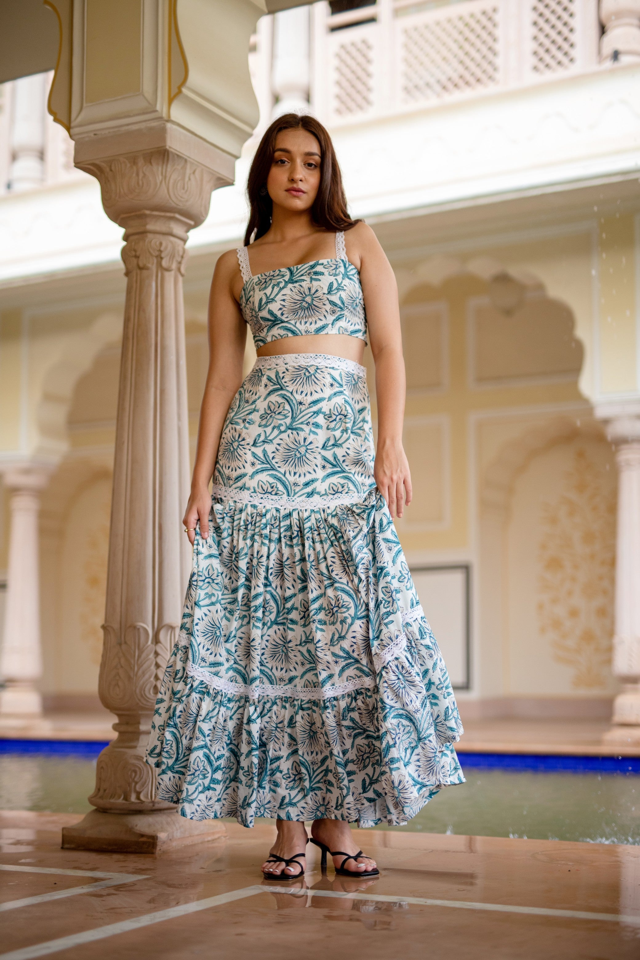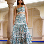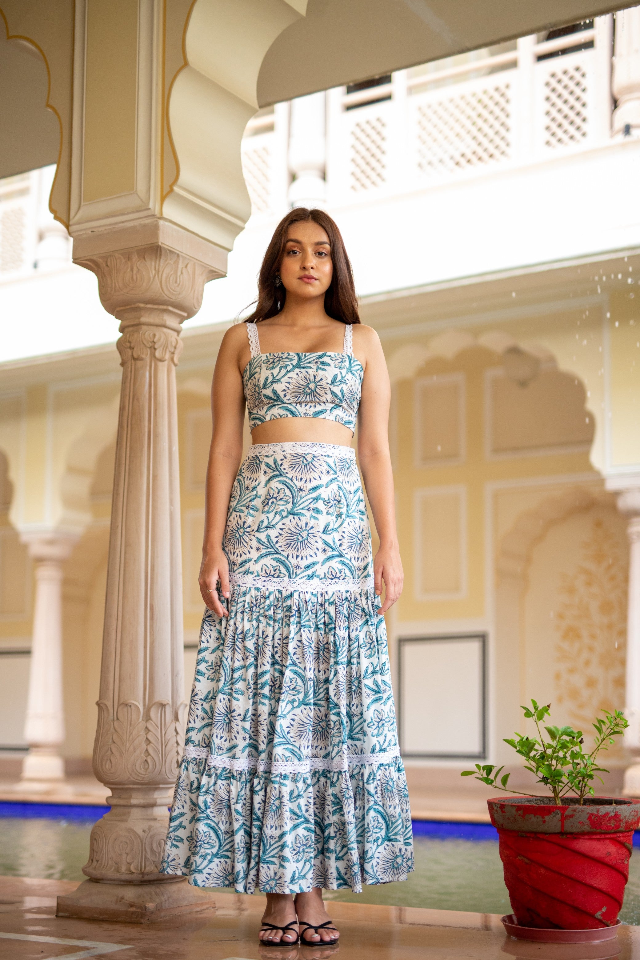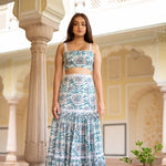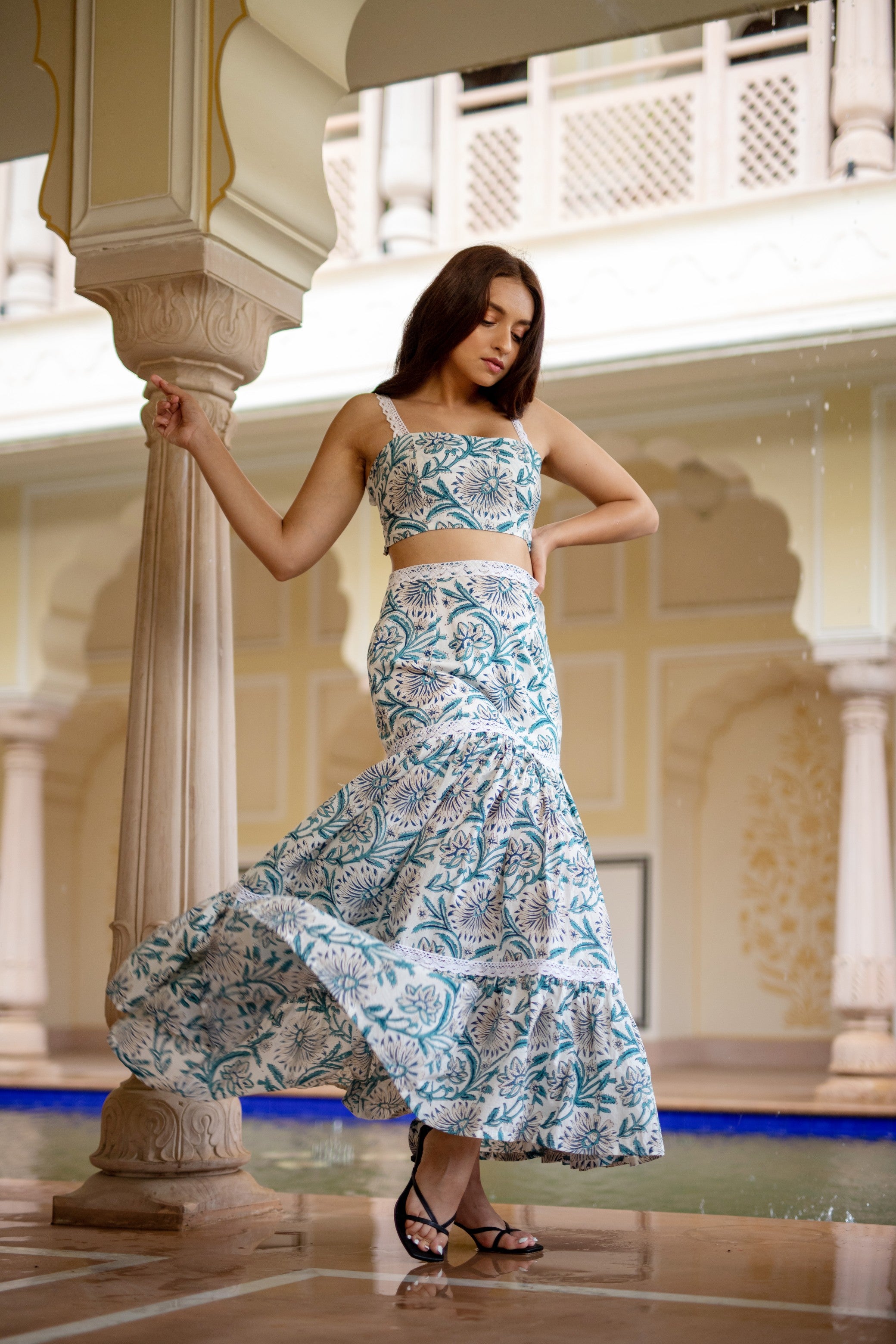 Featuring A Bustier Block Printed In Cotton Base, Paired With Tiered Midi Skirt.