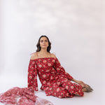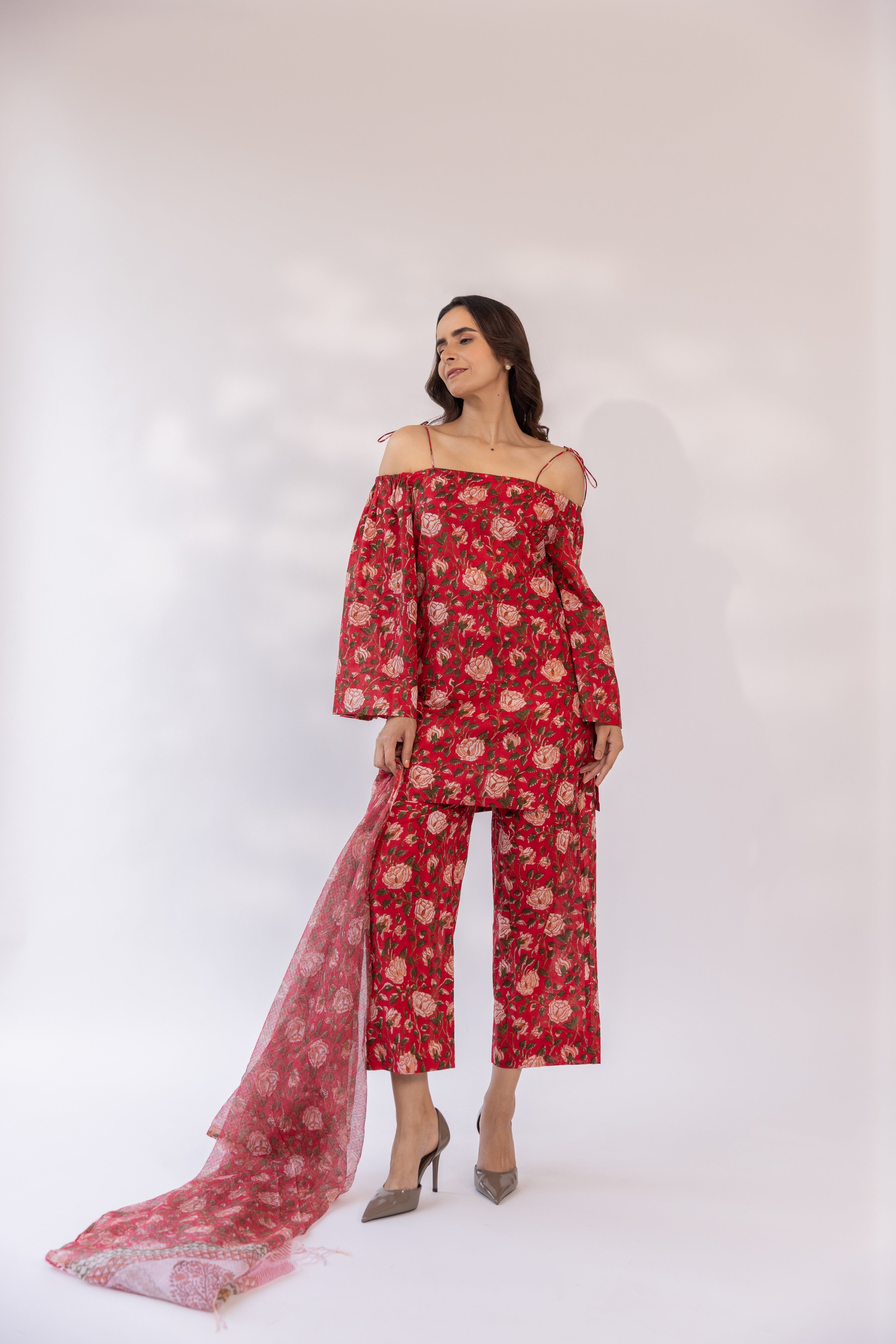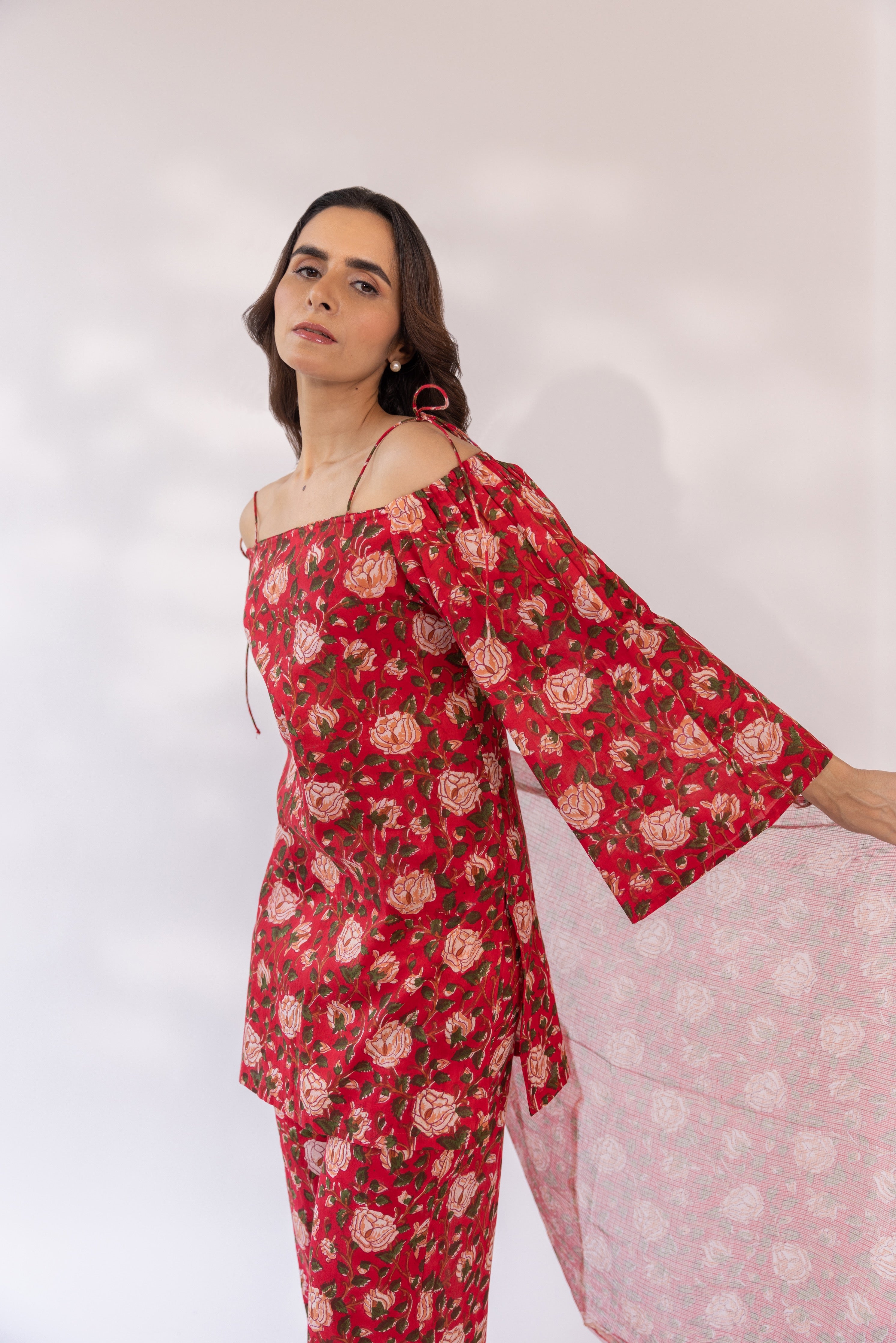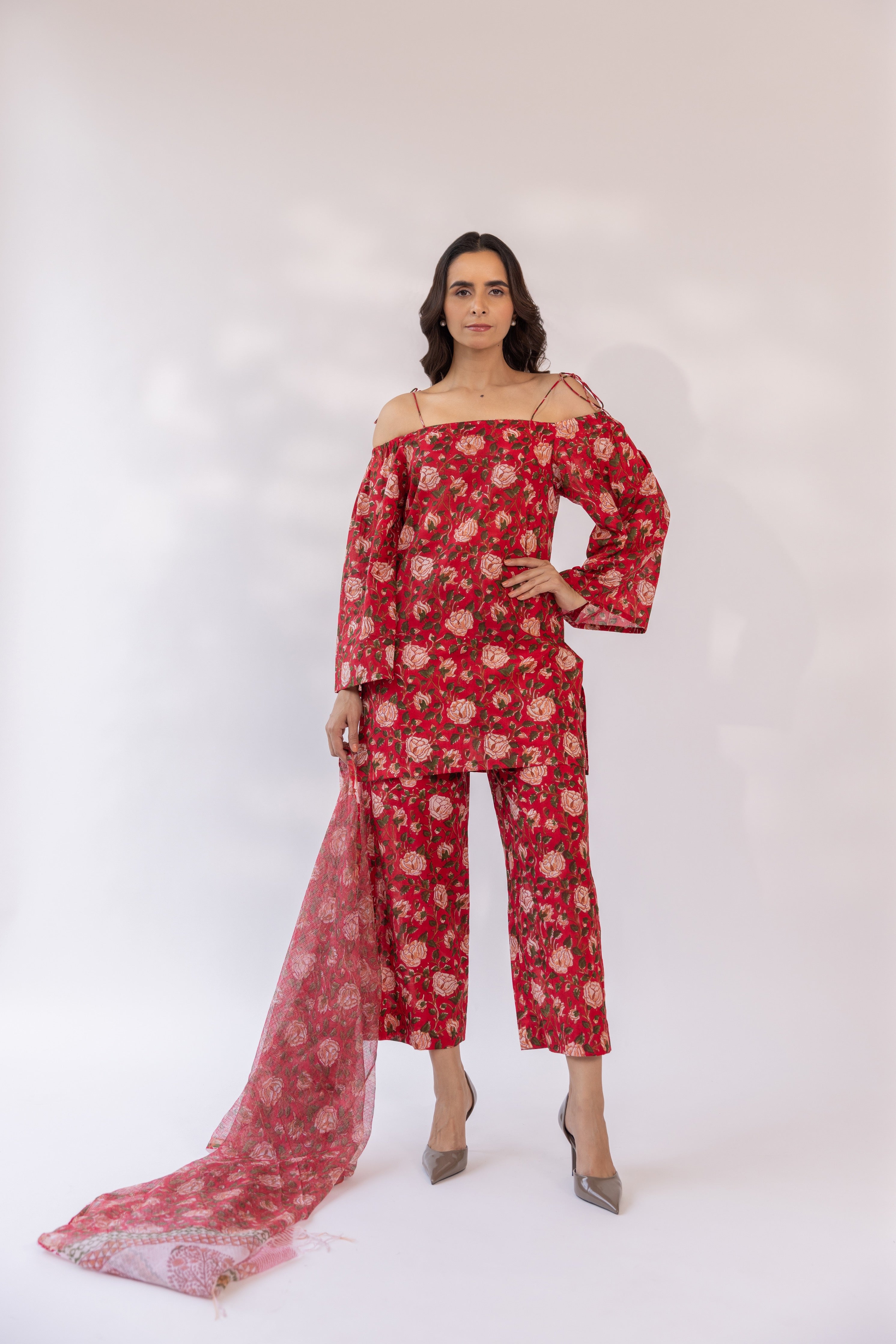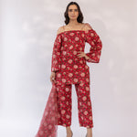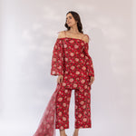 Featuring a red block printed off shoulder kurta set, paired with straight fit pants and cottadoria dupatta.
