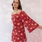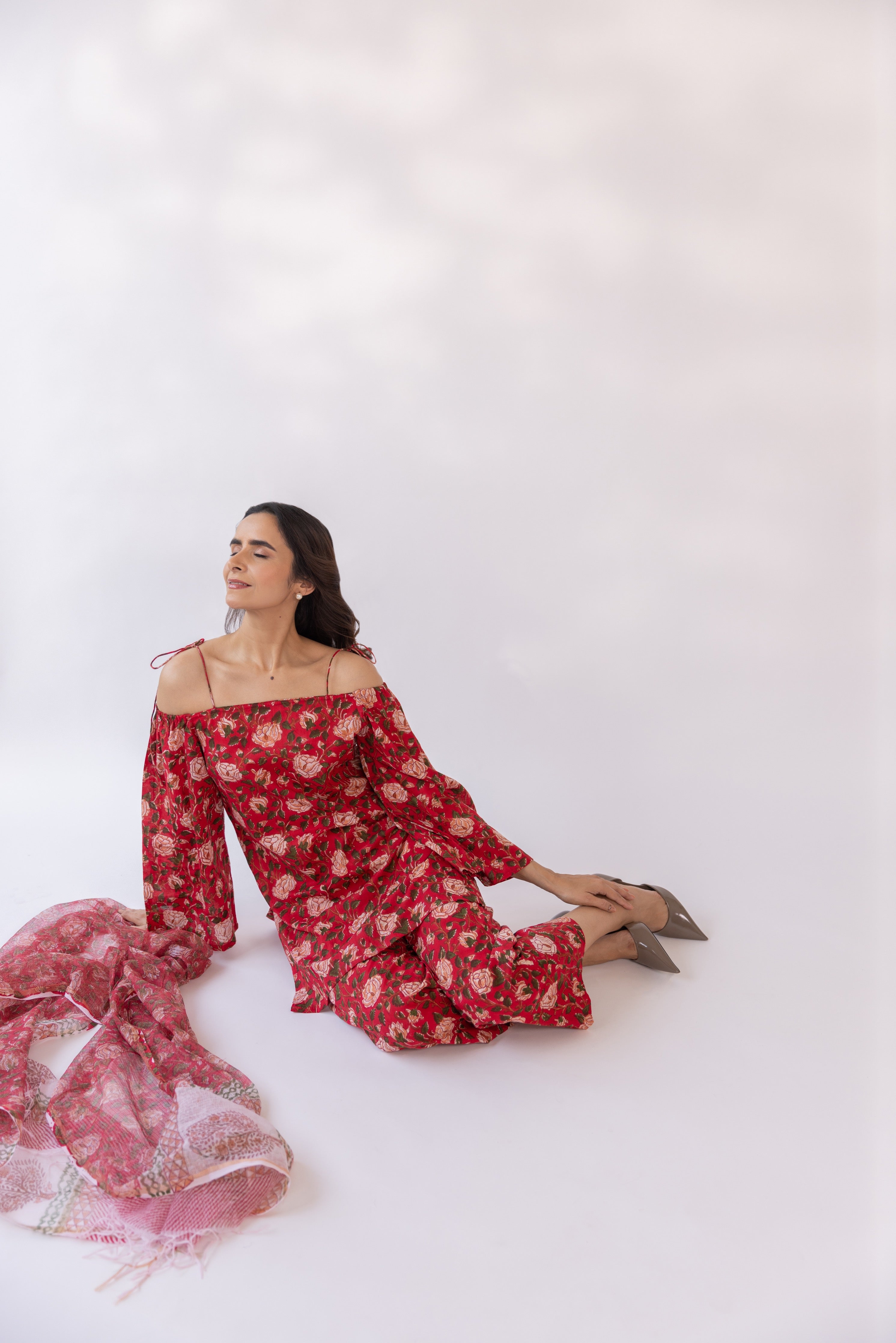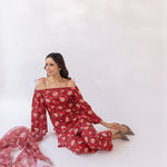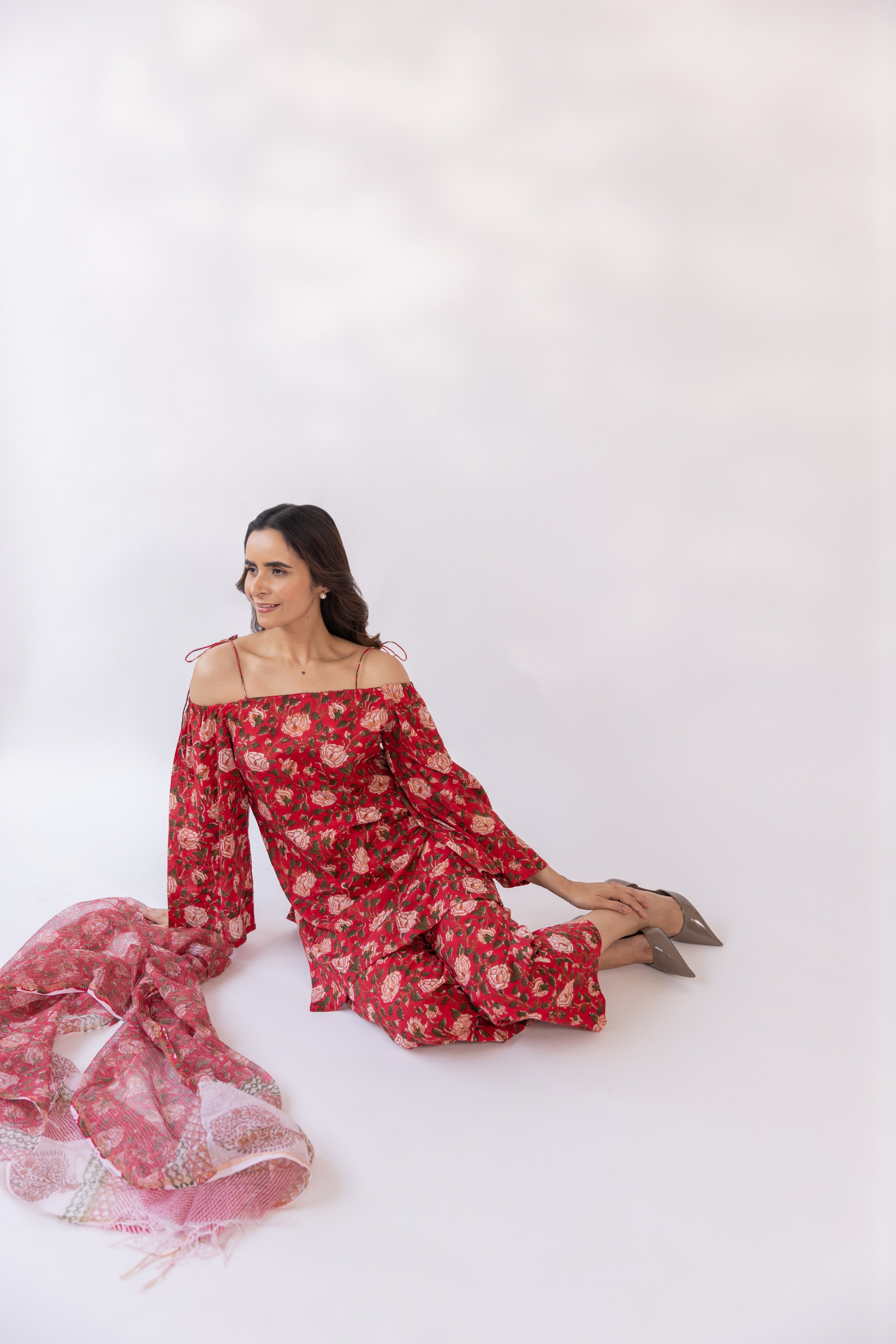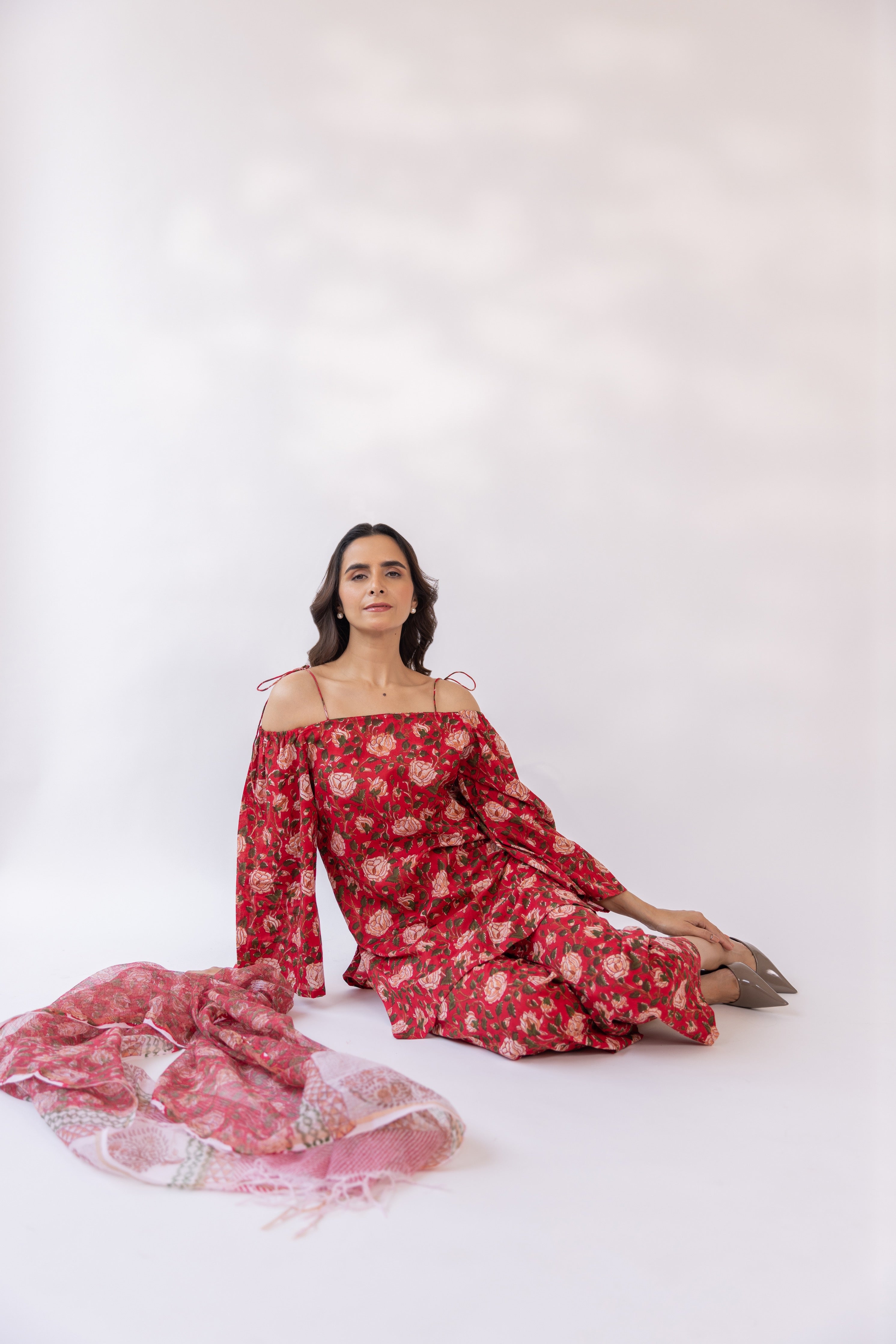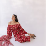 Featuring a red block printed off shoulder kurta set, paired with straight fit pants and cottadoria dupatta.